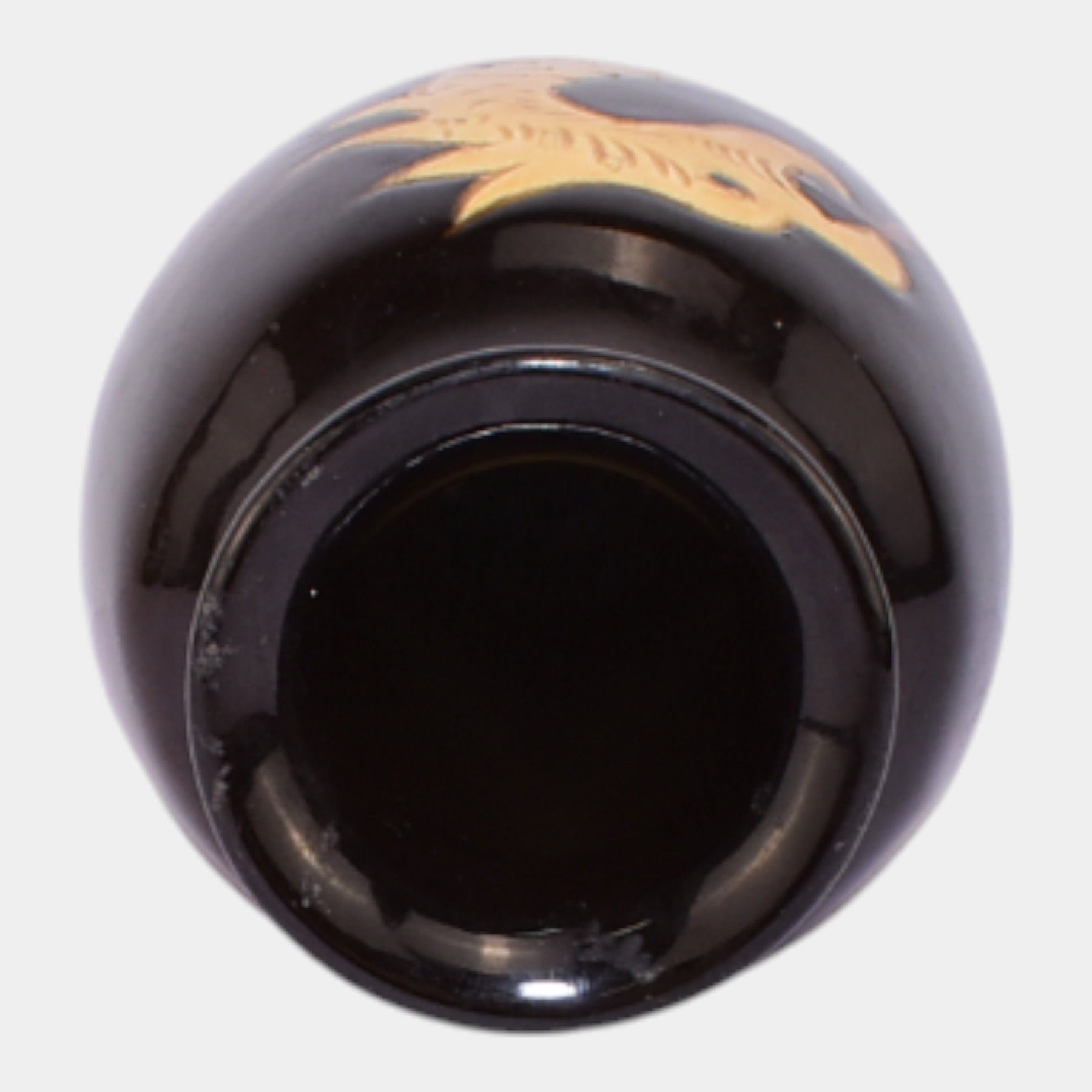 • Owens Pottery art pottery vase featuring a dramatic stylized dragon motif in golden ochre against a deep, glossy black ground. Elongated baluster form with flowing Art Nouveau–influenced decoration. A striking and uncommon decorative example from Owens’ figural output.