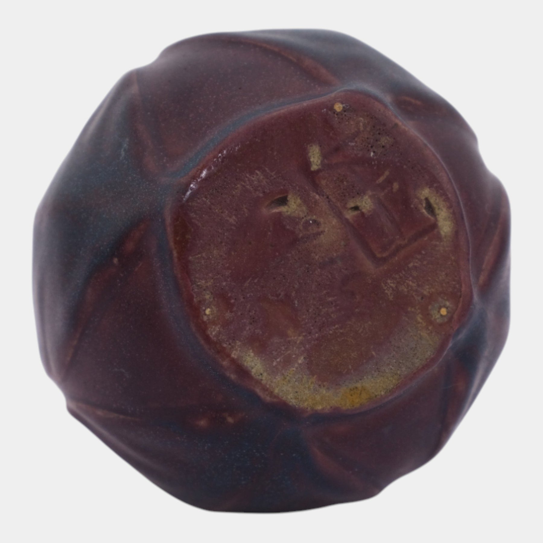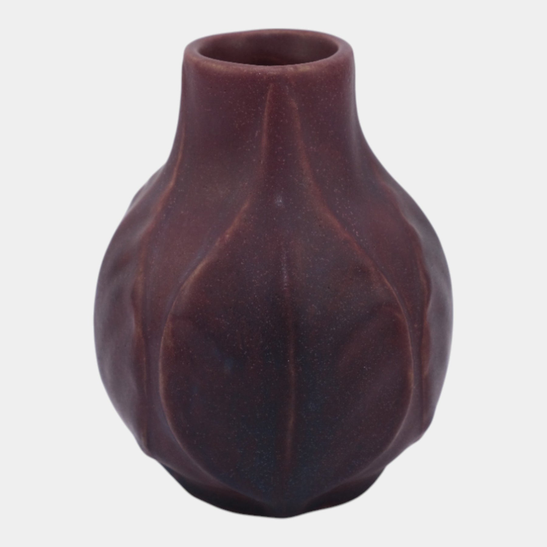 • Warmly sculptural and subtly organic, this Arts & Crafts–era Van Briggle vase features a softly faceted rounded form with vertical contours, finished in a rich matte mulberry glaze that accentuates depth, form, and hand-crafted character.