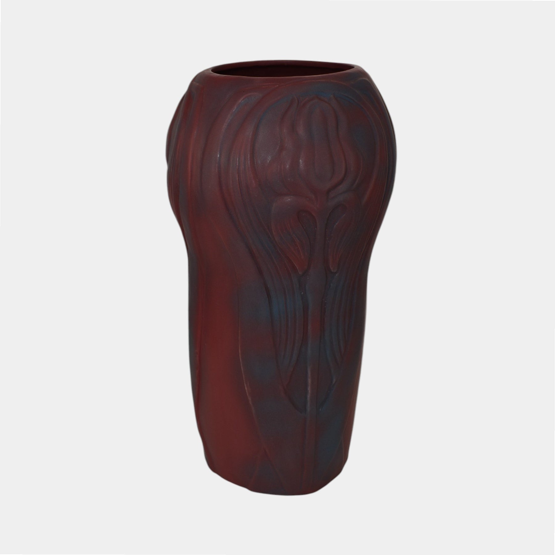 • Impressive arts and crafts stylized iris vase with supeiror mold and mulberry color.