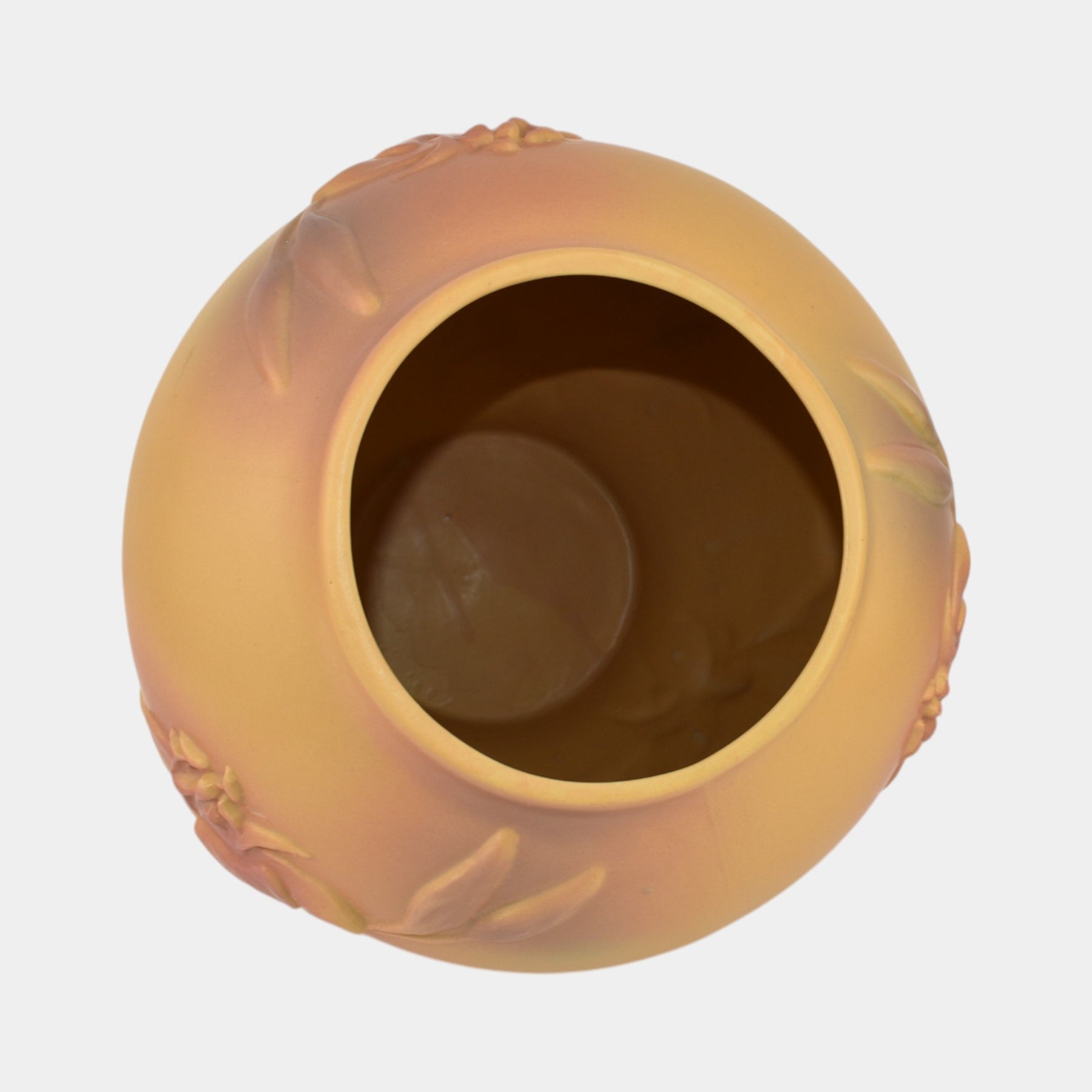 • Rarely seen, warmly glazed in yellow with soft pink undertones, this Van Briggle vase features delicate embossed floral designs, reflecting the studio’s enduring Arts and Crafts tradition.