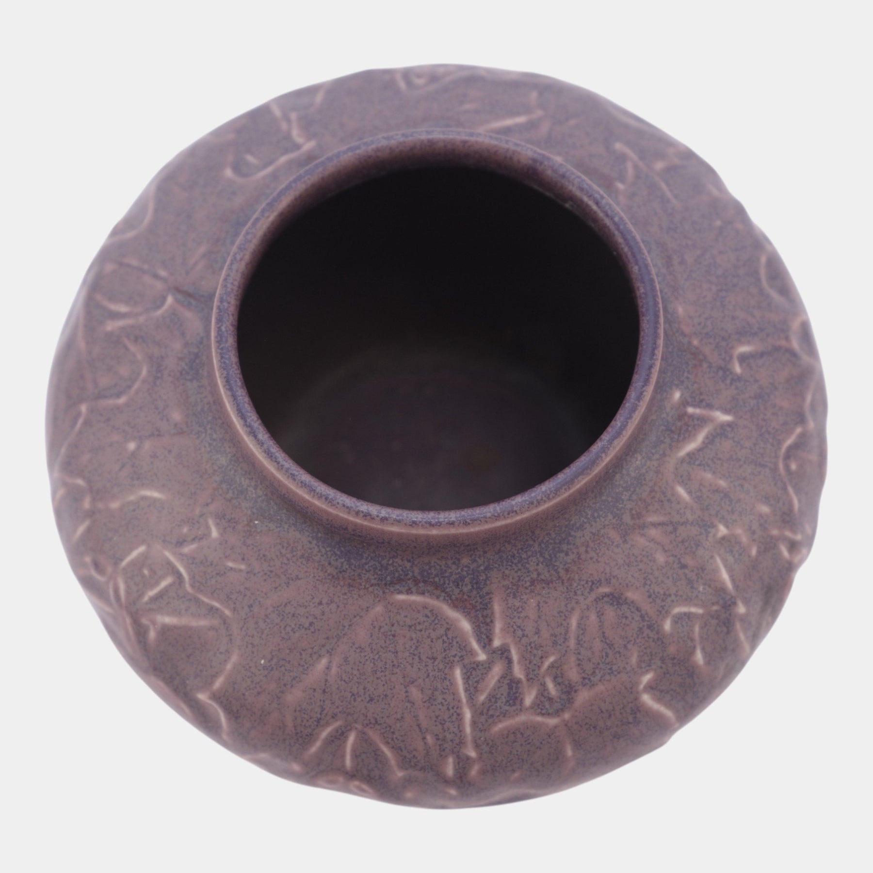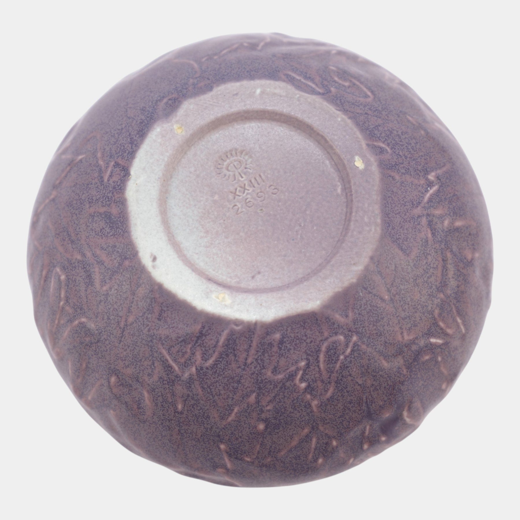 • Rookwood art pottery bowl in a soft matte purple glaze, decorated with stylized maple leaves and winged samaras in low relief. The wide, rounded form shows fine mottling, crisp detailing, and excellent overall condition.