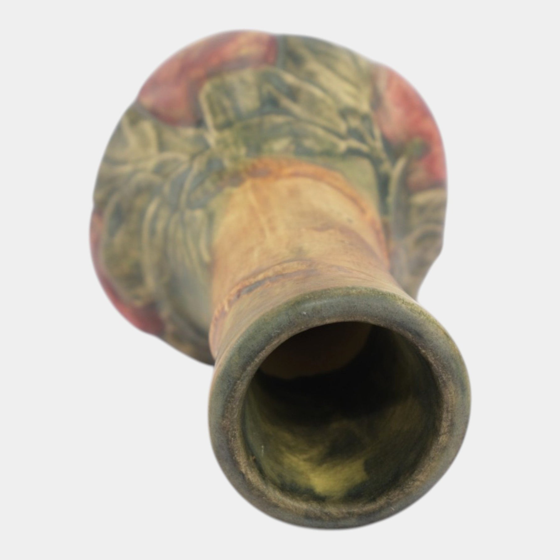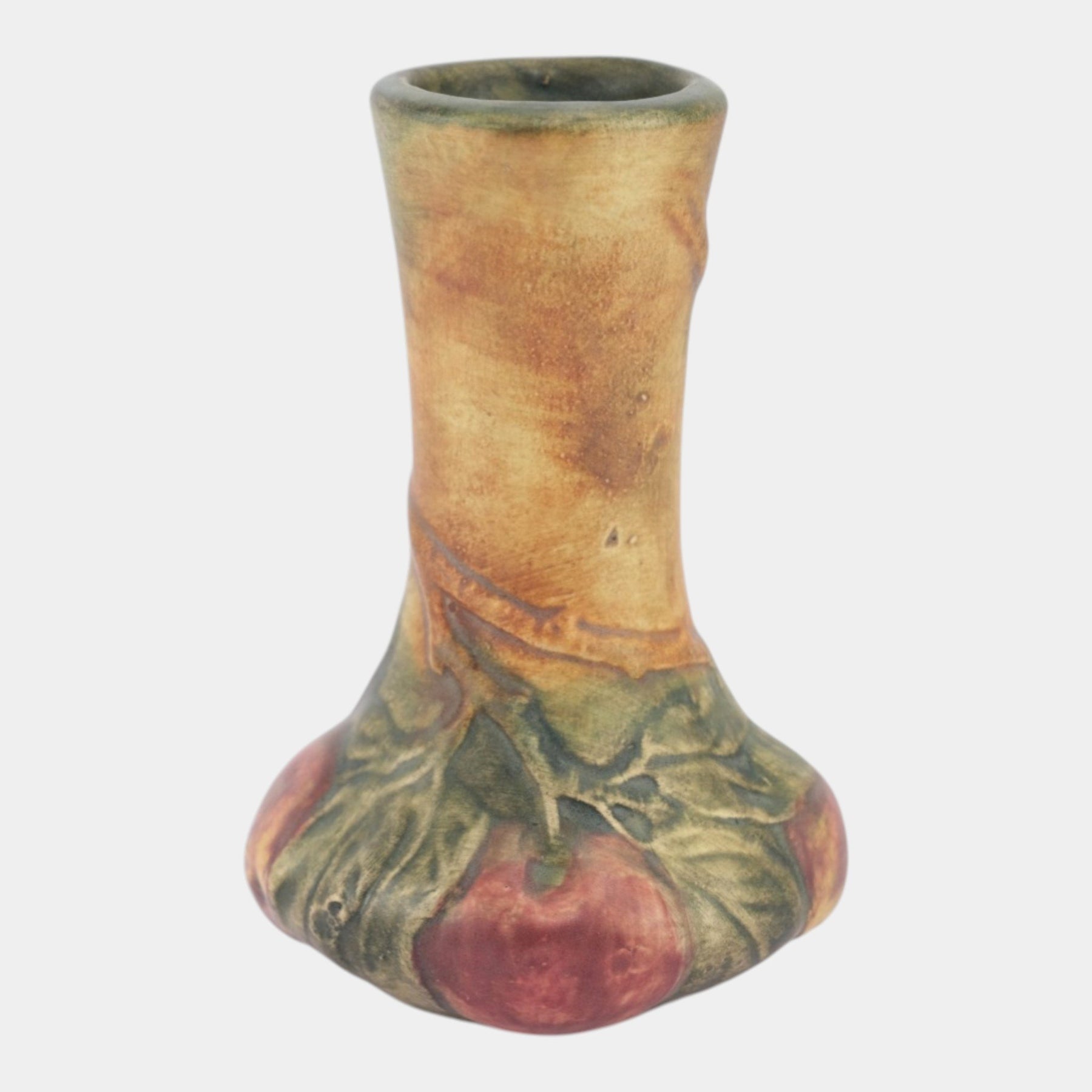 • Weller Baldin 1915-20 Vintage Art Pottery Brown Green Red Apple Ceramic Bud Vase