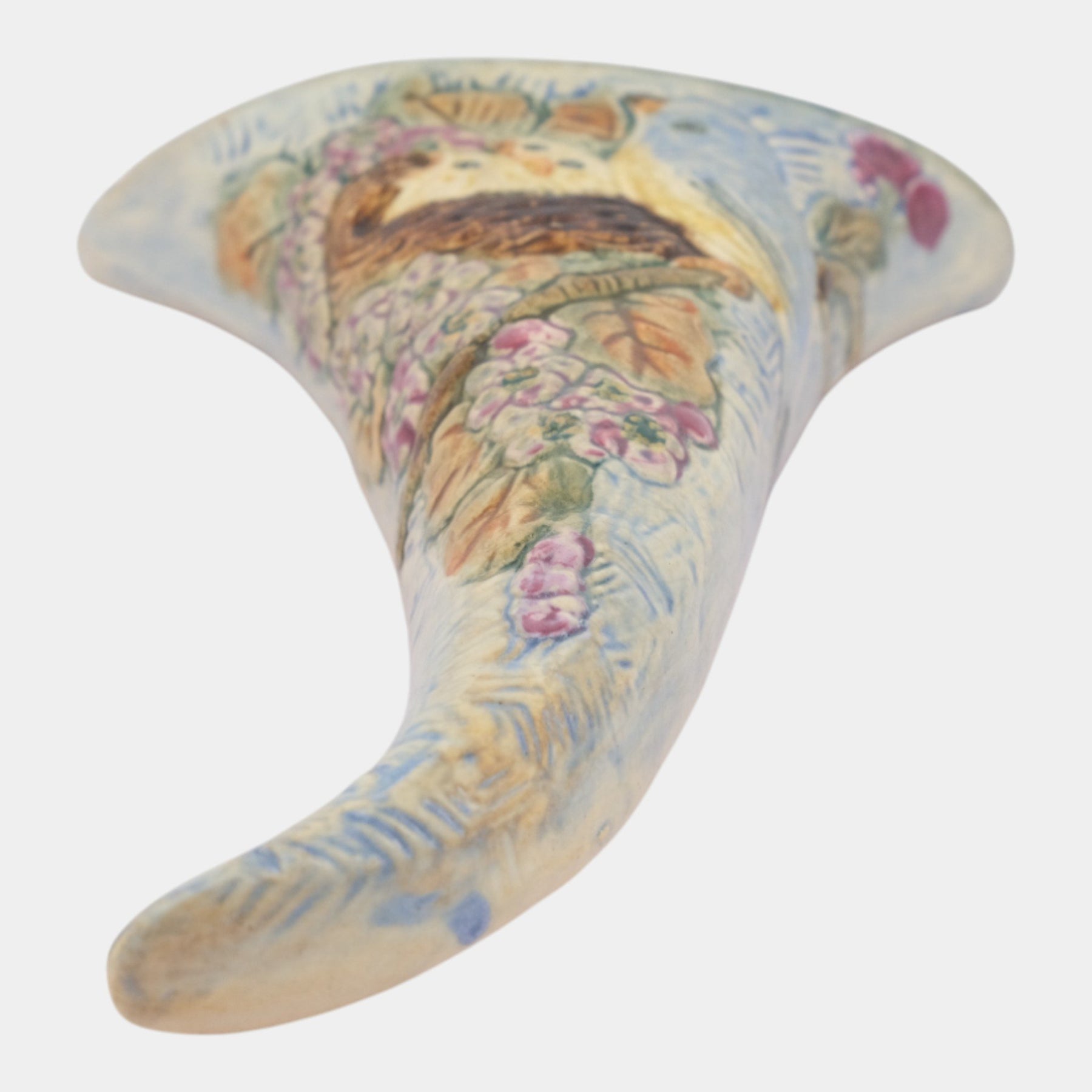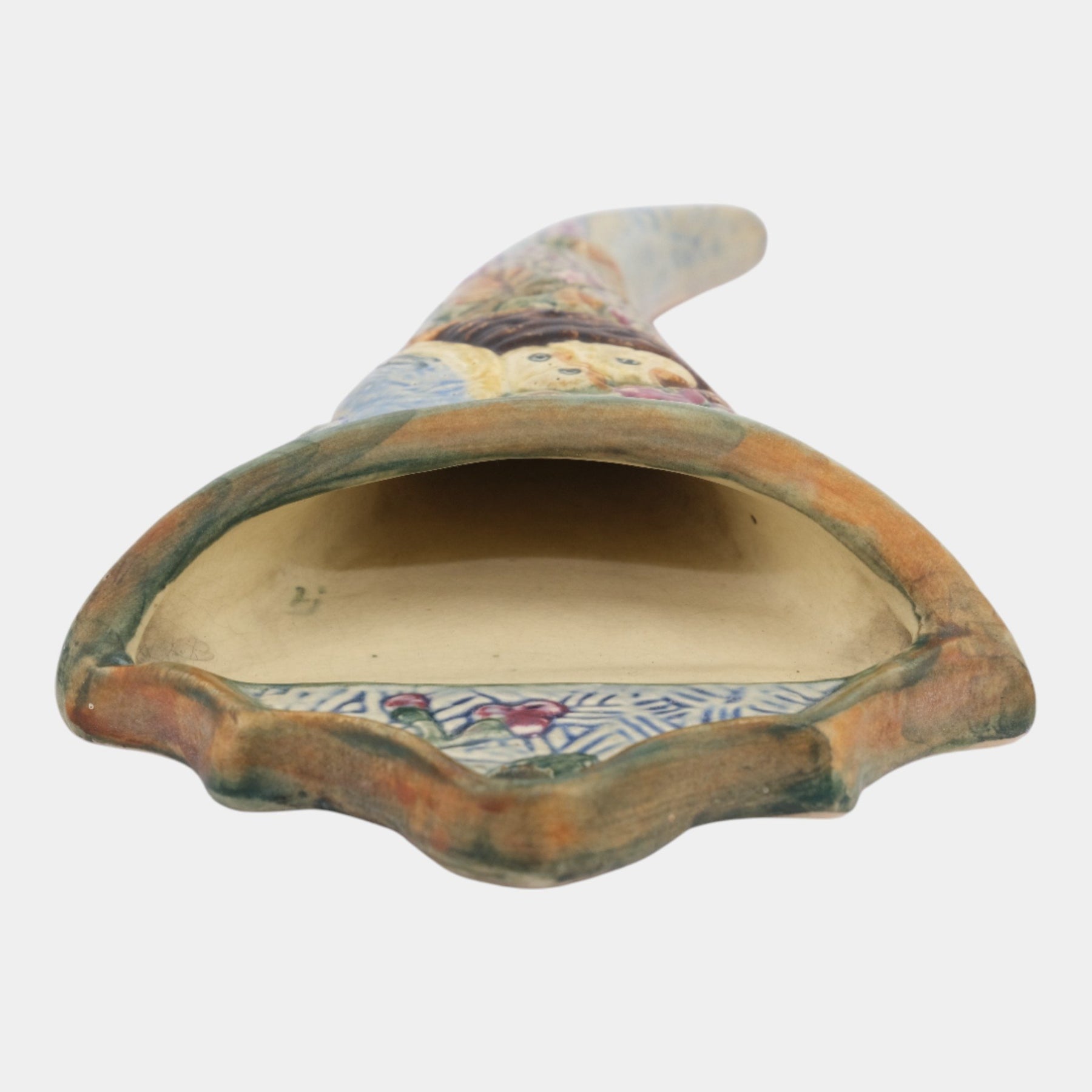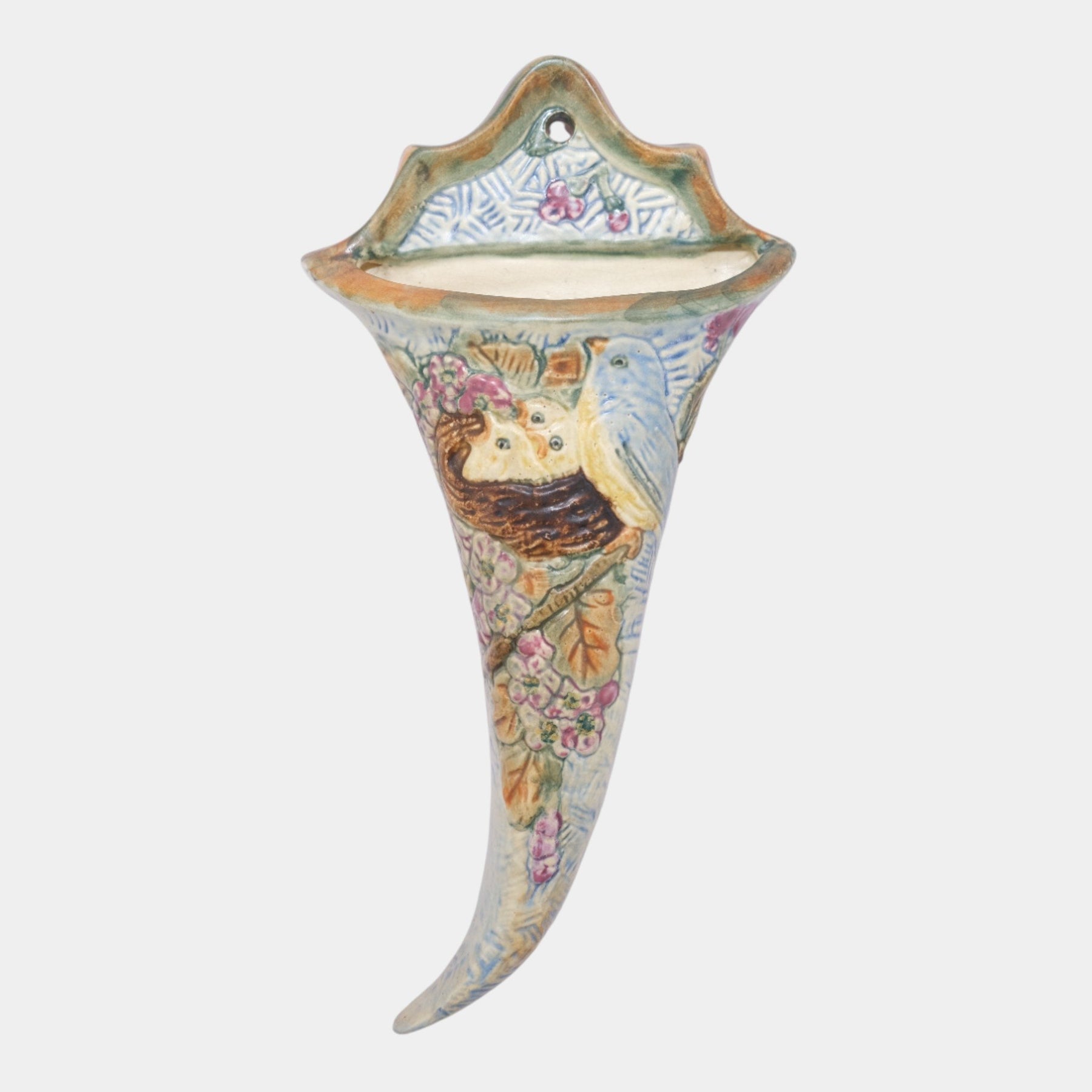 • Very decorative Weller Pottery Glendale wall pocket with three chicks and a mom bird that curves to the right. Super mold, color and glaze.