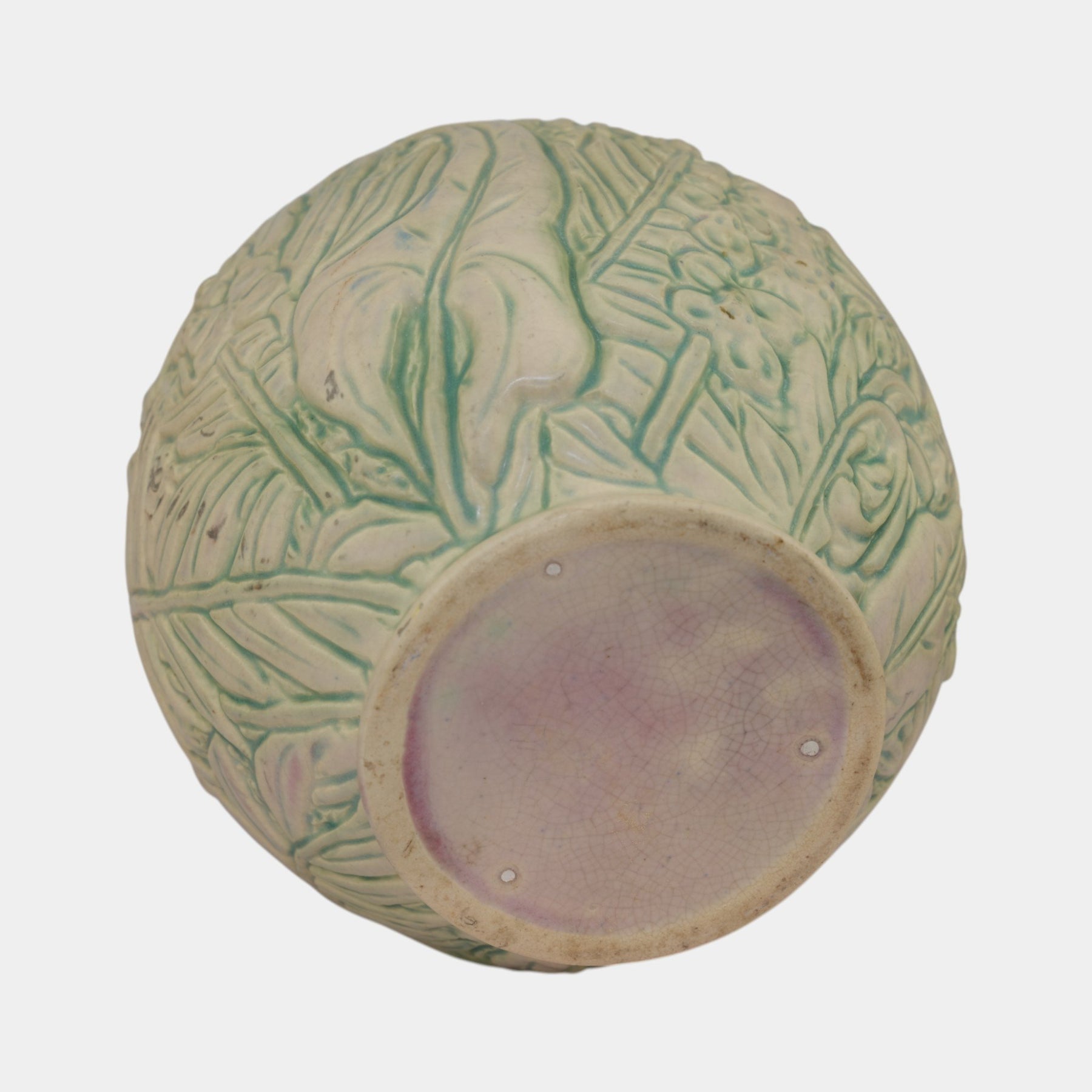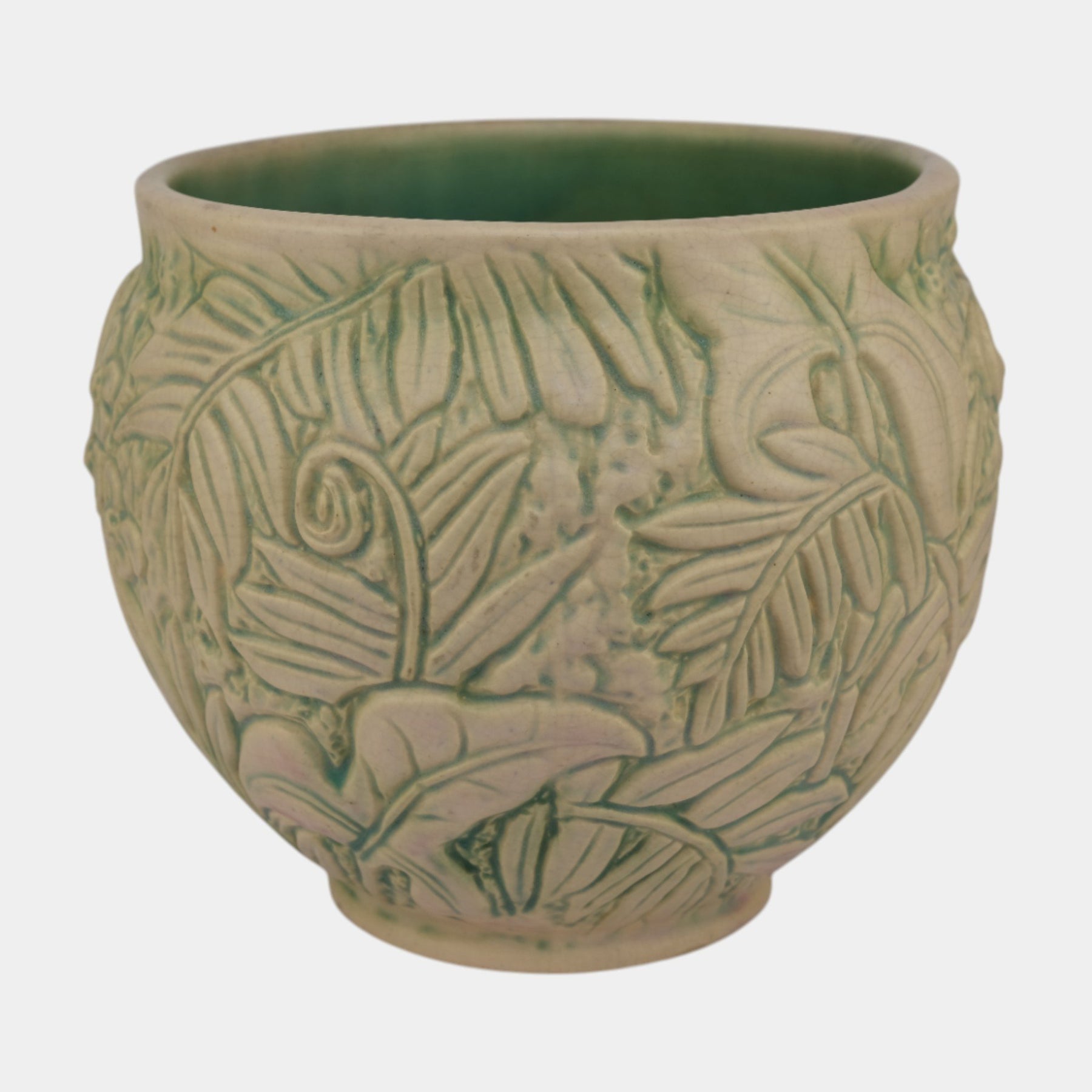 • A large and bold Weller Marvo jardiniere from the 1920s, decorated with richly textured, deeply incised foliage and large overlapping floral motifs, finished in a soft earthy glaze that highlights the raised design.
