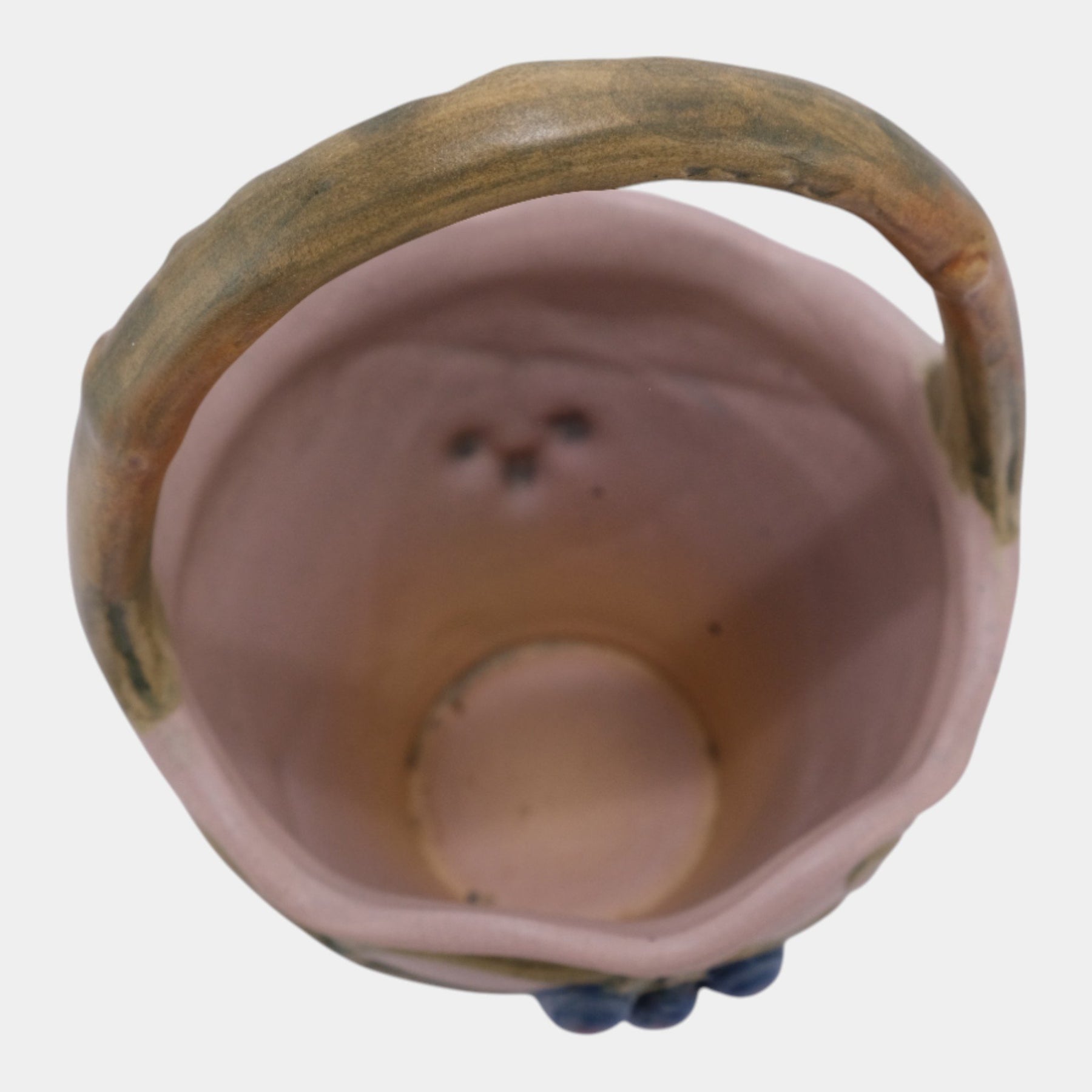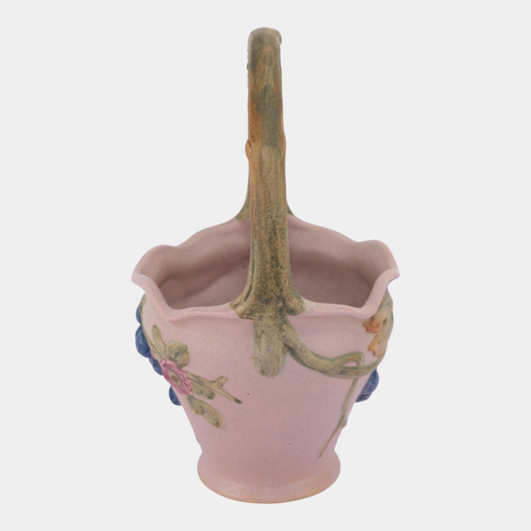 • Charming Weller Pottery Melrose basket dating to the 1920s, finished in a soft purple glaze with hand-painted floral and berry decorations. The form features a scalloped rim and a tall, mottled handle in warm naturalistic tones. A fine example of Weller’s Art Deco era craftsmanship, blending functionality with artistic detail, this vintage basket makes a delightful addition to any American art pottery collection.