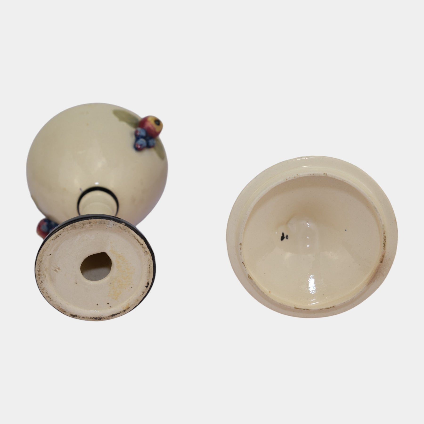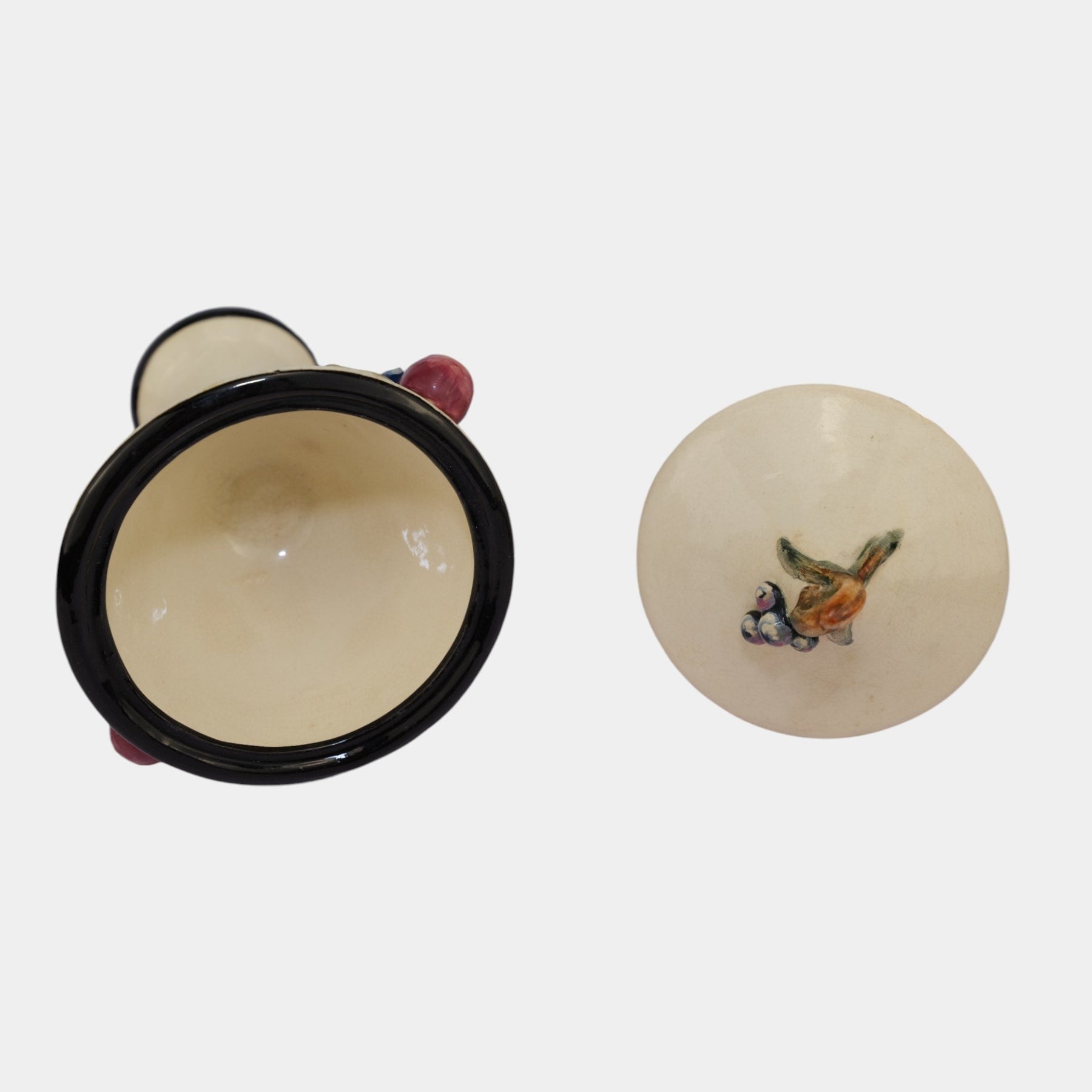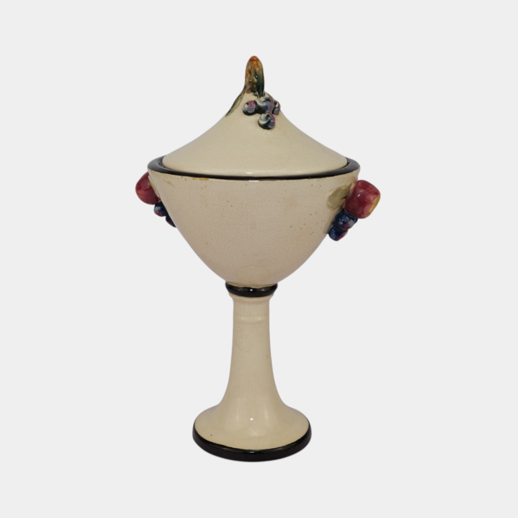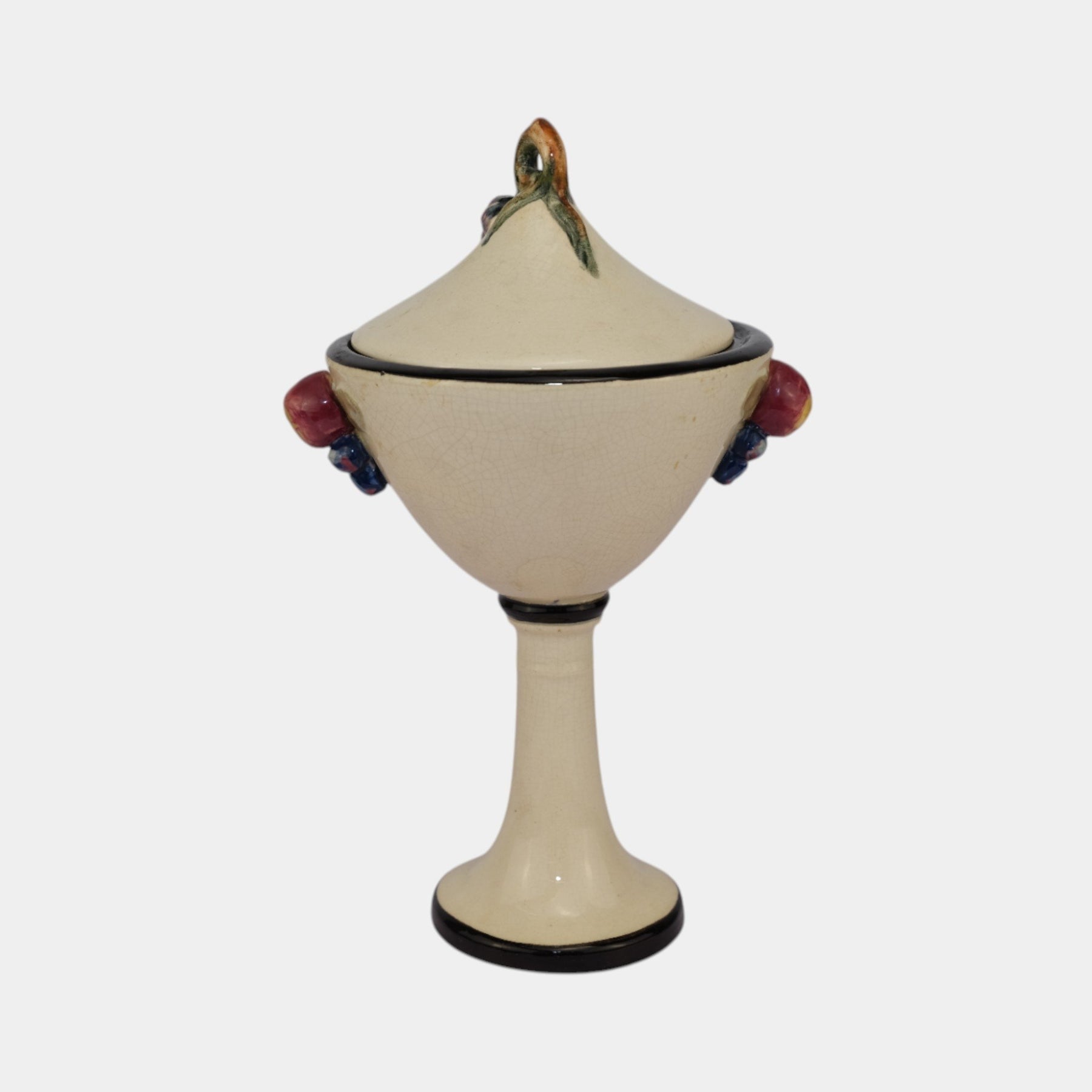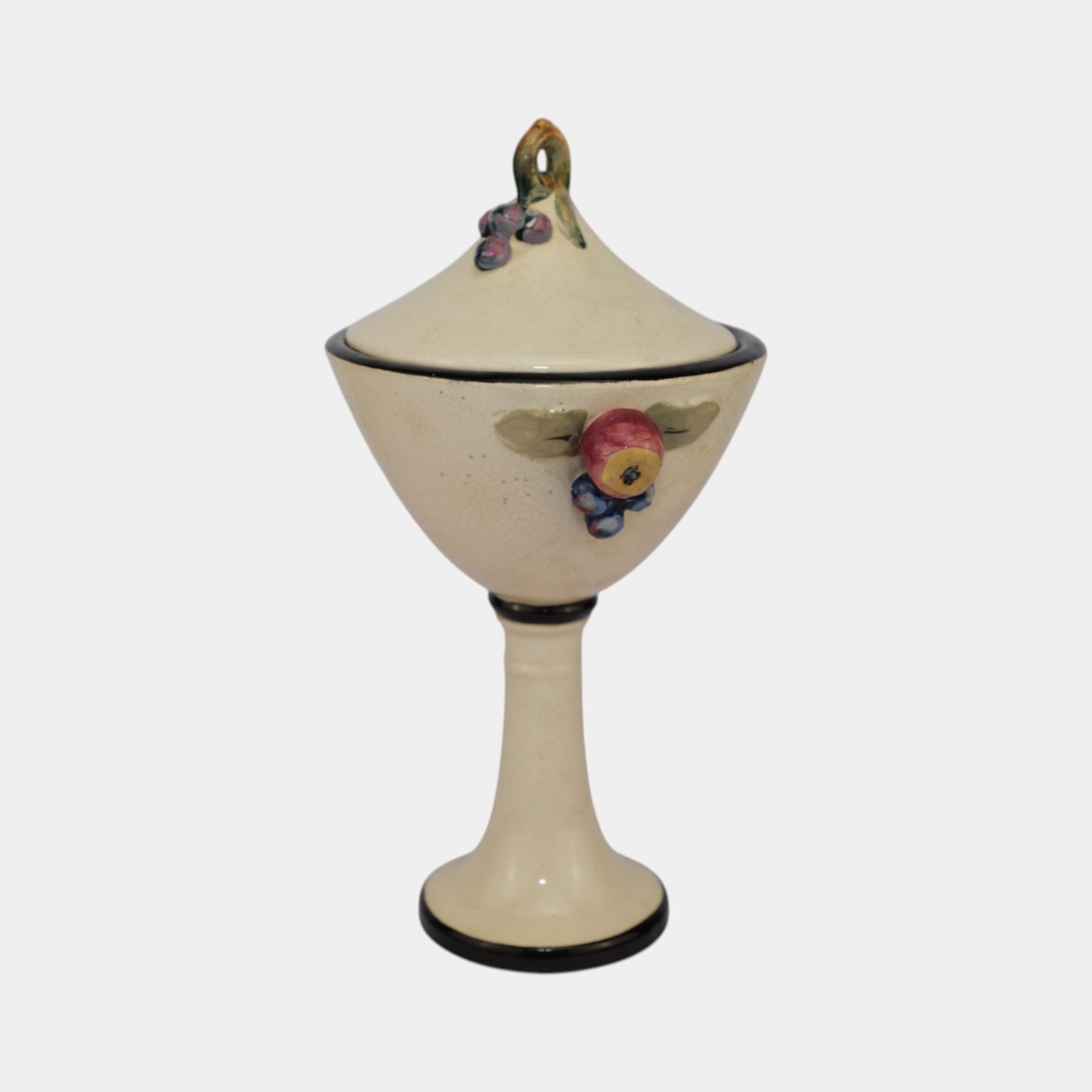 • Elegant Weller Pottery Noval line covered jar, dating to the 1920s. This vintage comport form stands on a tall pedestal base with a conical bowl and fitted lid, accented by hand-applied fruit and leaf decorations in soft pastel glazes. The creamy ground with black trim highlights the colorful details, showcasing Weller’s artistry during the early Art Deco era. A rare and decorative example, perfect for collectors of Weller Pottery or period American art pottery.