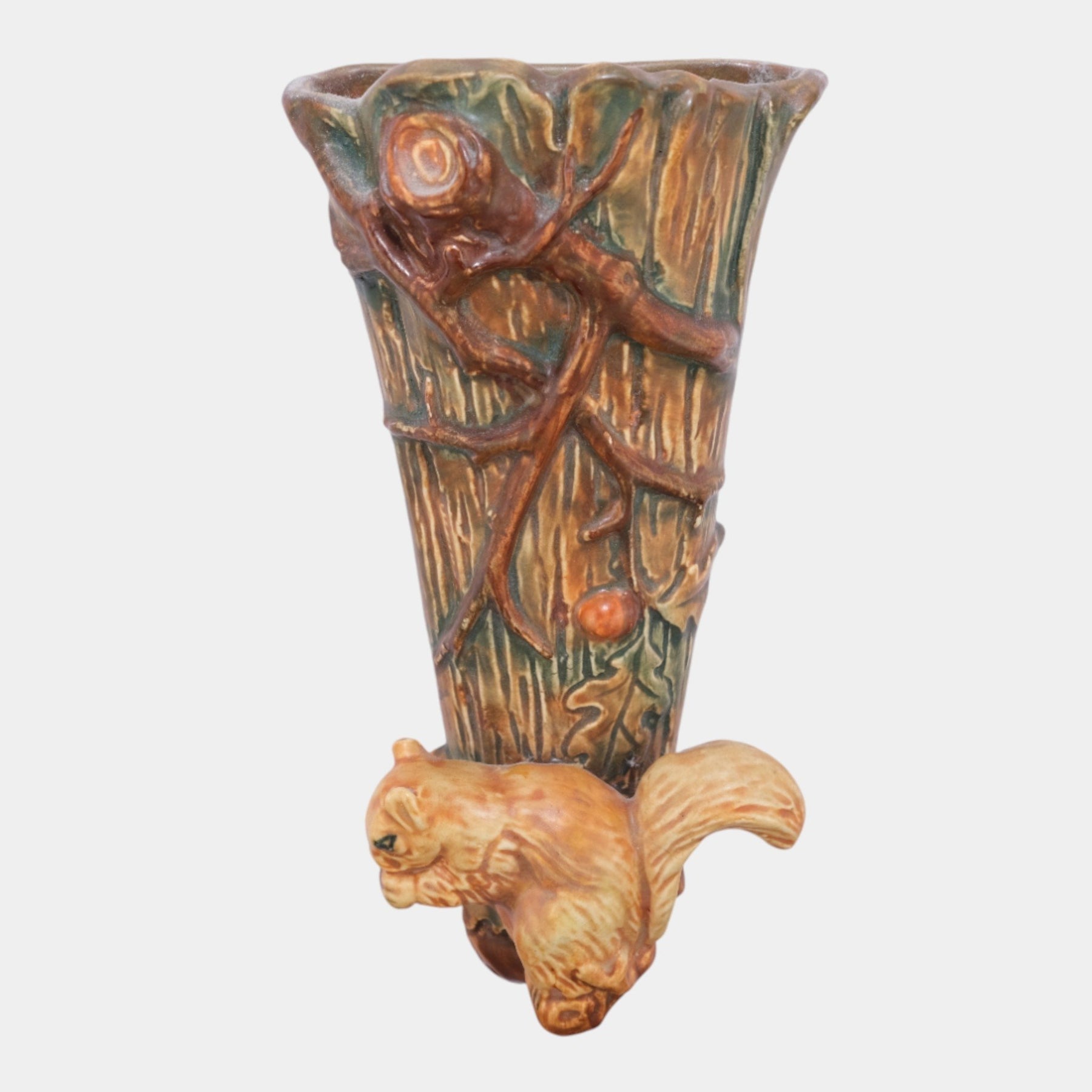• Weller Woodcraft 1920s Vintage Art Pottery Brown Squirrel Figural Wall Pocket