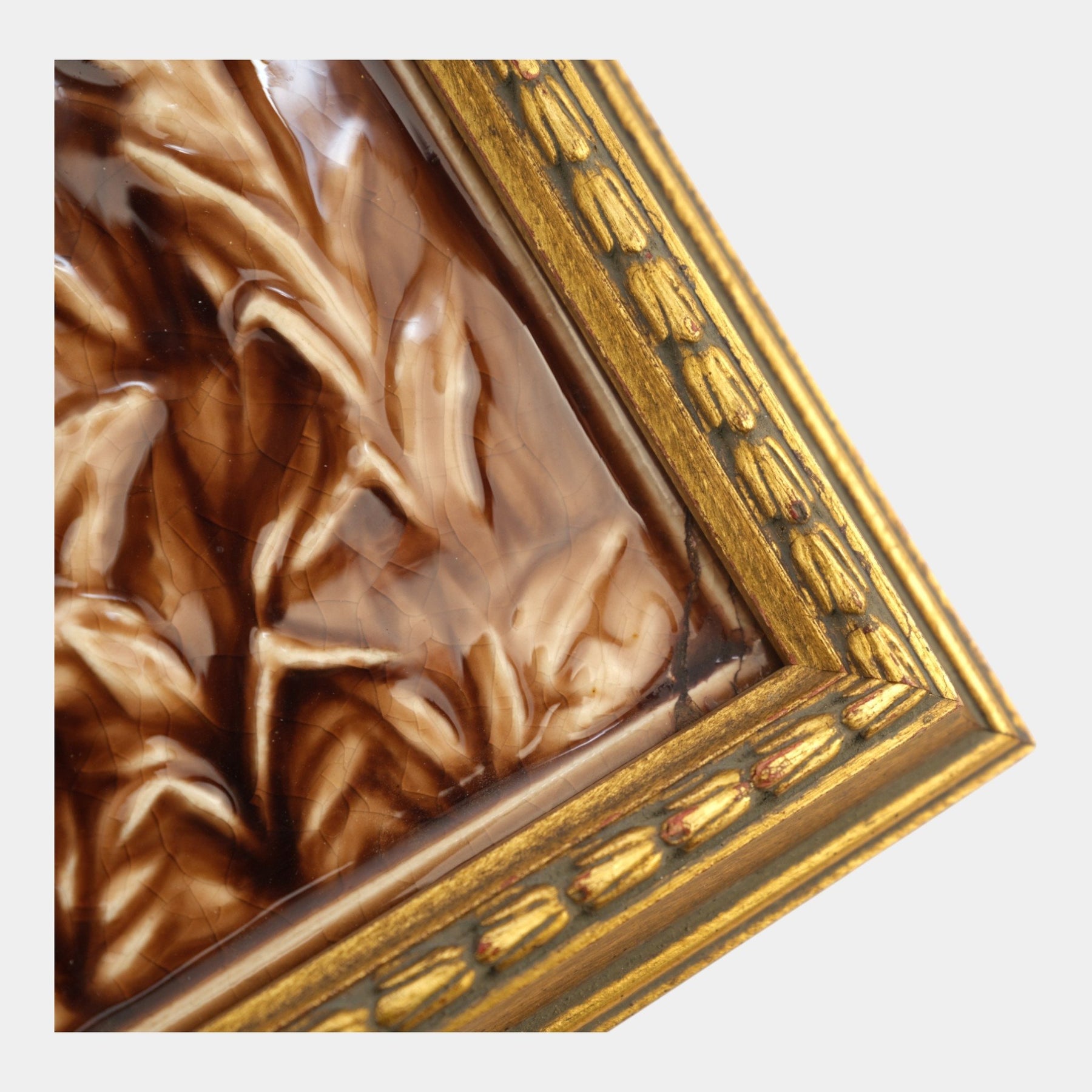 • Richly detailed and warmly glazed, this AETCO relief tile shows two hunting dogs moving through tall grasses. The glossy brown finish highlights the sculpted scene, complemented by a classic gilt frame for an elegant early 20th-century presentation.