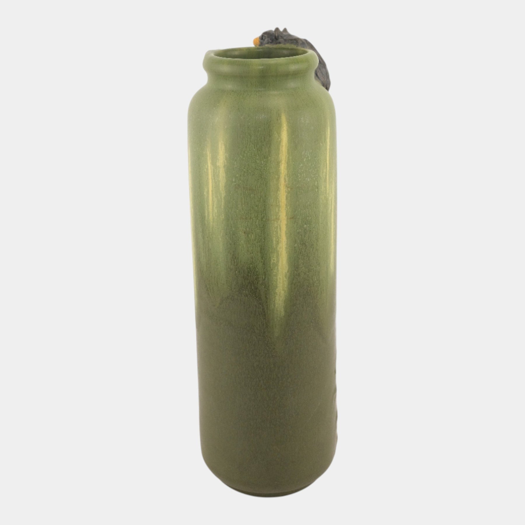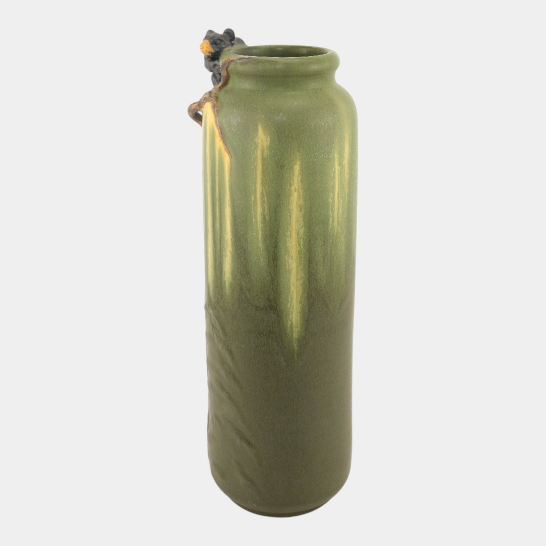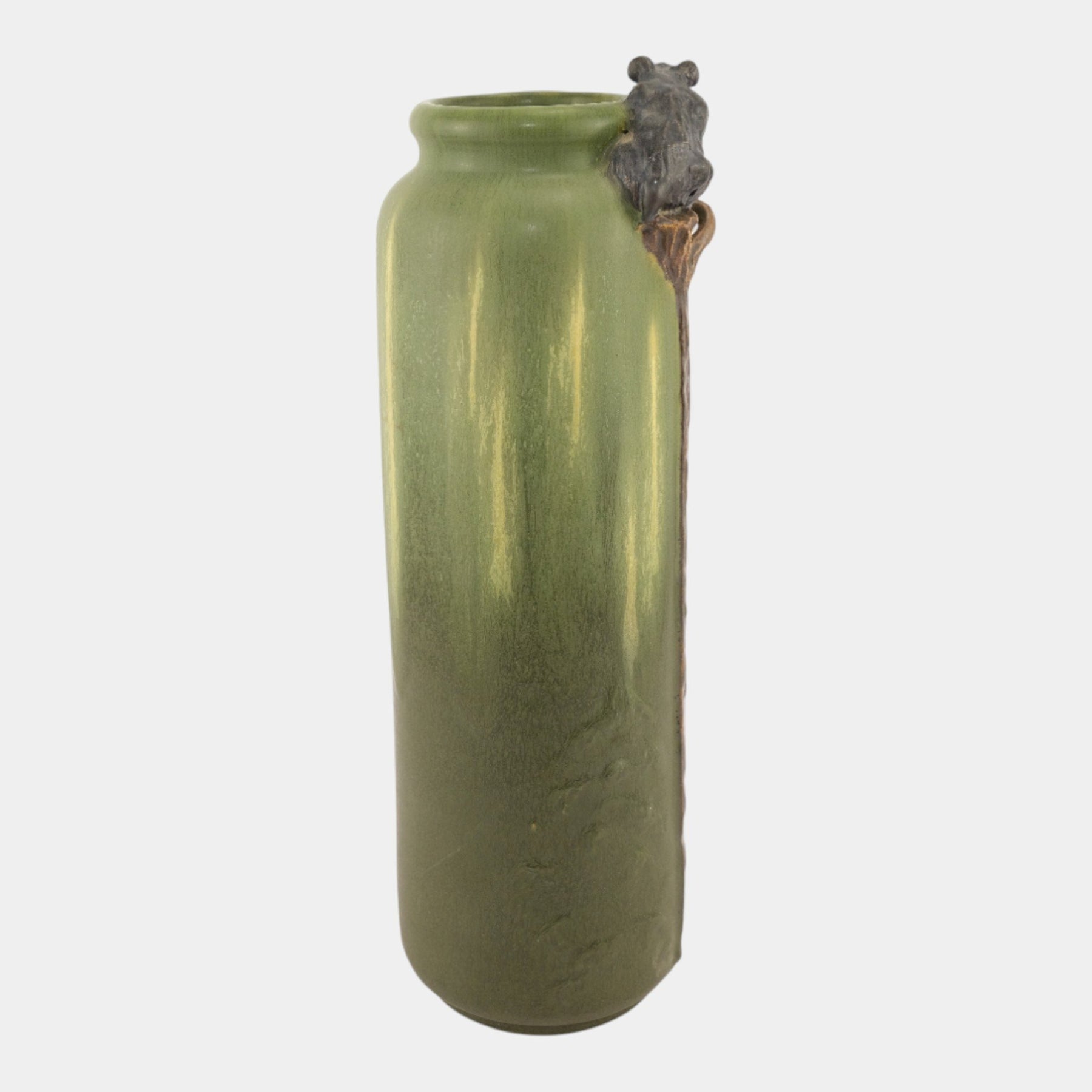 • Charming and rustic, this 2004 Ephraim Faience vase features a sculpted black bear climbing a tall tree against a rich green glaze. A playful design that highlights the studio’s signature craftsmanship and natural themes.