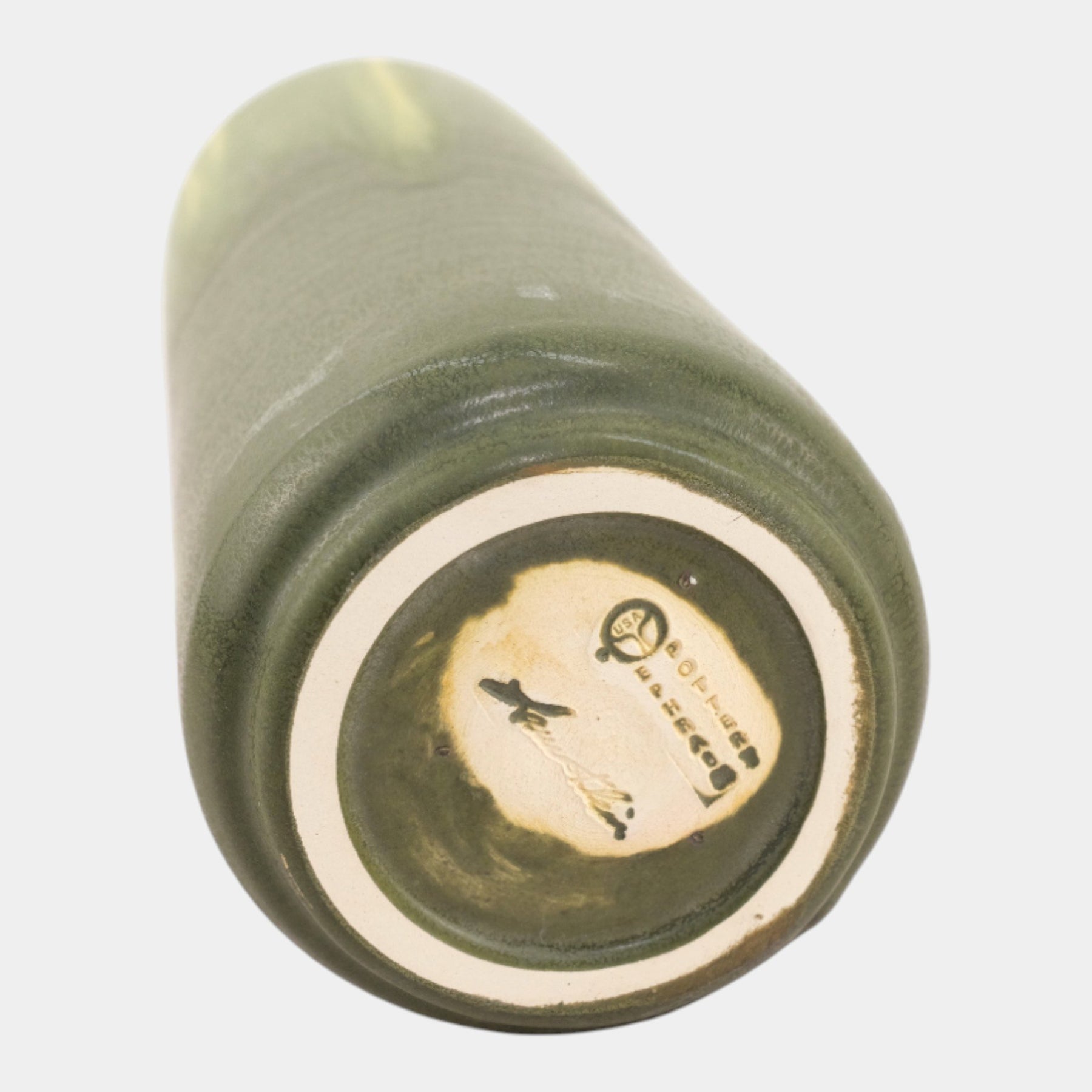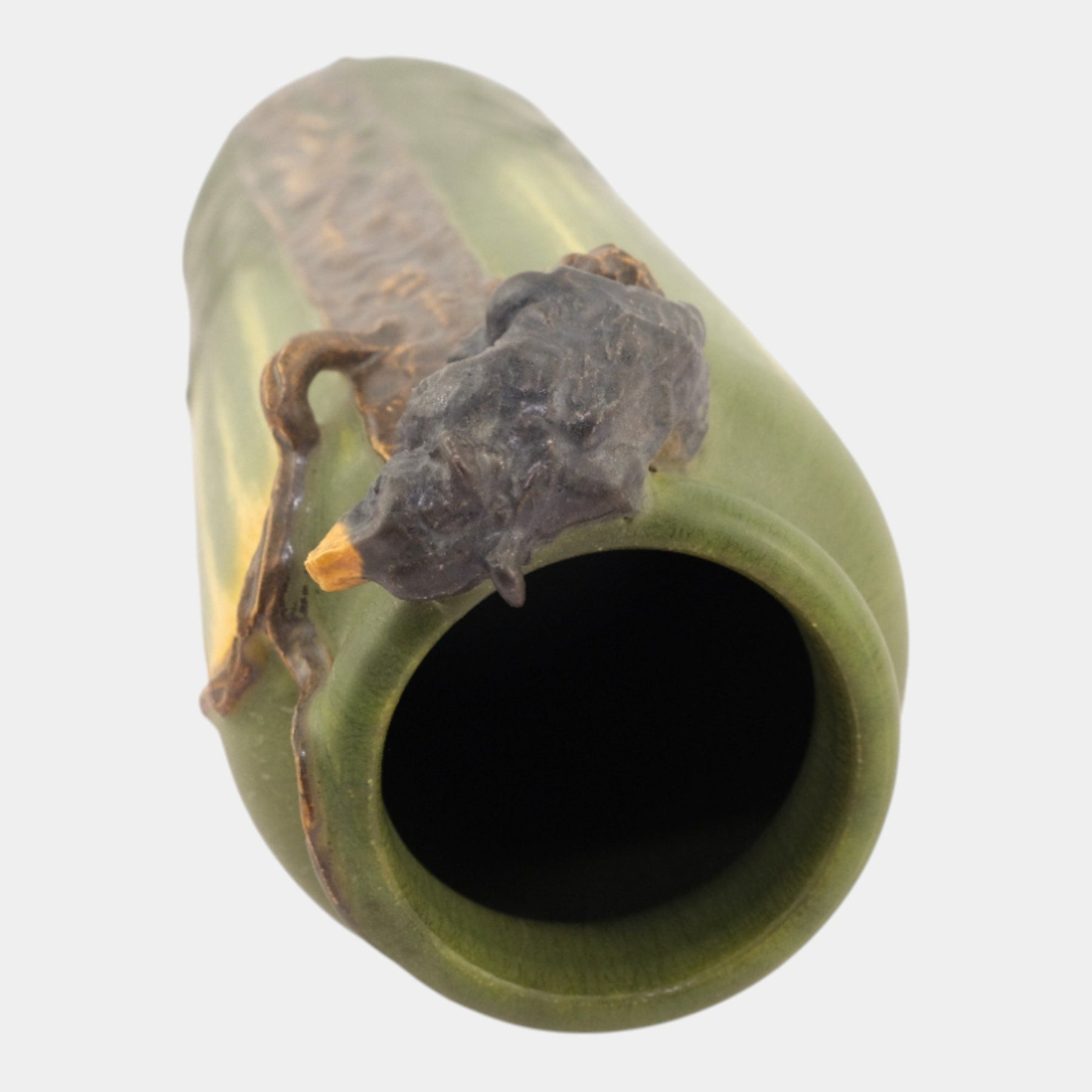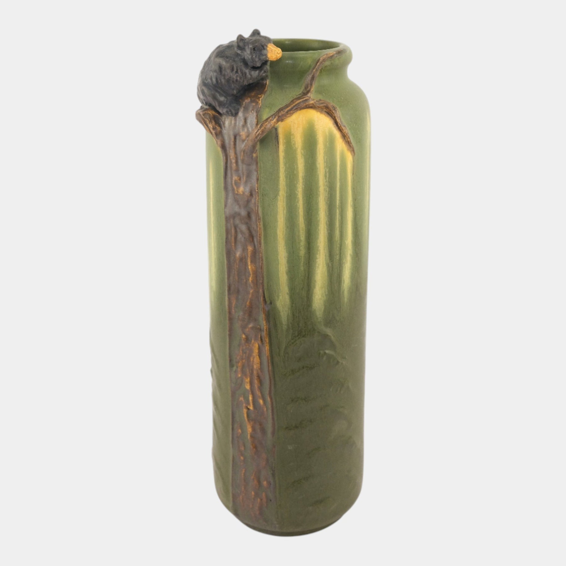 • Charming and rustic, this 2004 Ephraim Faience vase features a sculpted black bear climbing a tall tree against a rich green glaze. A playful design that highlights the studio’s signature craftsmanship and natural themes.