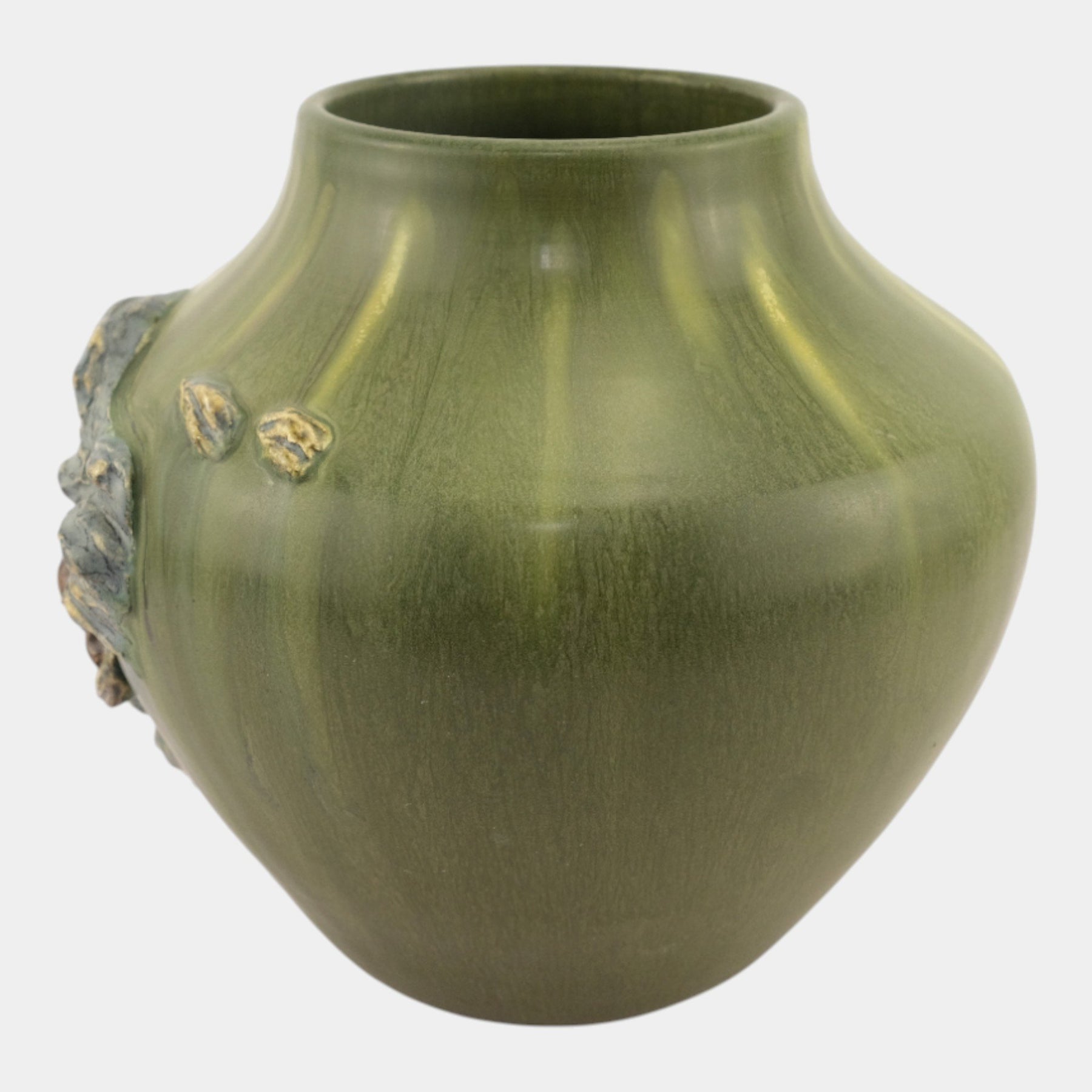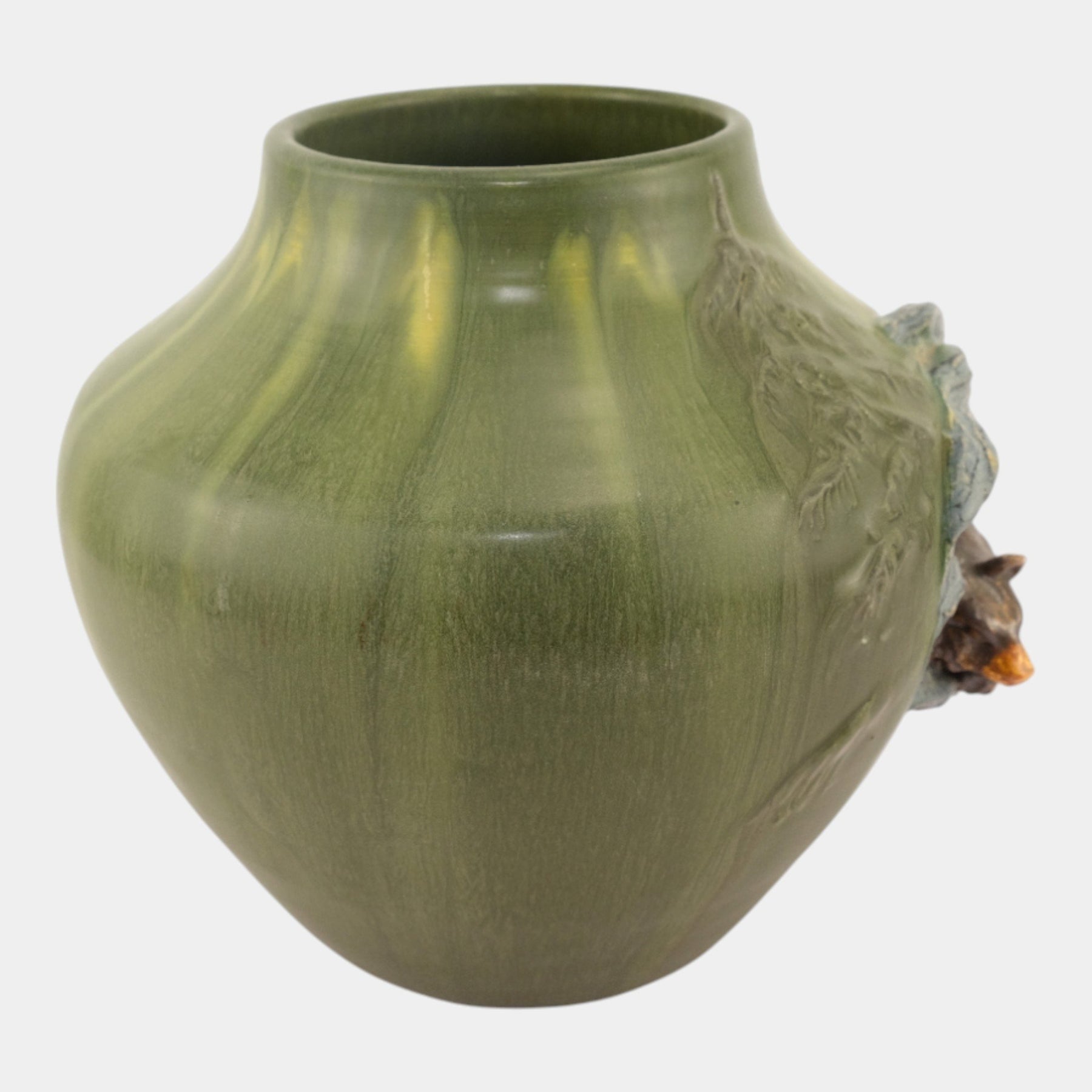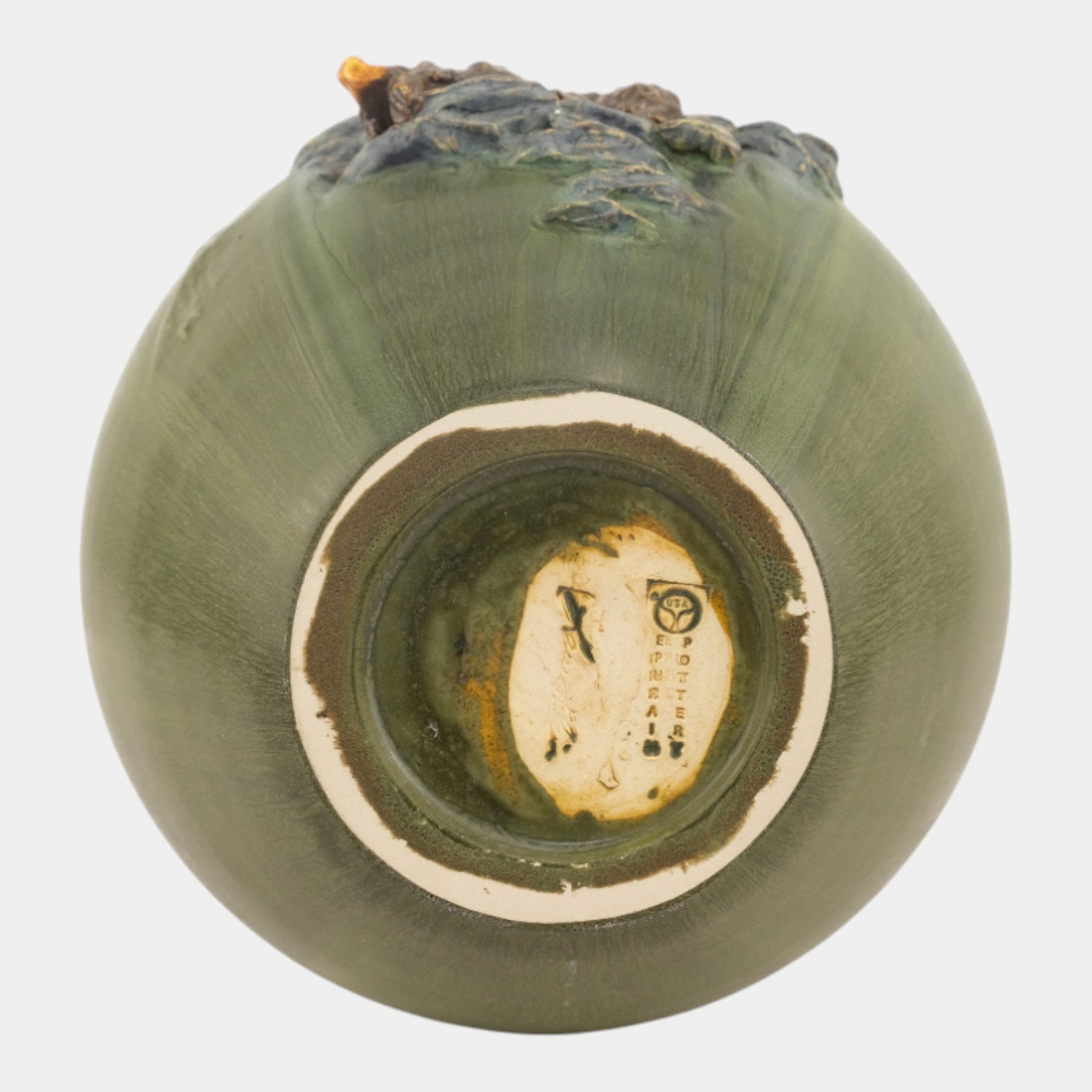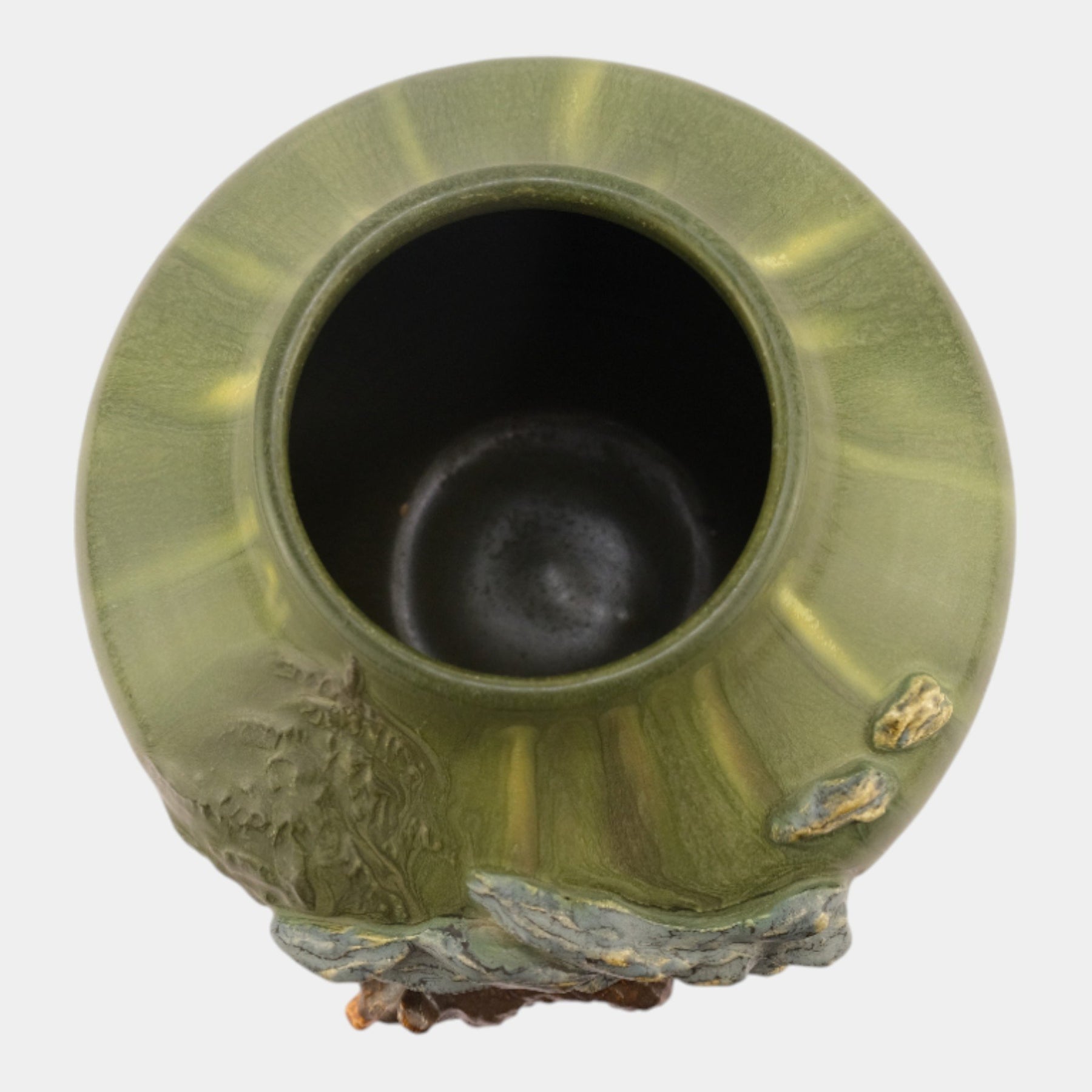 • Beautifully sculpted and richly naturalistic, this Ephraim Faience vase features a detailed bear emerging from a rocky cave amid soft woodland textures, blending Arts & Crafts revival styling with earthy green tonal glazes.