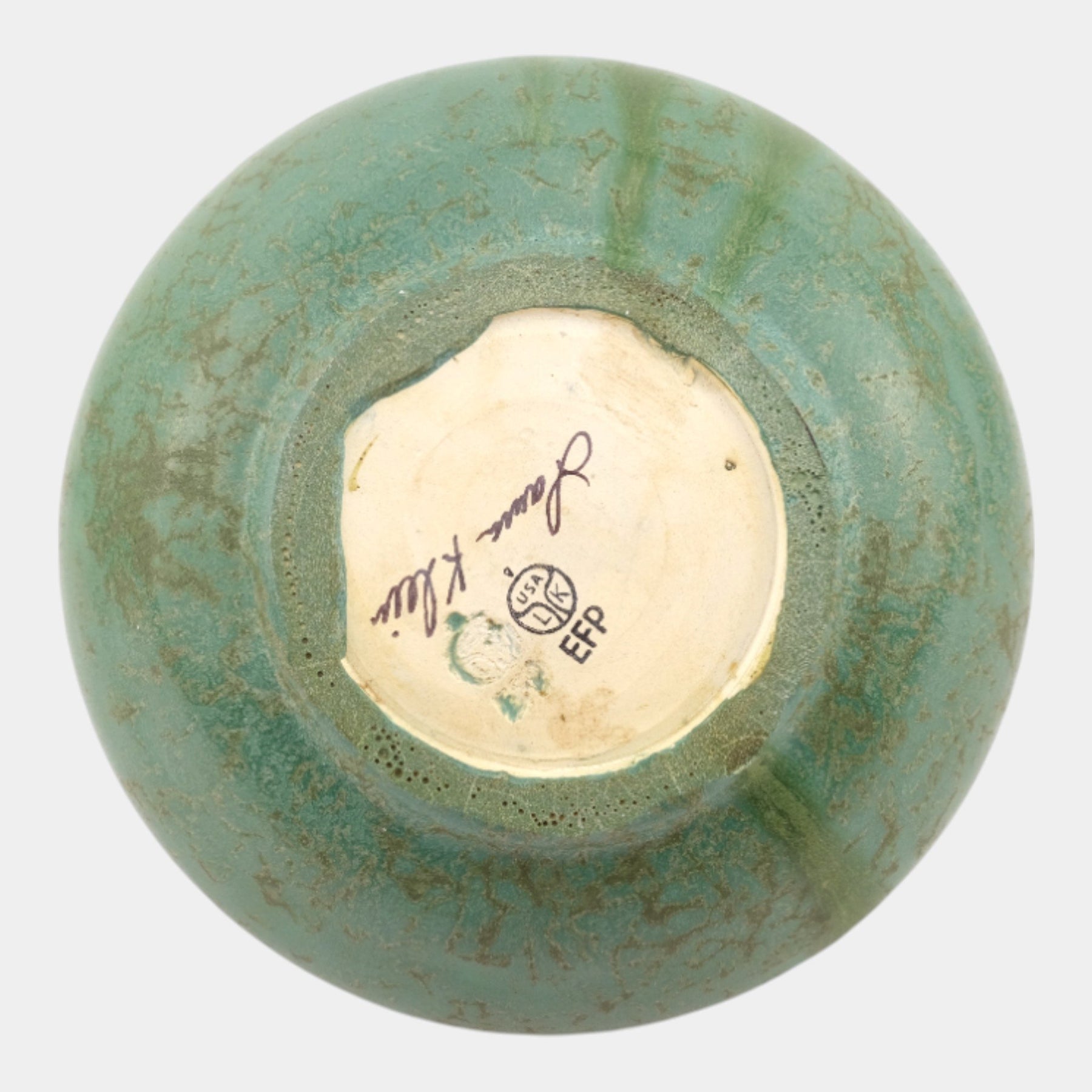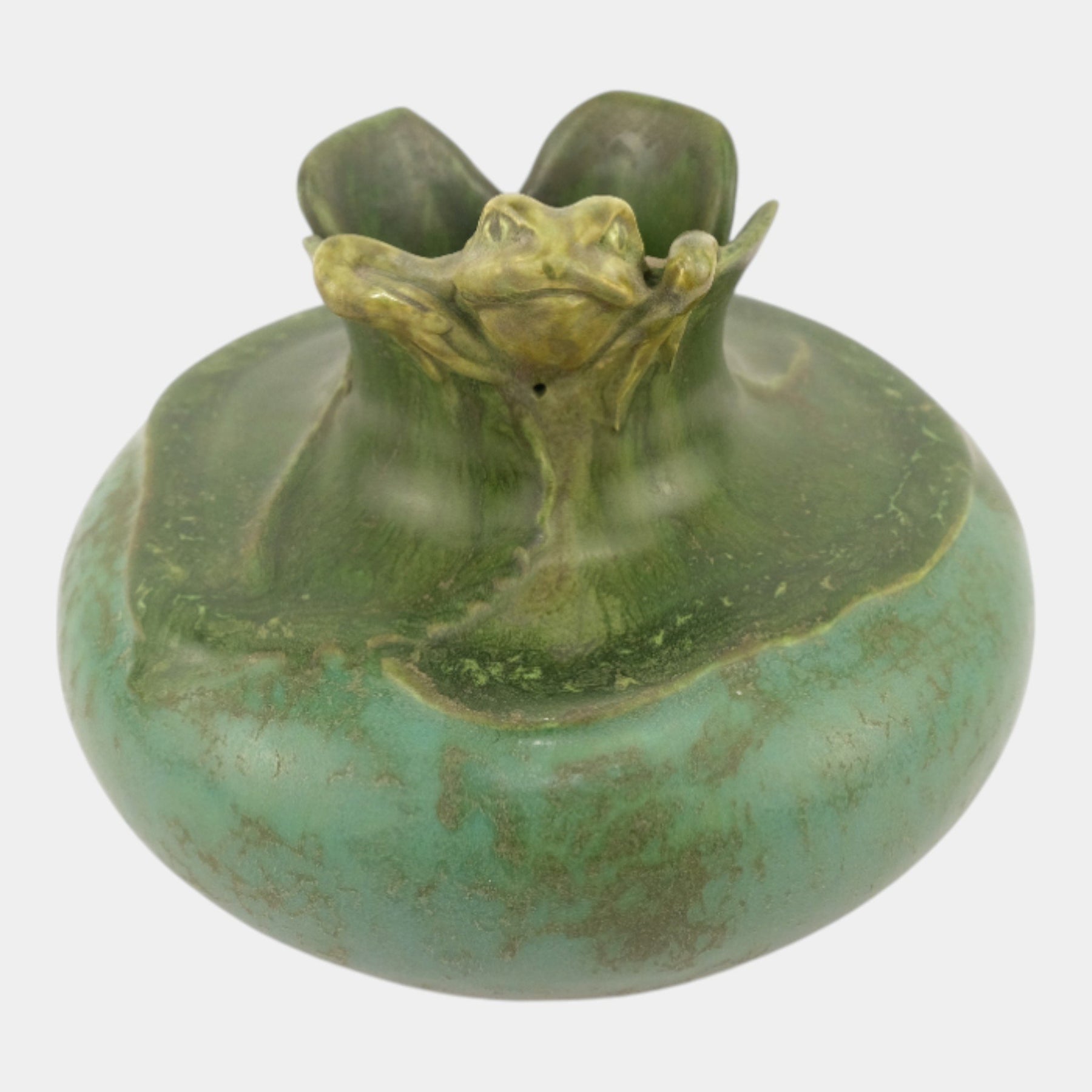 • Whimsical and beautifully organic, this Ephraim Faience low bowl features a sculpted frog emerging from a lily pad form, finished in soft green mottled glazes that echo classic Arts & Crafts naturalism.
