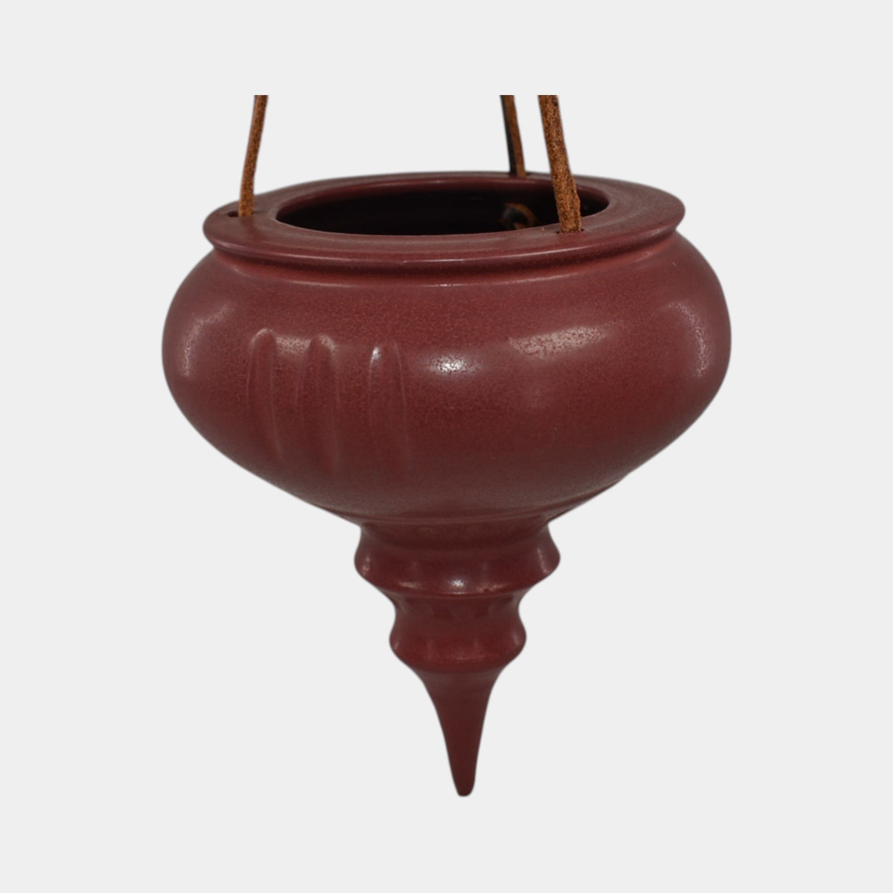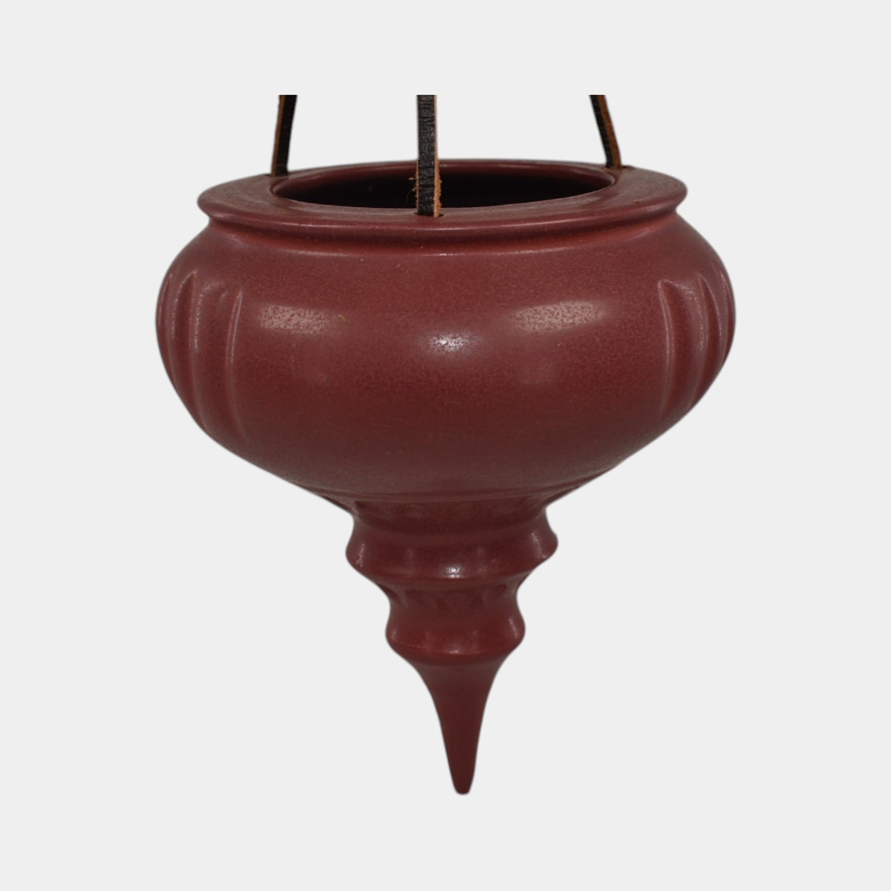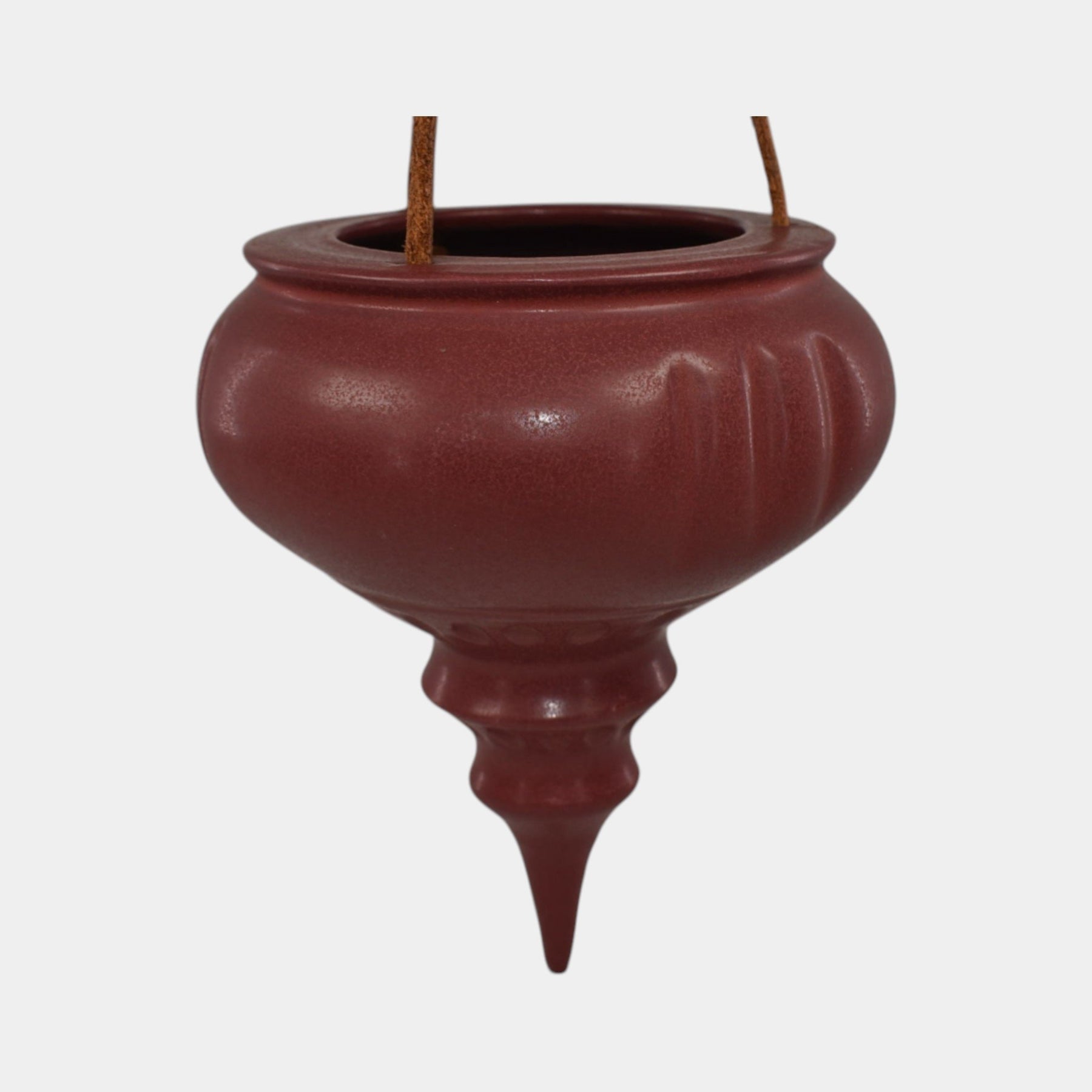 • This handcrafted ceramic ornament hanging basket by Ephraim Faience features a deep cranberry glaze and elegant urn-shaped form. Suspended by leather cords, it evokes timeless holiday charm and is a classic addition to any arts and crafts-inspired decor.