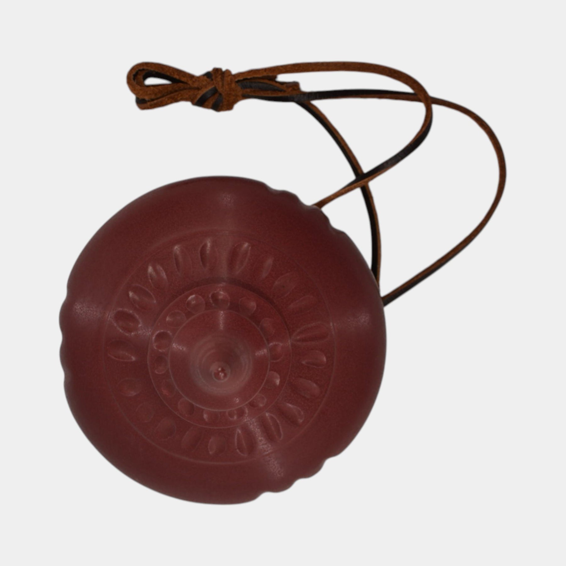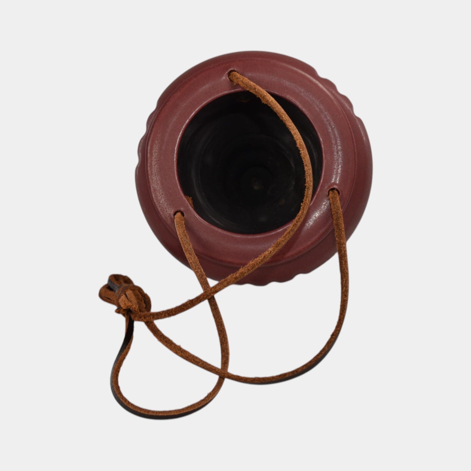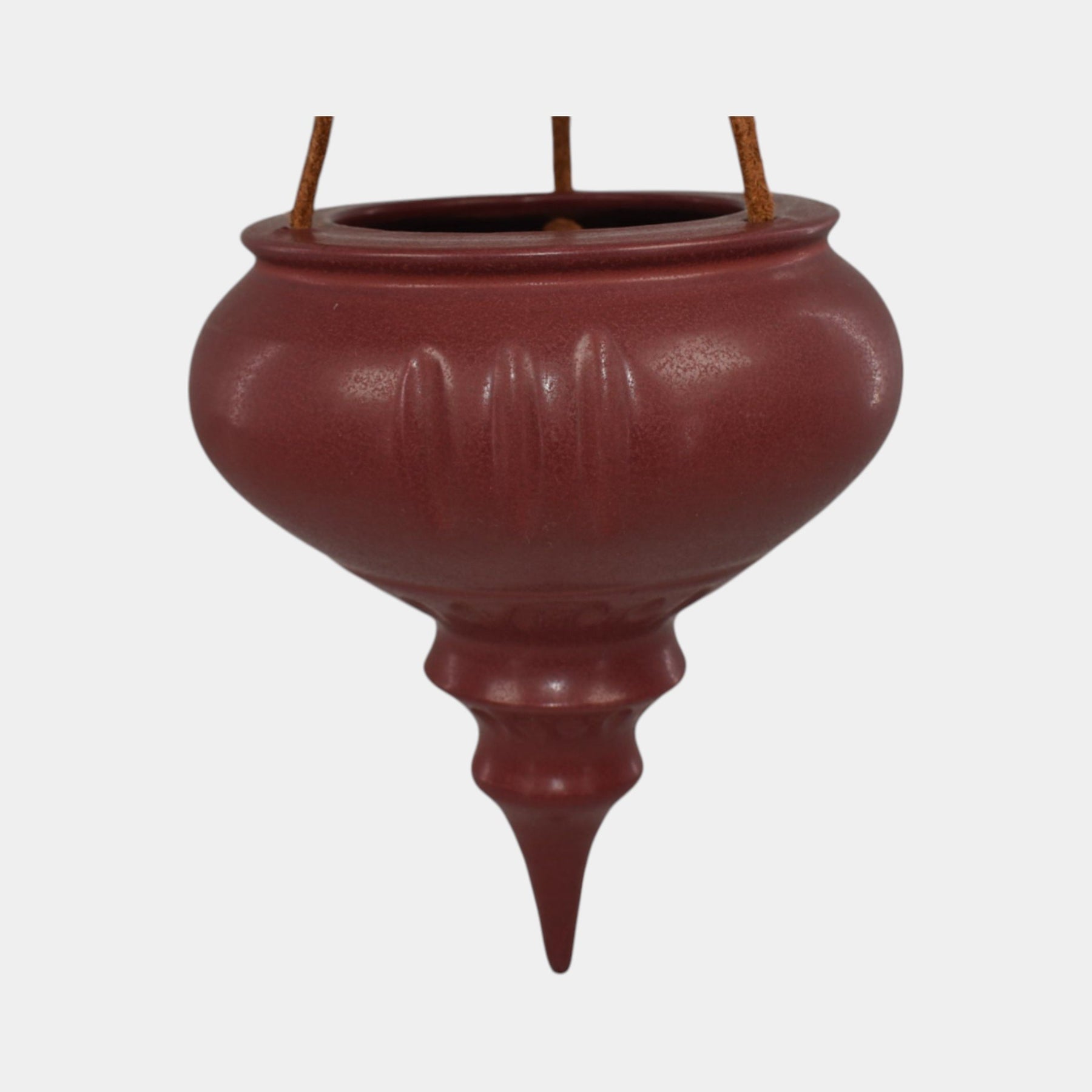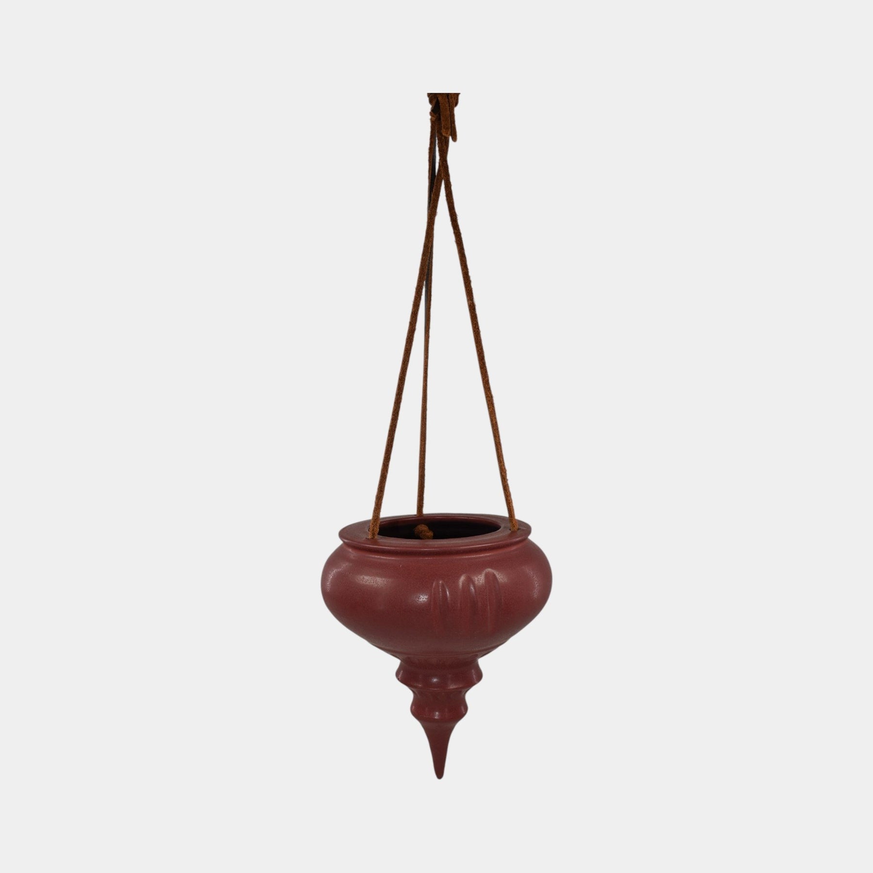 • This handcrafted ceramic ornament hanging basket by Ephraim Faience features a deep cranberry glaze and elegant urn-shaped form. Suspended by leather cords, it evokes timeless holiday charm and is a classic addition to any arts and crafts-inspired decor.