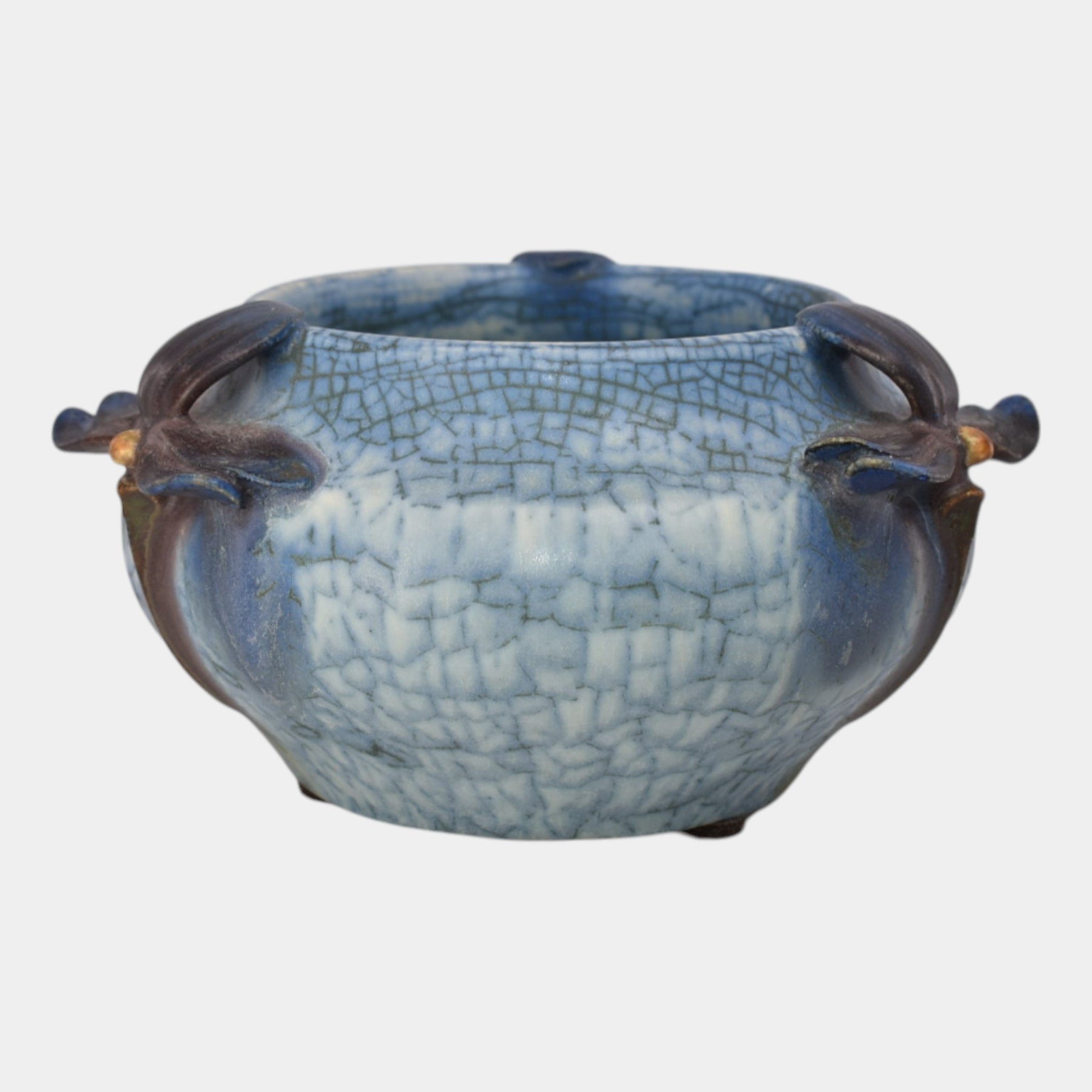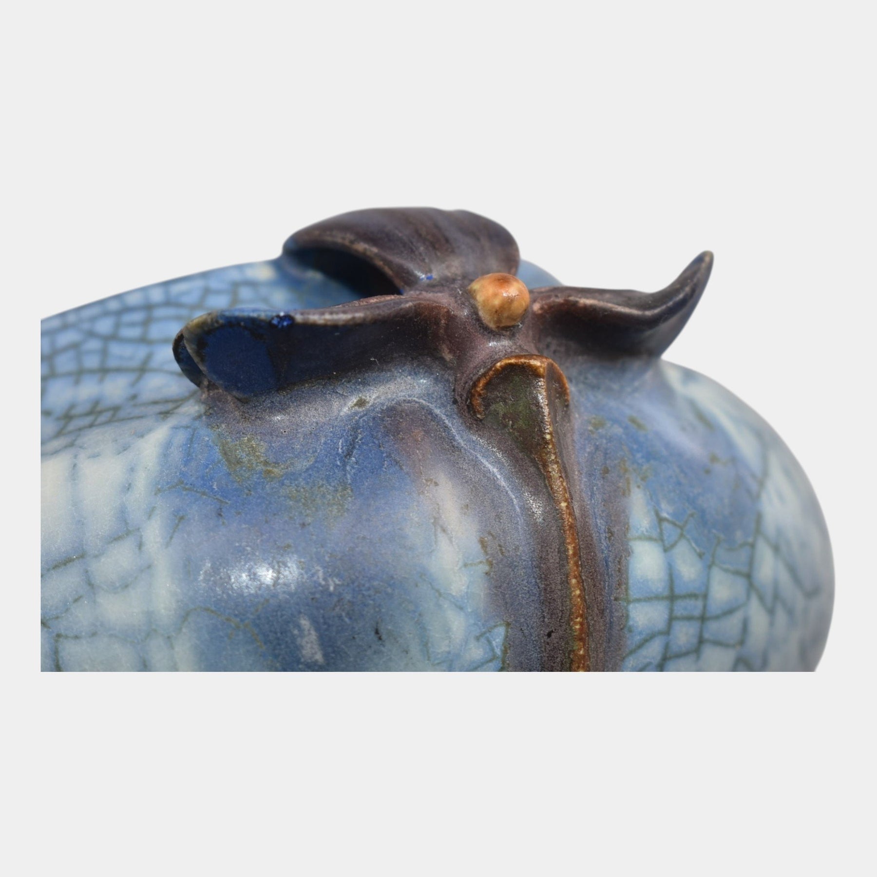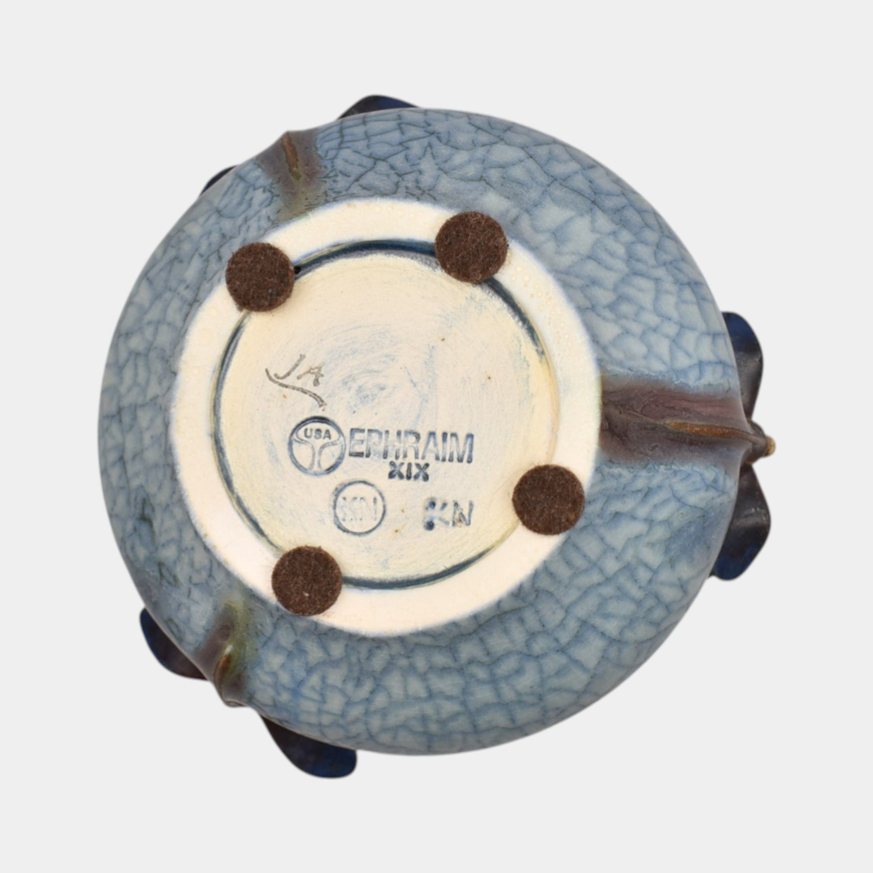 • This 2019 Ephraim Faience handcrafted blue pottery vase showcases sculpted floral designs in deep plum and golden hues, set against a striking crackle-glazed background in soft sky blue. A harmonious blend of artistry and craftsmanship, it reflects Ephraim’s signature attention to detail and timeless design.