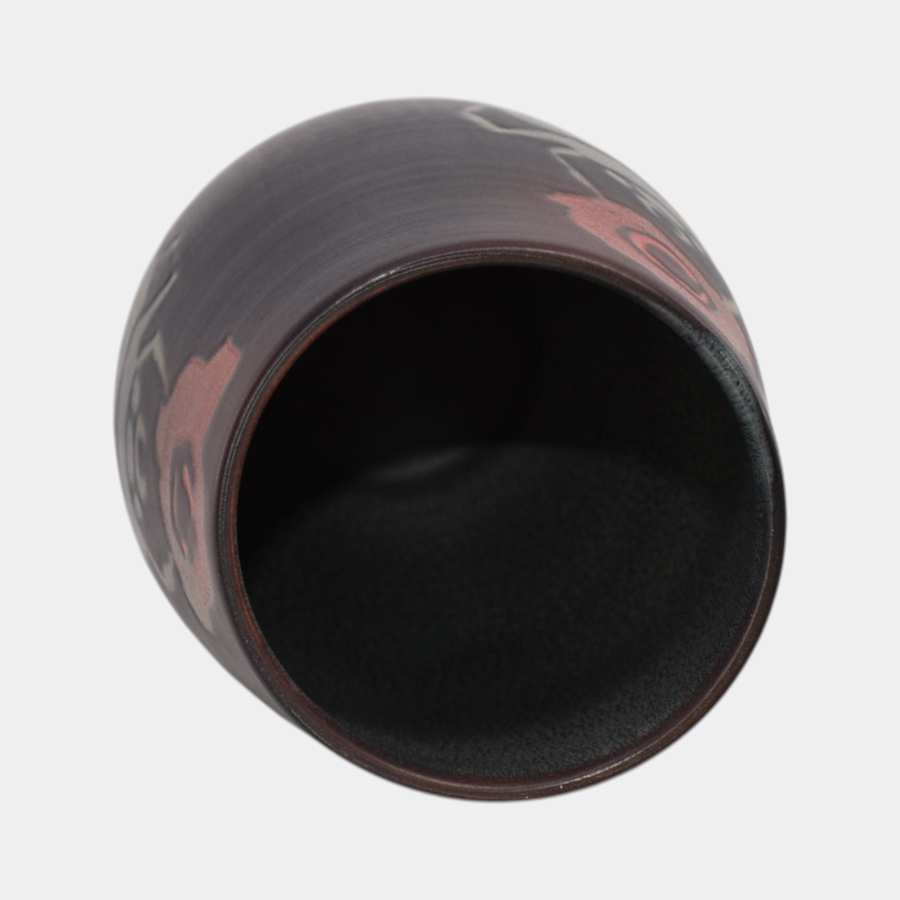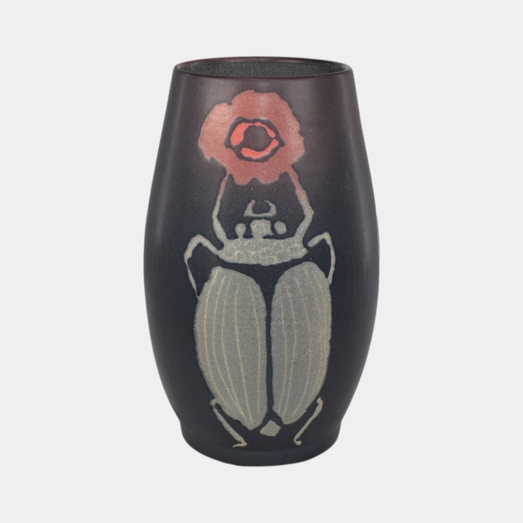 • This bold 2020 experimental vase by Ephraim Faience features a stylized scarab beetle clutching a vibrant red flower, rendered in a striking matte design against a deep charcoal glaze. The sleek, modern form contrasts with the symbolic imagery, offering a unique blend of ancient iconography and contemporary artistry.