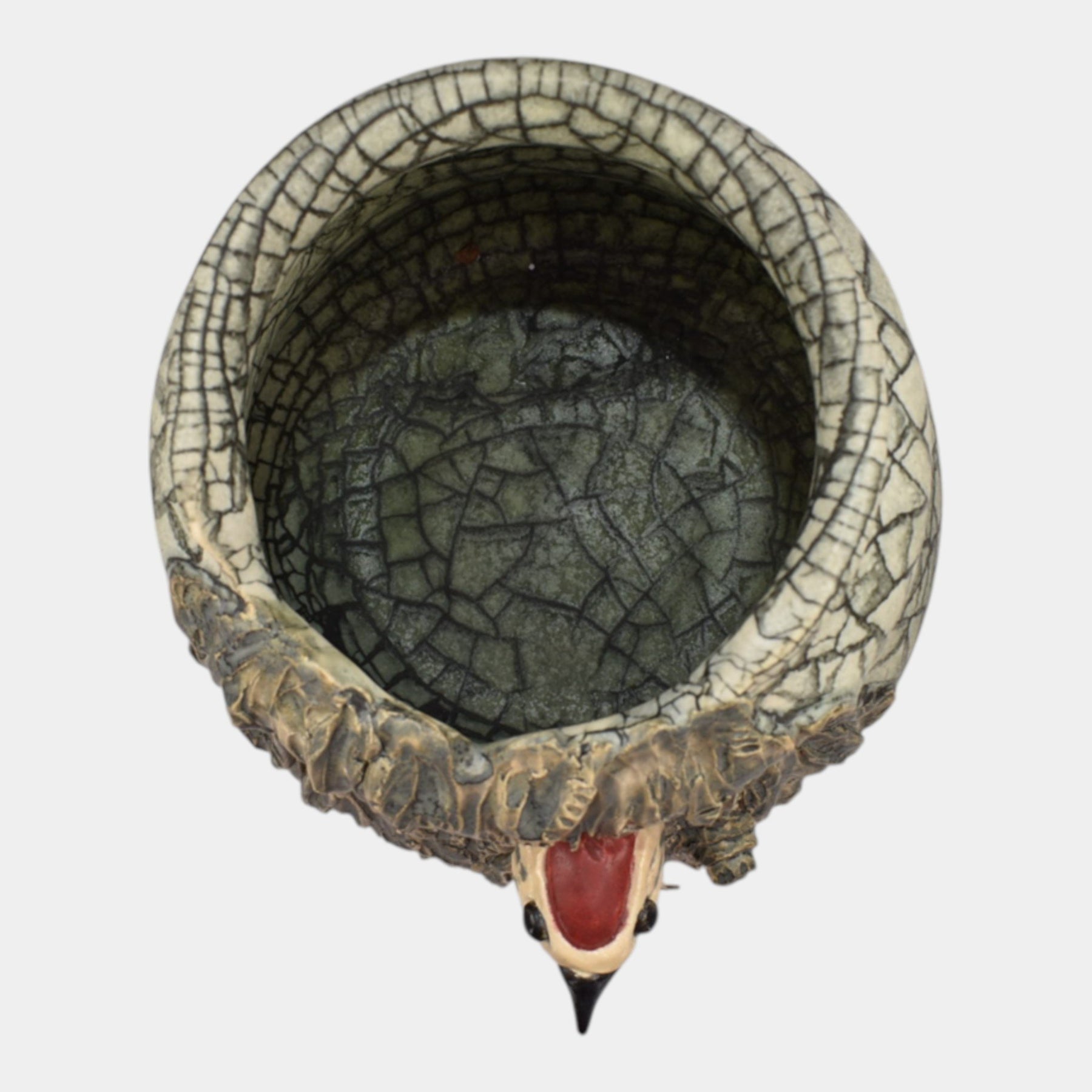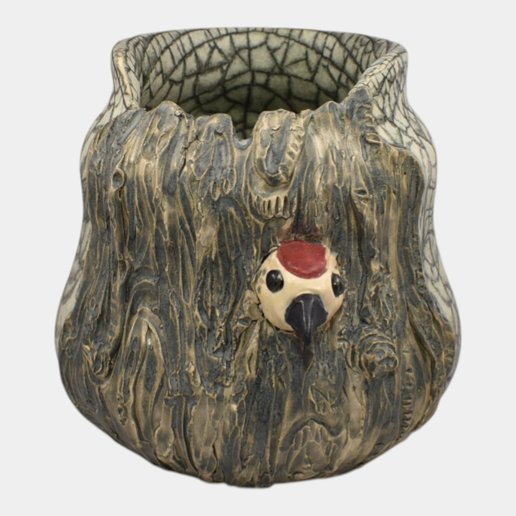 • Ephraim Faience 2020 Woodpecker vase features a textured tree-trunk design with a charming red-headed woodpecker peeking from its hollow. Finished with earthy glazes and intricate detailing, it captures the whimsy and realism of woodland life.