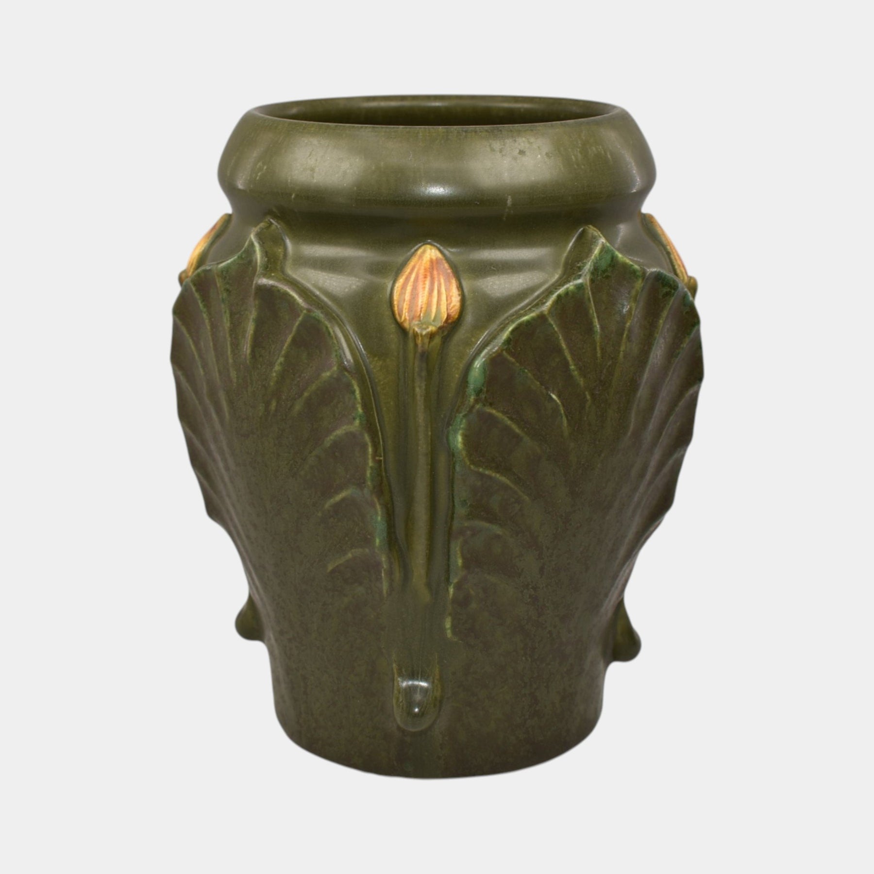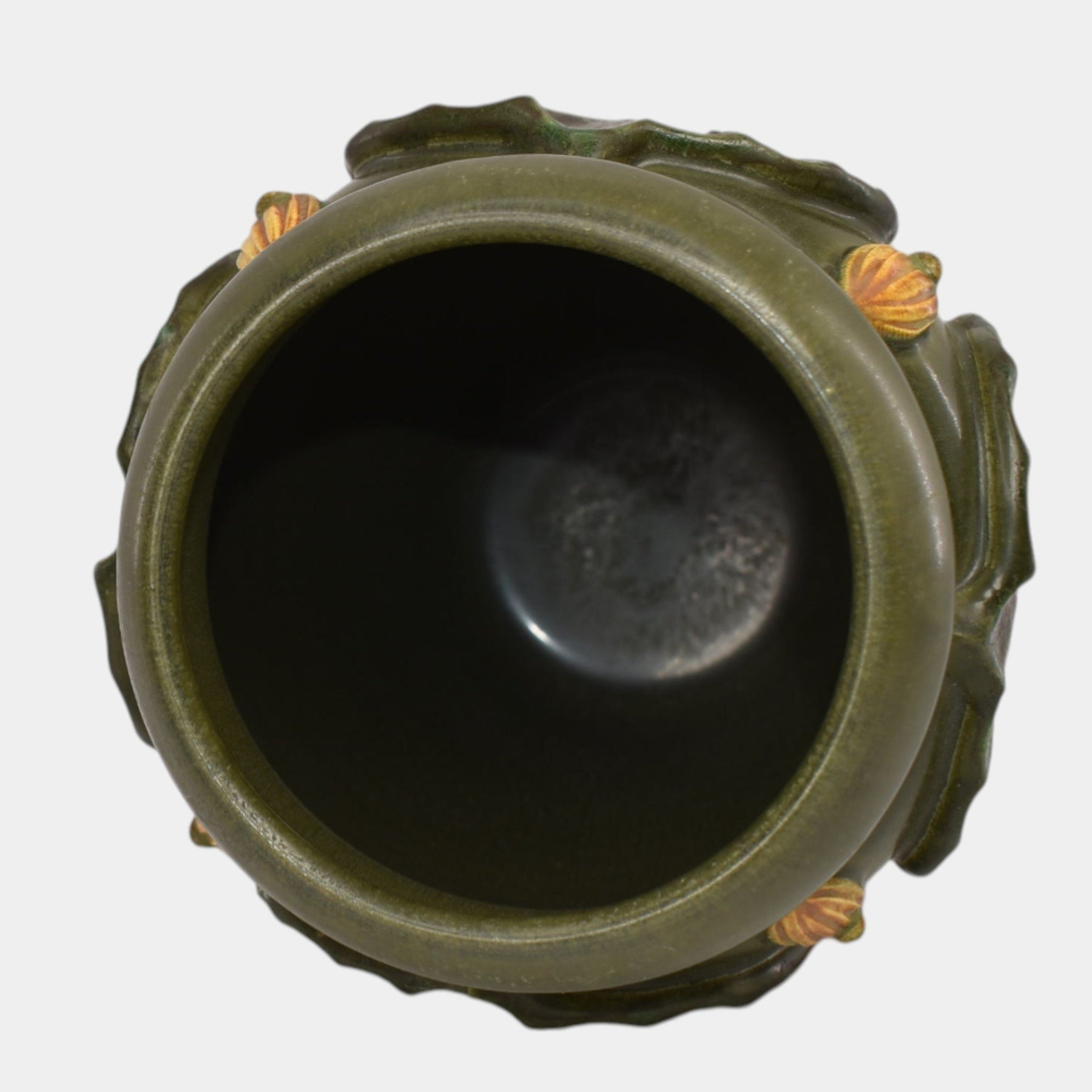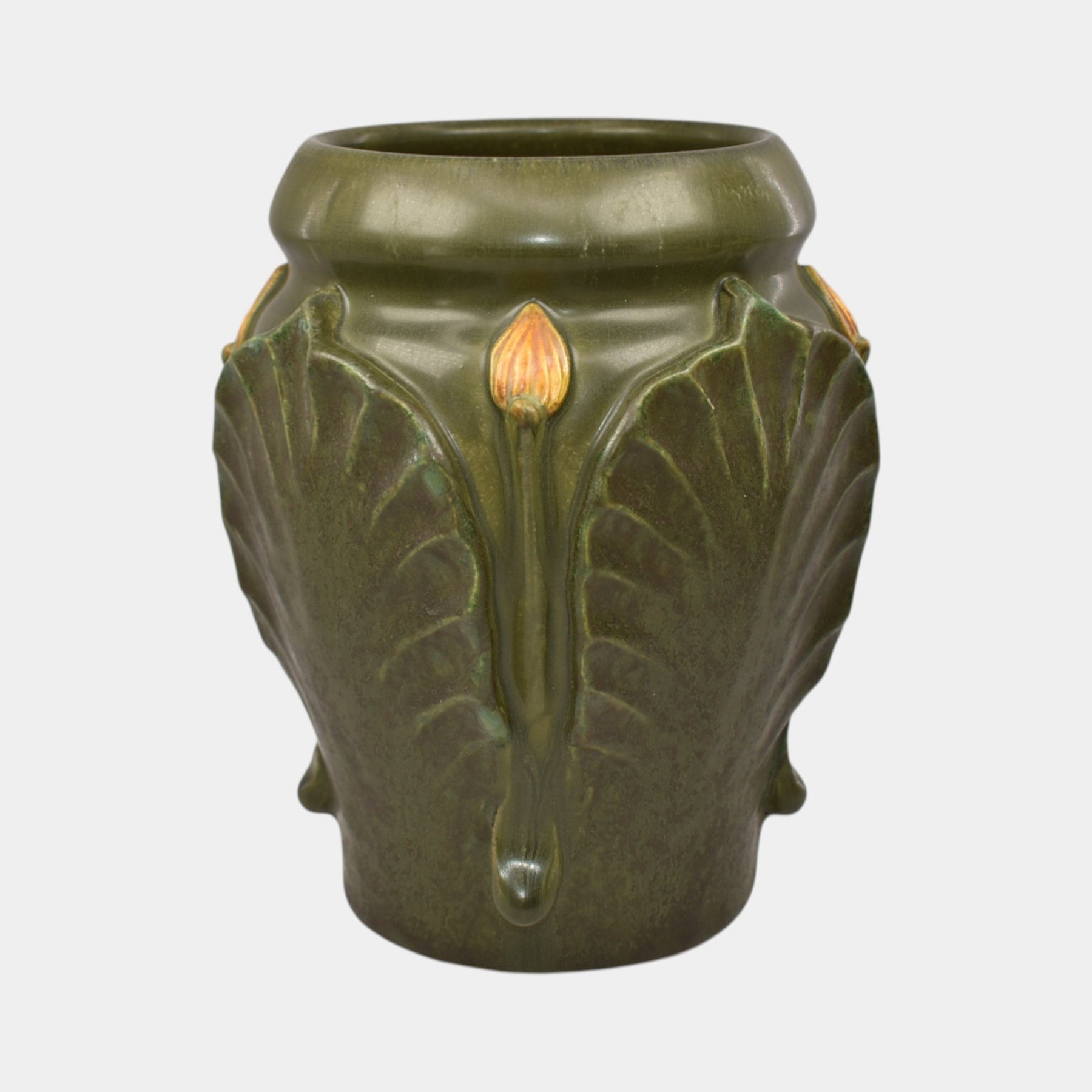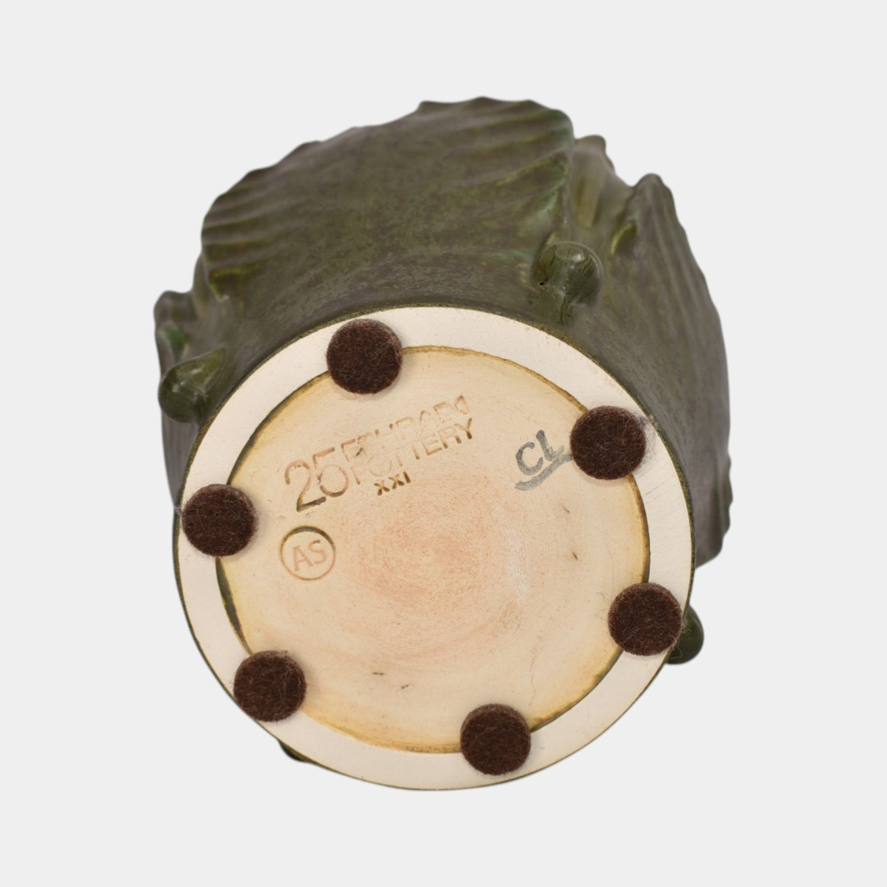 • Elegant and organic in form, this 2021 Apple Leaf Redux vase by Ephraim Faience features hand-sculpted foliage and closed floral buds in high relief. The rich matte green glaze enhances the deep veining of the leaves, while the soft orange buds provide a warm, subtle contrast. Carefully thrown and artistically finished, the piece draws on Arts and Crafts traditions to celebrate natural beauty through form and texture.
