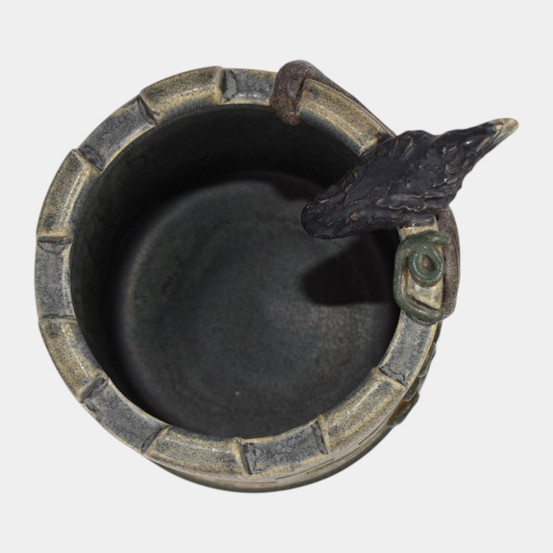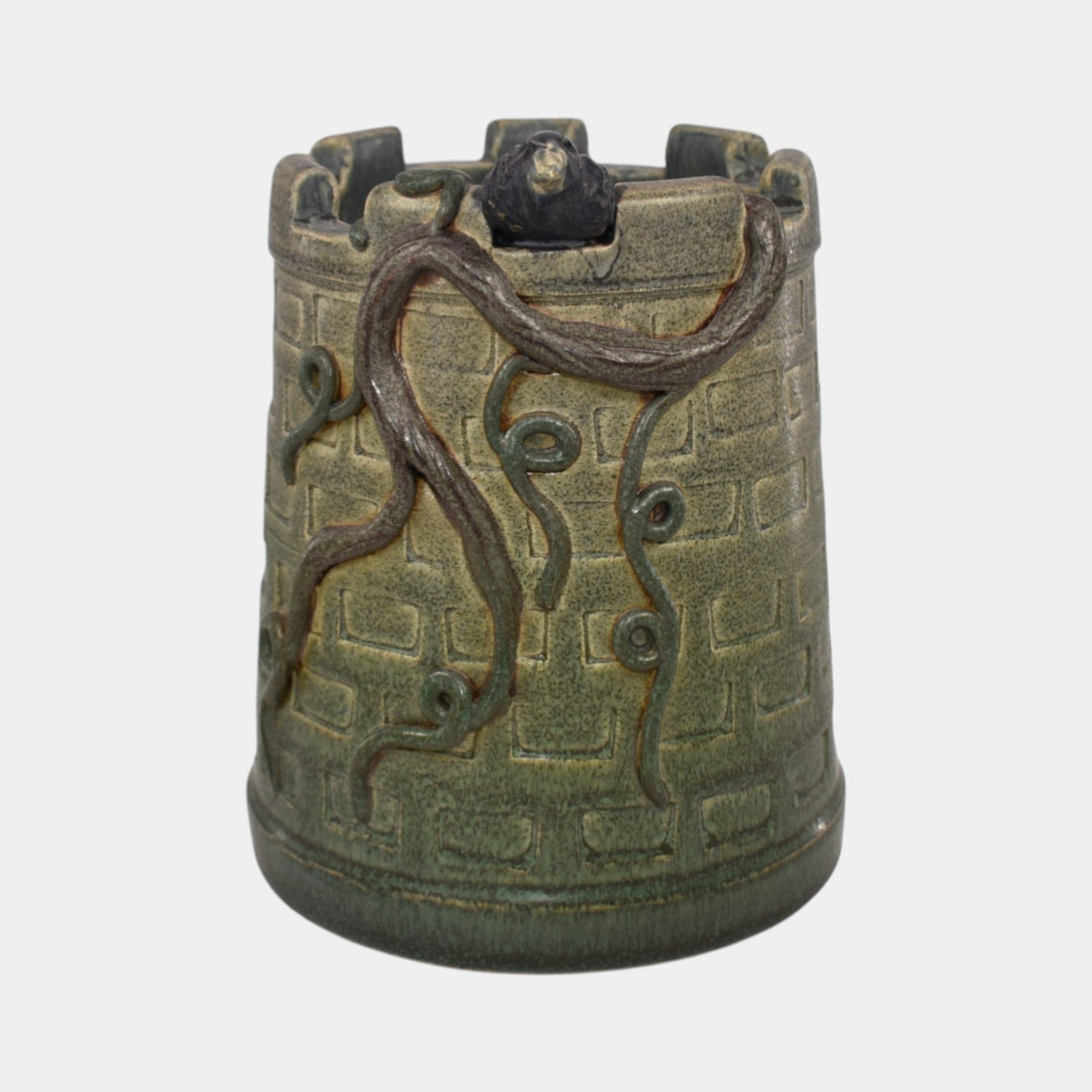 • Evoking the mystery of medieval folklore, this 2021 Rook’s Tower vase by Ephraim Faience captures a sculptural narrative in clay. The hand-thrown cylindrical form mimics a stone castle turret, complete with parapets and textured blockwork. Vining tendrils climb the tower’s surface, drawing the eye to a sculpted black rook peering watchfully from the top. Rendered in mottled blue-green glaze with naturalistic detailing, this piece combines architectural elements with the studio’s signature storytelling and craftsmanship.