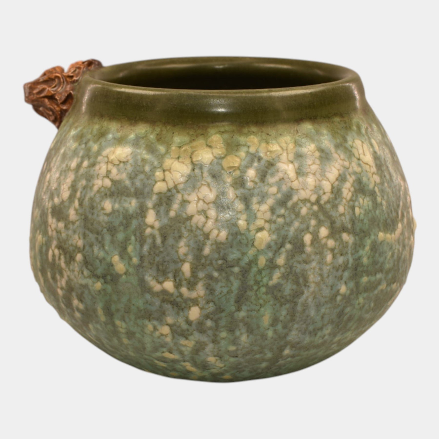 • A striking 2022 Ephraim Faience hand made art pottery bowl featuring a sculpted pine branch with needles and richly textured pinecones in relief.