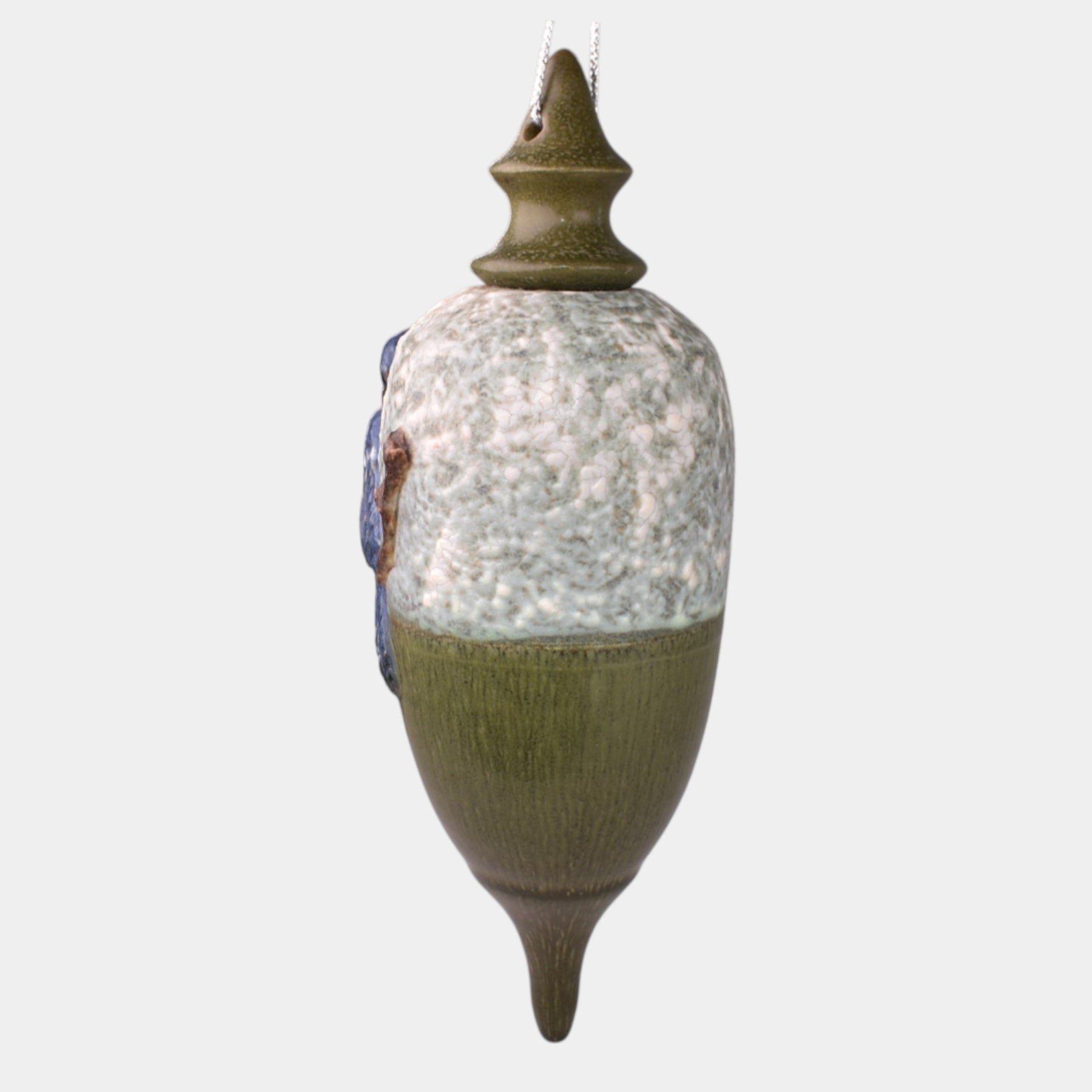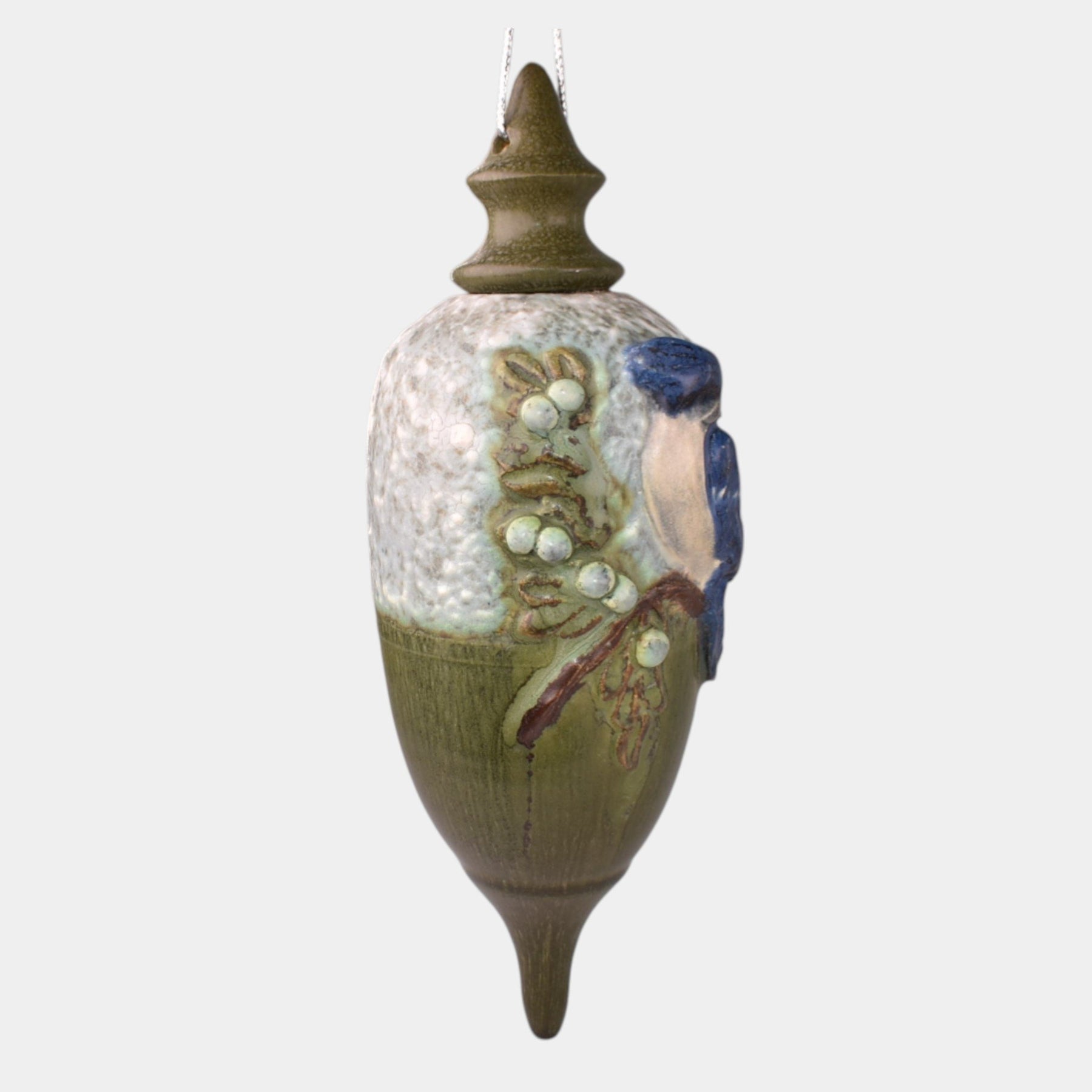 • Ephraim Faience Hand Made Pottery Green Ceramic Blue Jay Bird Ornament
