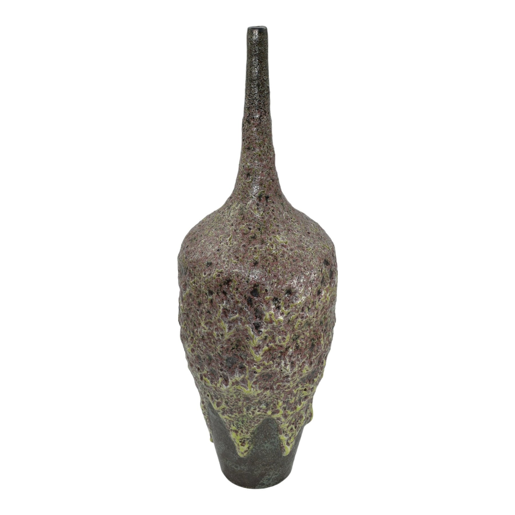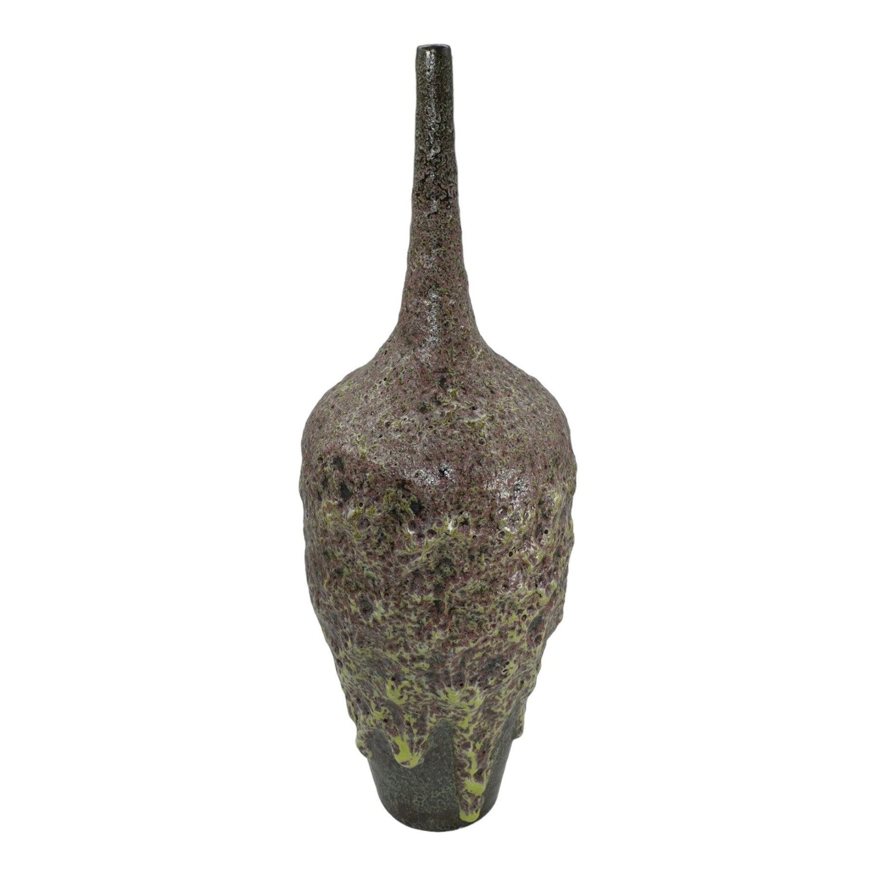 • Beautiful, slender neck floor vase covered in a purple and green flowing lava drip glaze.