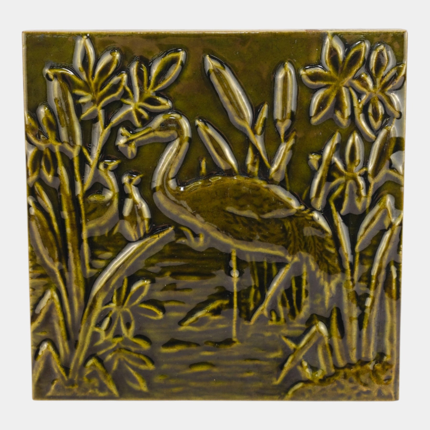 • Nicely detailed in low relief, this Godwin tile shows a heron standing among cattails and flowers. The rich brown glaze enhances the naturalistic Arts and Crafts–era design.