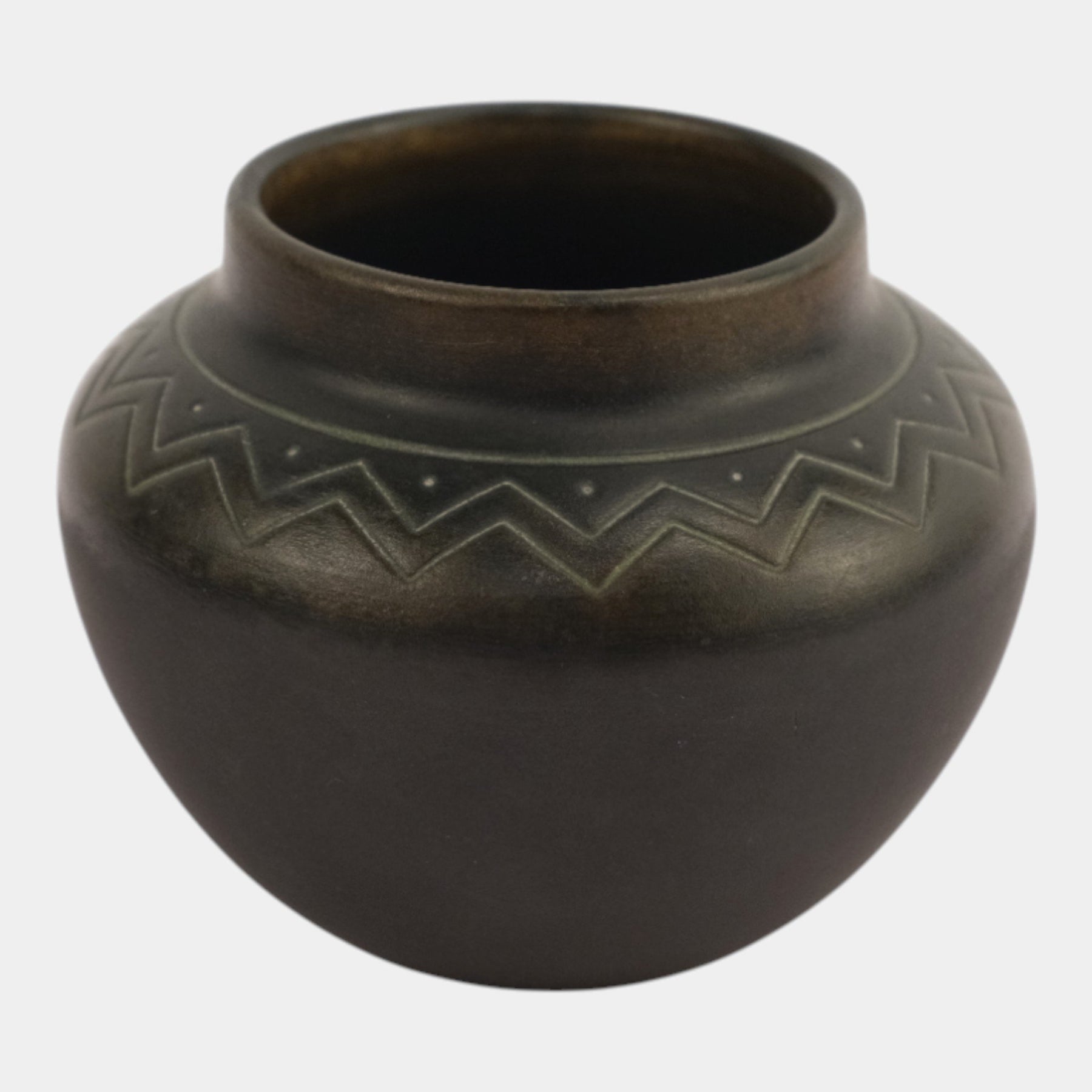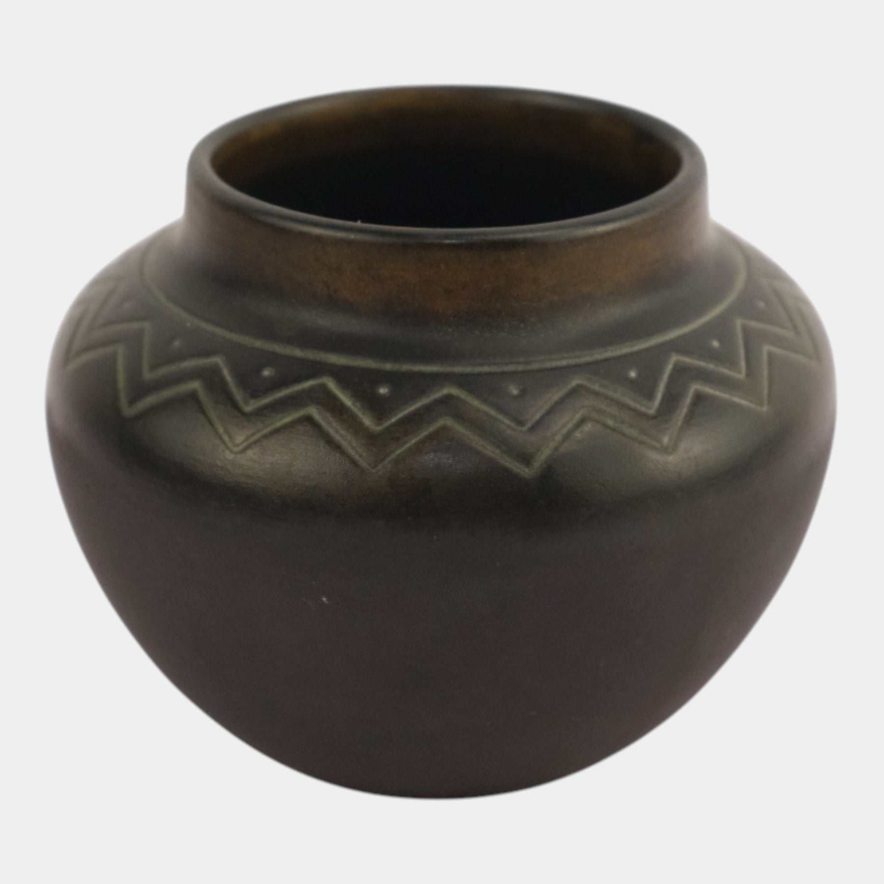 • Elegant Norse bronze ware vase featuring a rich, dark bronze surface with incised zigzag decoration around the shoulder. The subtle green highlights enhance its geometric motif, exemplifying the distinctive early 20th-century craftsmanship and refined Art Deco sensibility of Norse pottery.