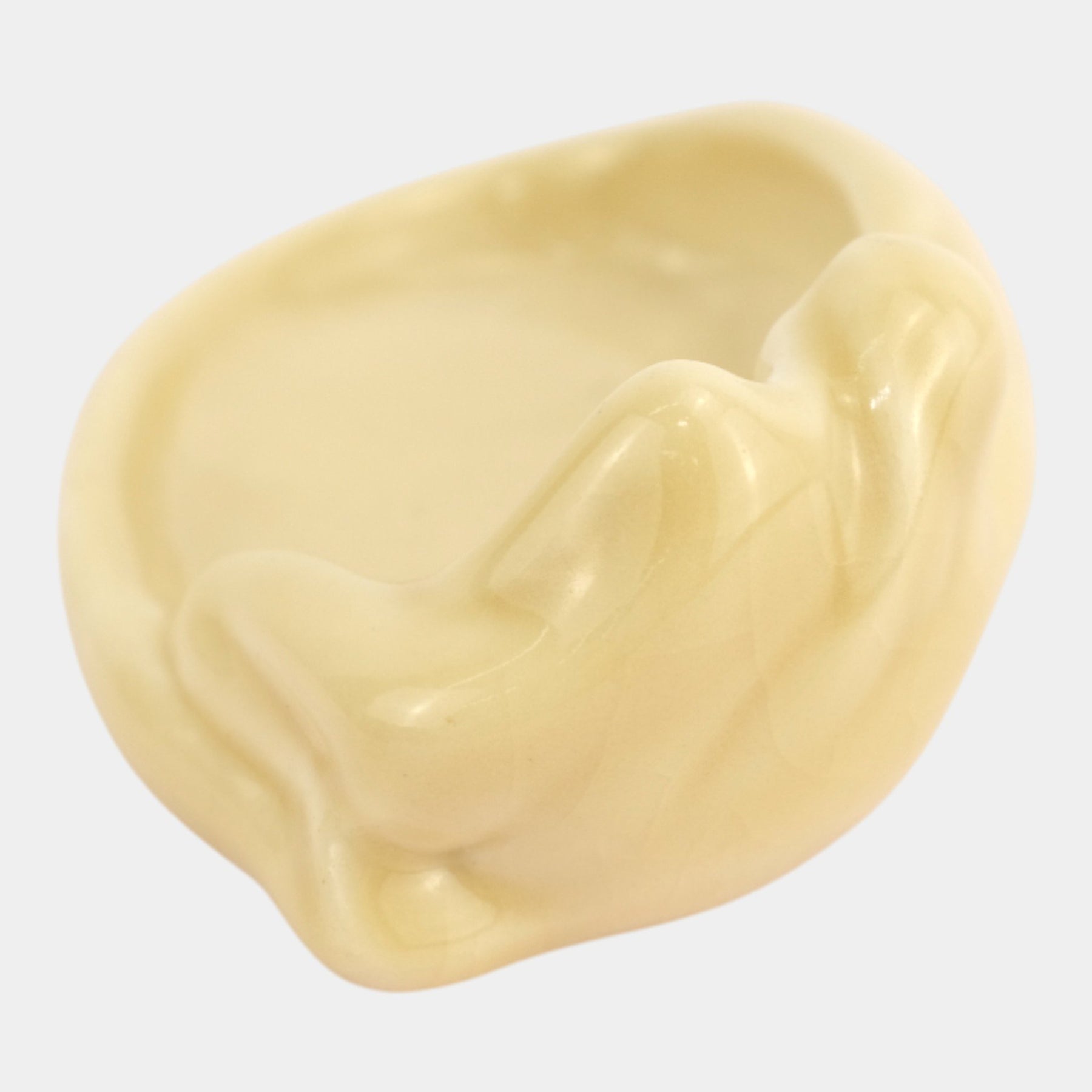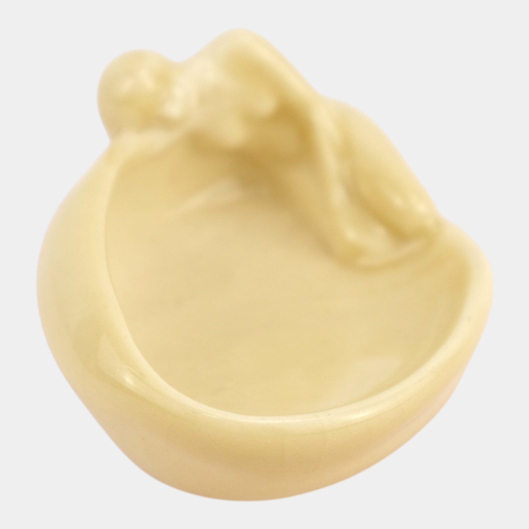 • Rookwood Pottery bowl featuring a kneeling nude figure gracefully integrated into the rim. Finished in a soft ivory glaze, this elegant Art Deco design highlights Rookwood’s mastery of sculptural form and subtle glaze work.