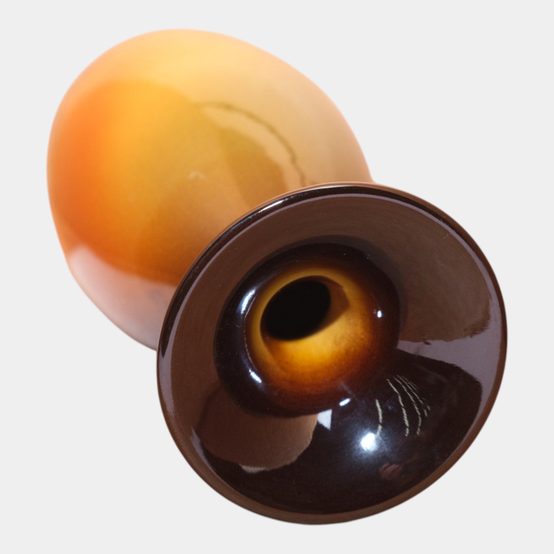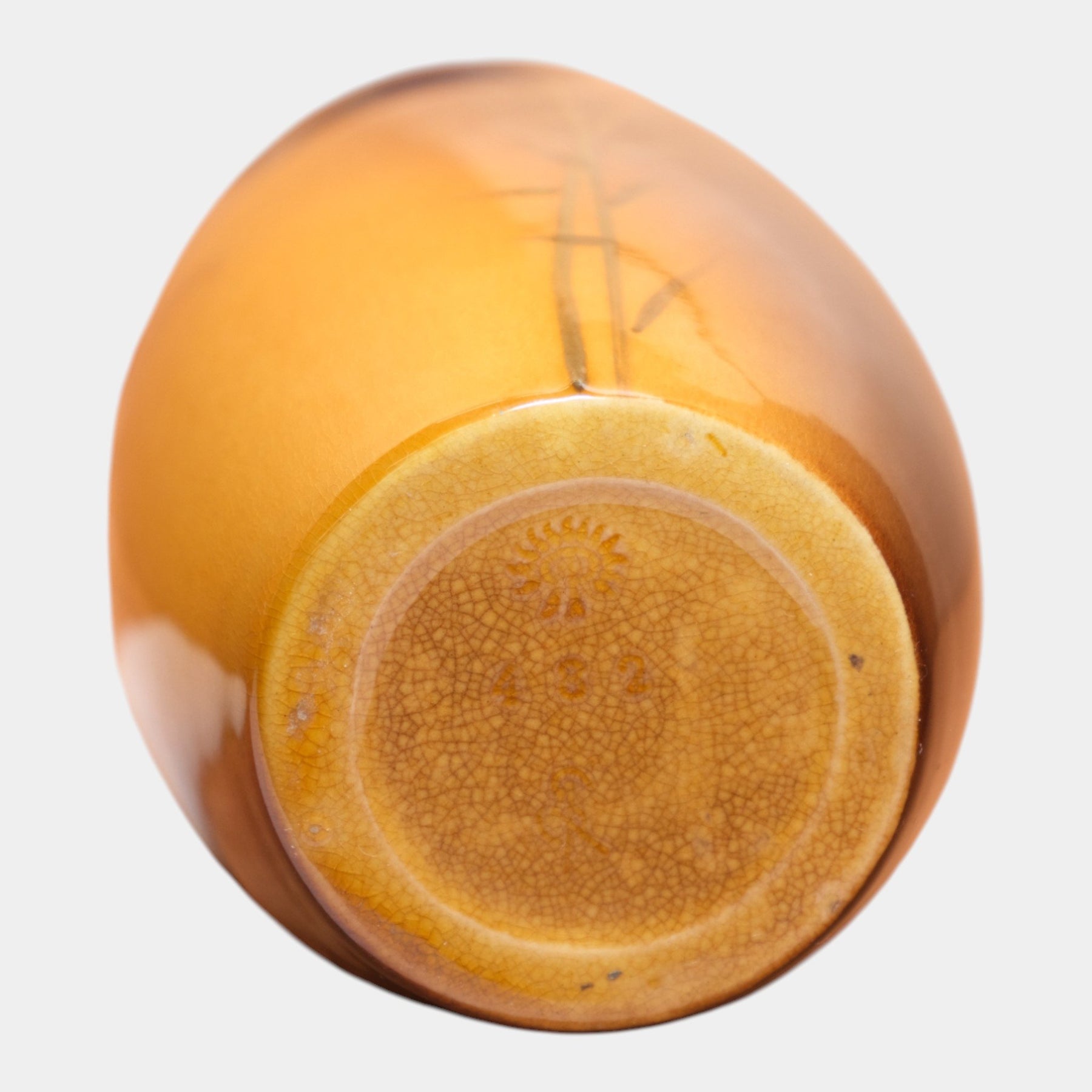 • This slender Rookwood vase features soft brown-to-amber shading with delicate hand-painted golden blossoms. Its elegant, elongated form showcases refined early Rookwood craftsmanship. Decorated by Sara Sax in 1898.