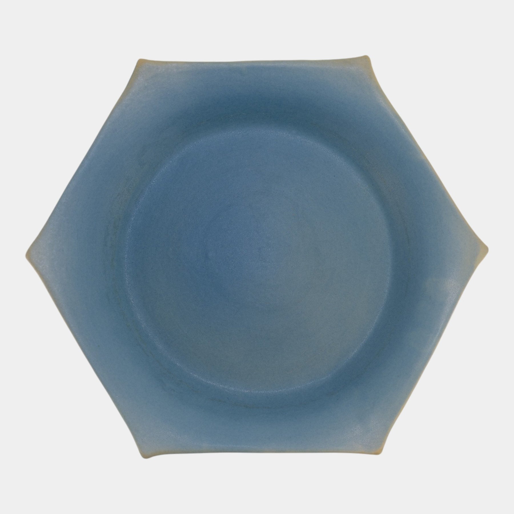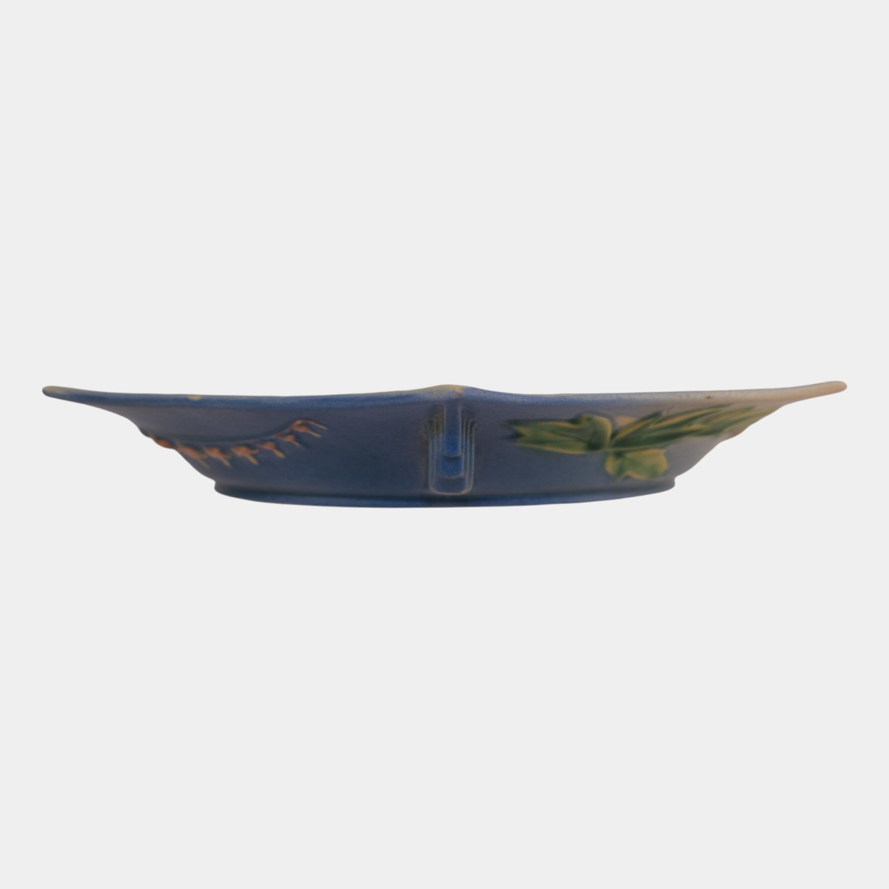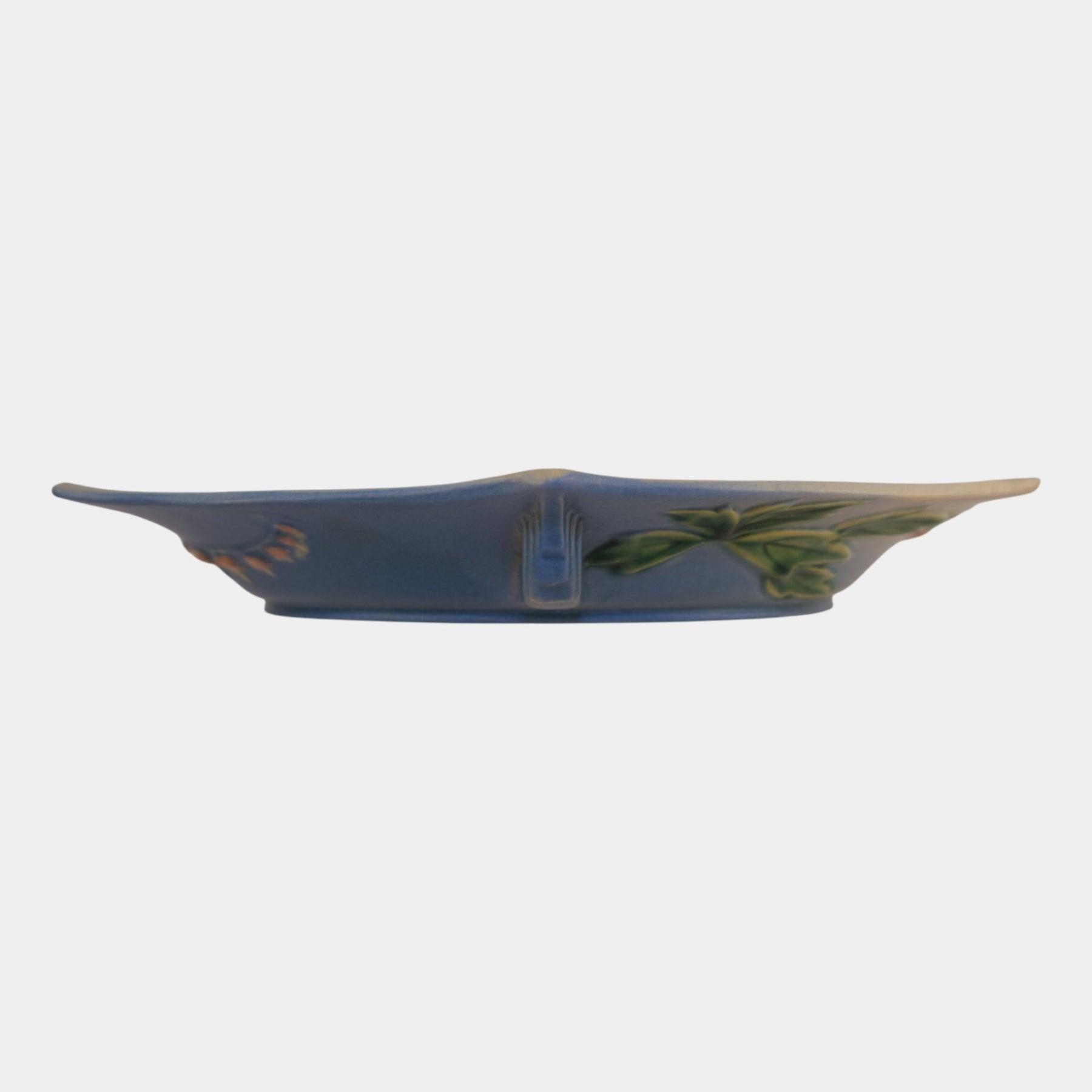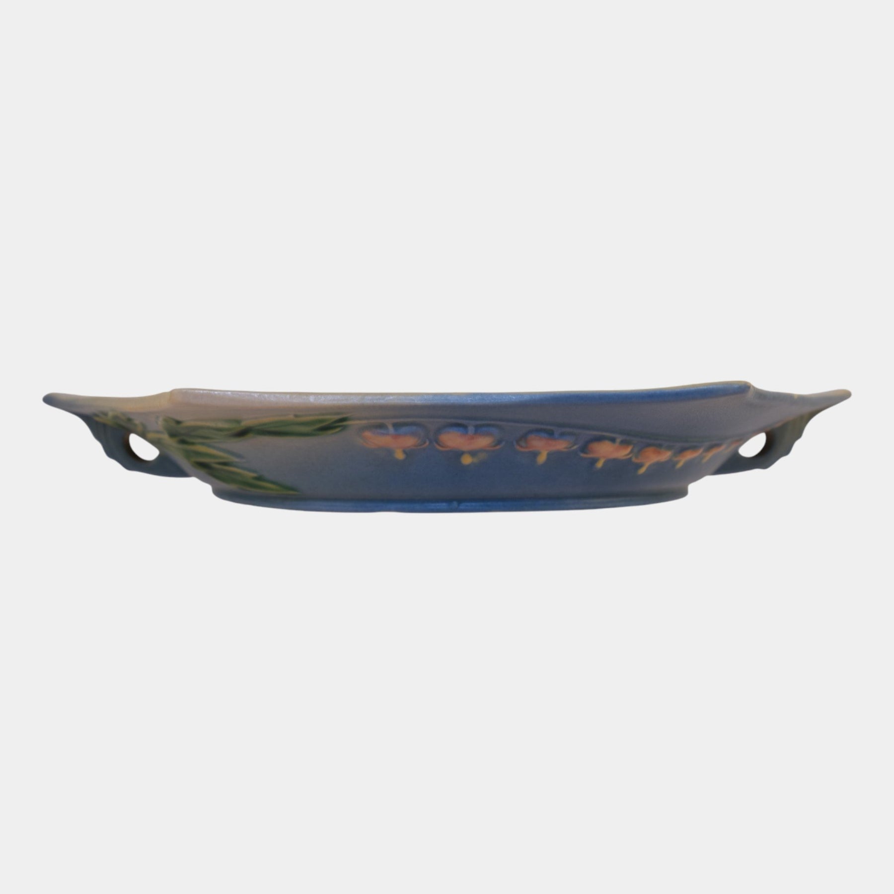 • This bowl is finished in a matte blue glaze and decorated with trailing pink bleeding heart blossoms and soft green foliage. The long, shallow form is accented with pierced side handles and a gently scalloped rim, blending utility with Roseville’s naturalistic floral design.