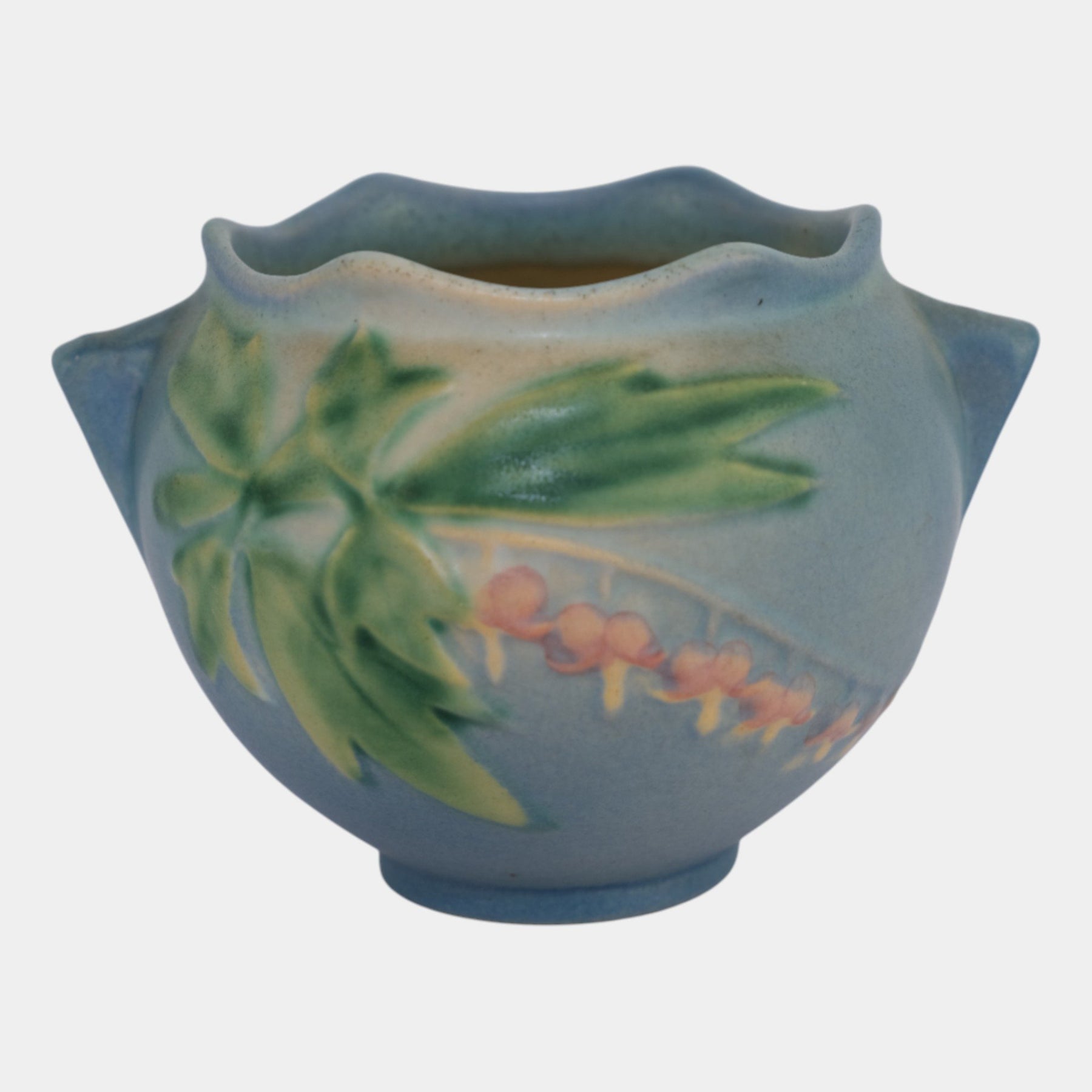• This Roseville Pottery vase is finished in a soft matte blue glaze with sculpted bleeding heart blossoms trailing across the body. Delicate pink flowers and green foliage flow in graceful arcs, accented by a scalloped rim and subtle side handles that complete the elegant form.