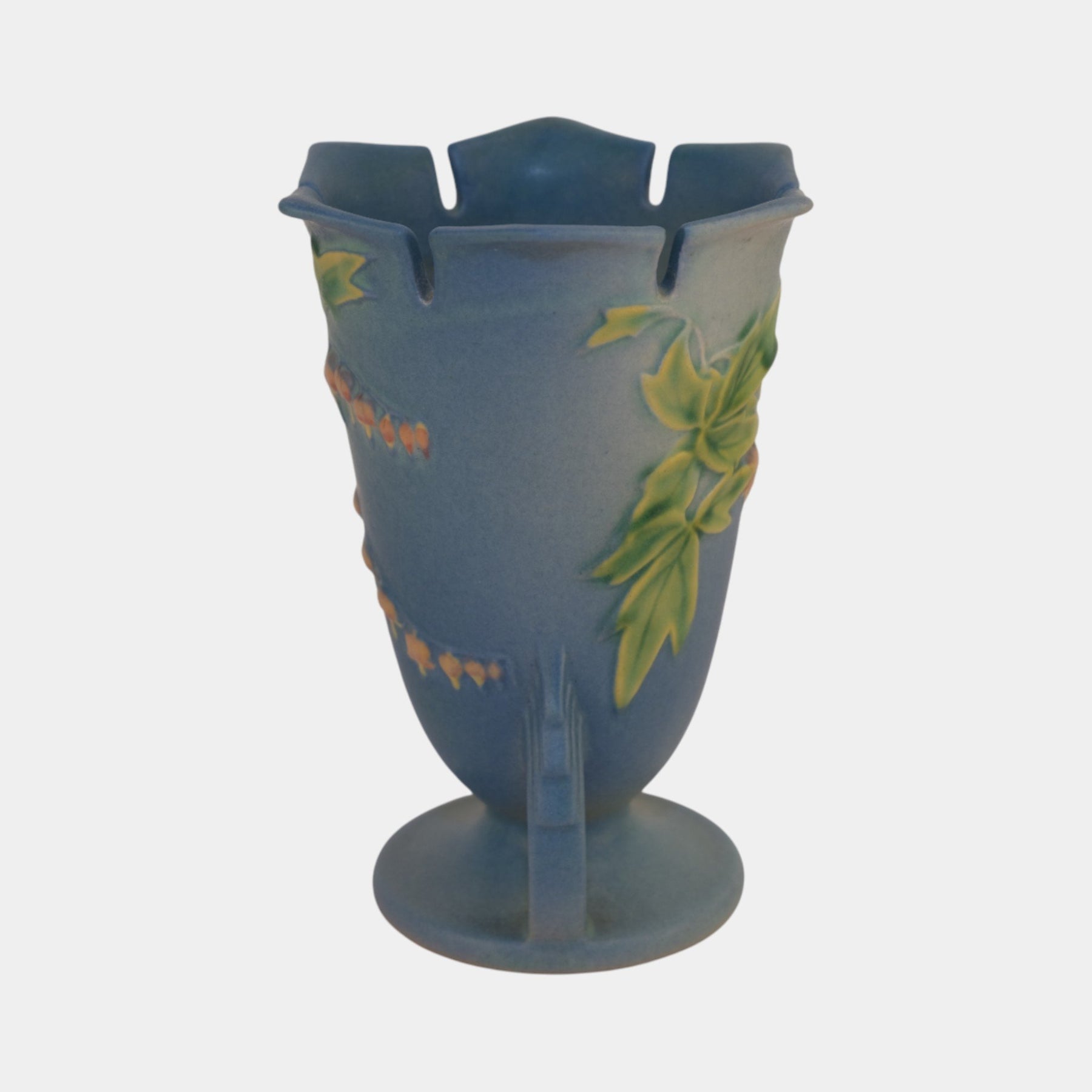 • Finished in soft blue with sculpted trailing pink and green bleeding heart blossoms along the body, this flaring rim, pedestal base, and double handles create a graceful silhouette, highlighting Roseville’s mastery of naturalistic floral design.