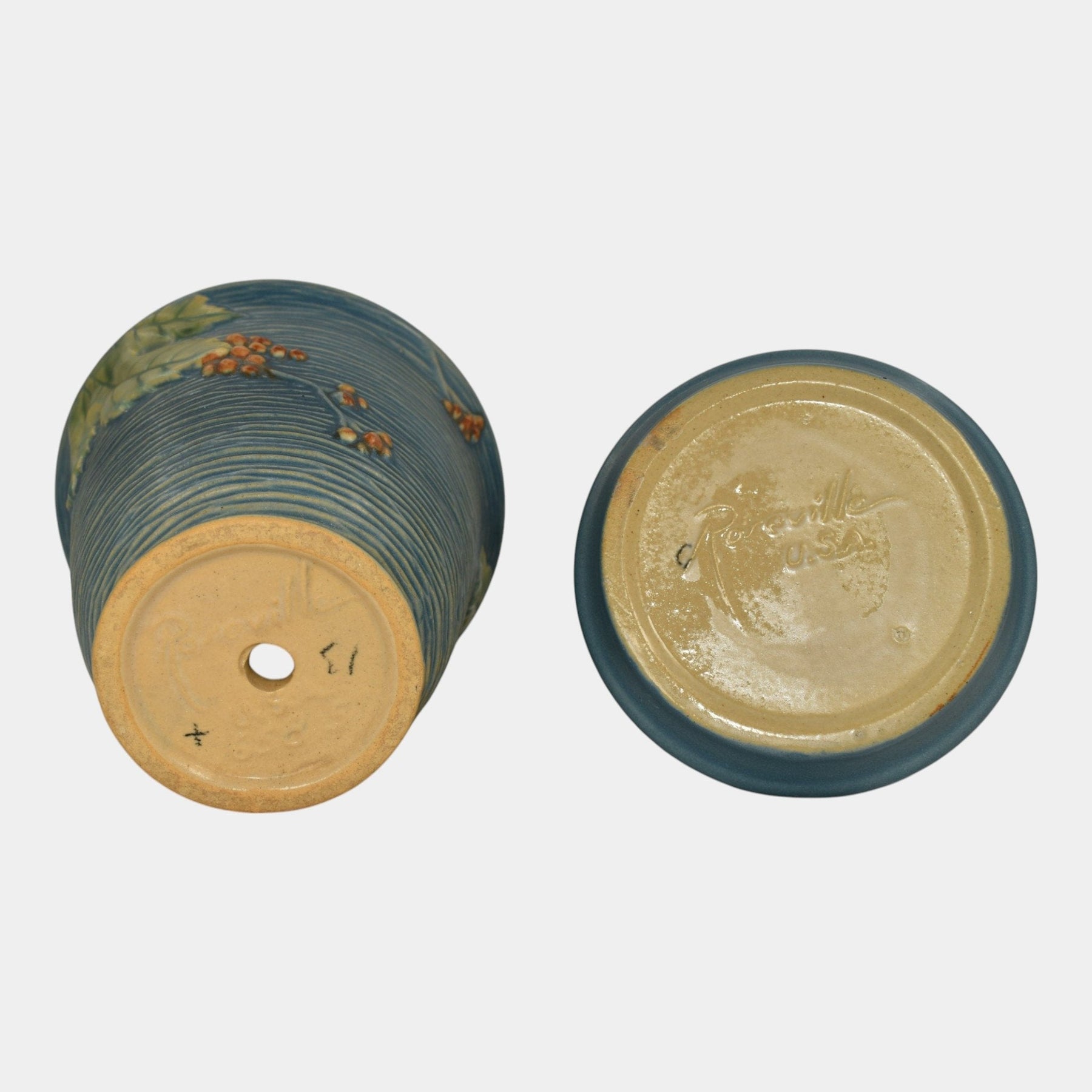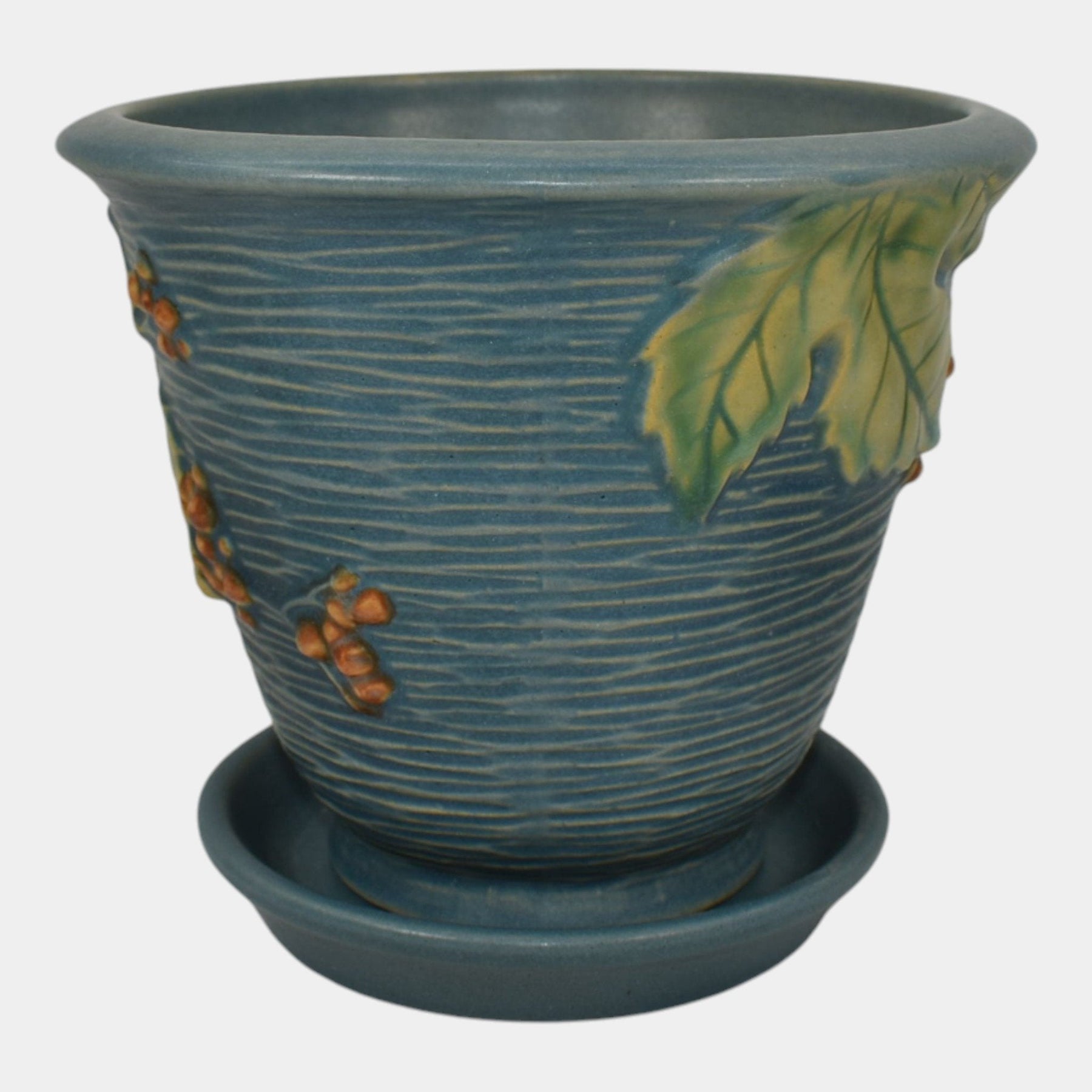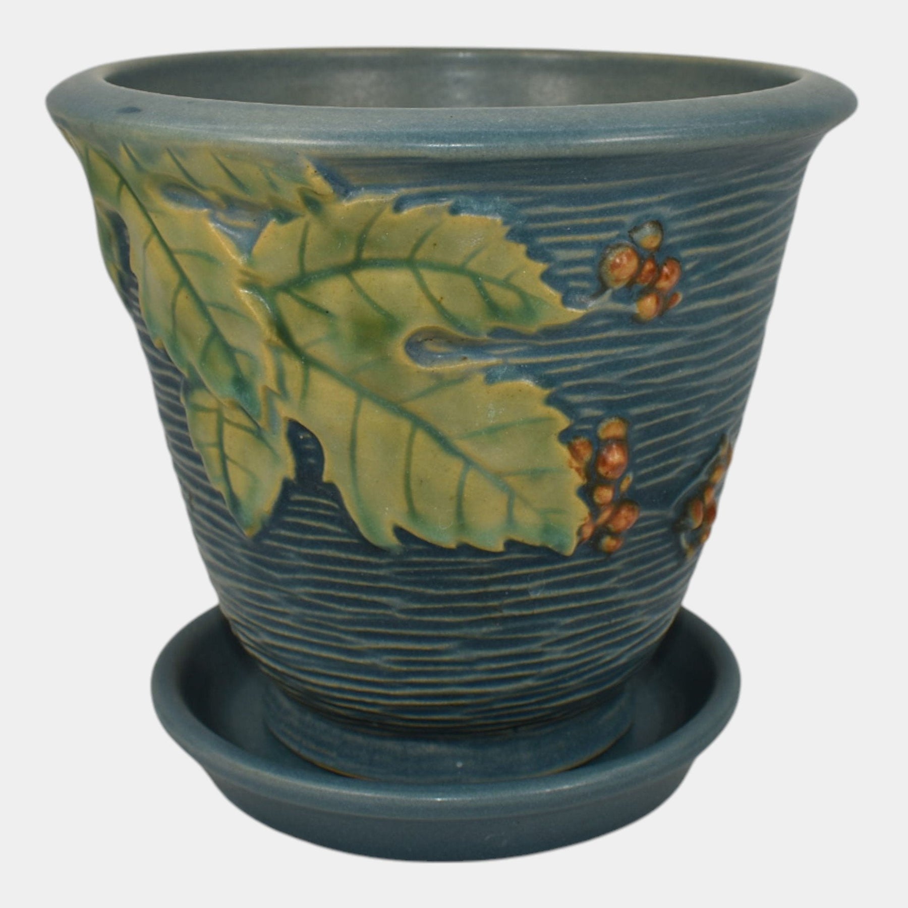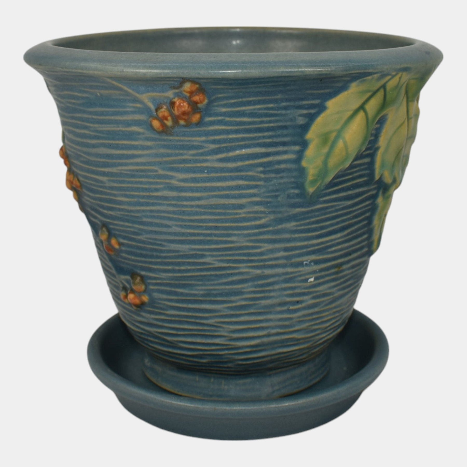 • Roseville Bushberry Blue 1941 Vintage Art Pottery Flower Pot And Saucer 658-5