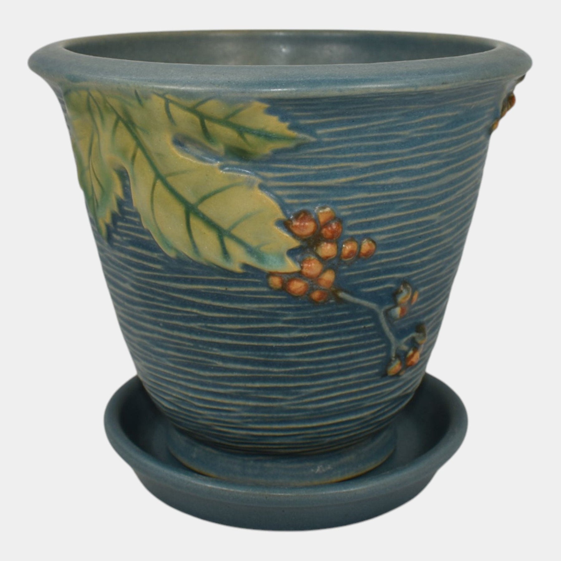 Roseville Bushberry Blue 1941 Vintage Art Pottery Flower Pot And Saucer 658-5