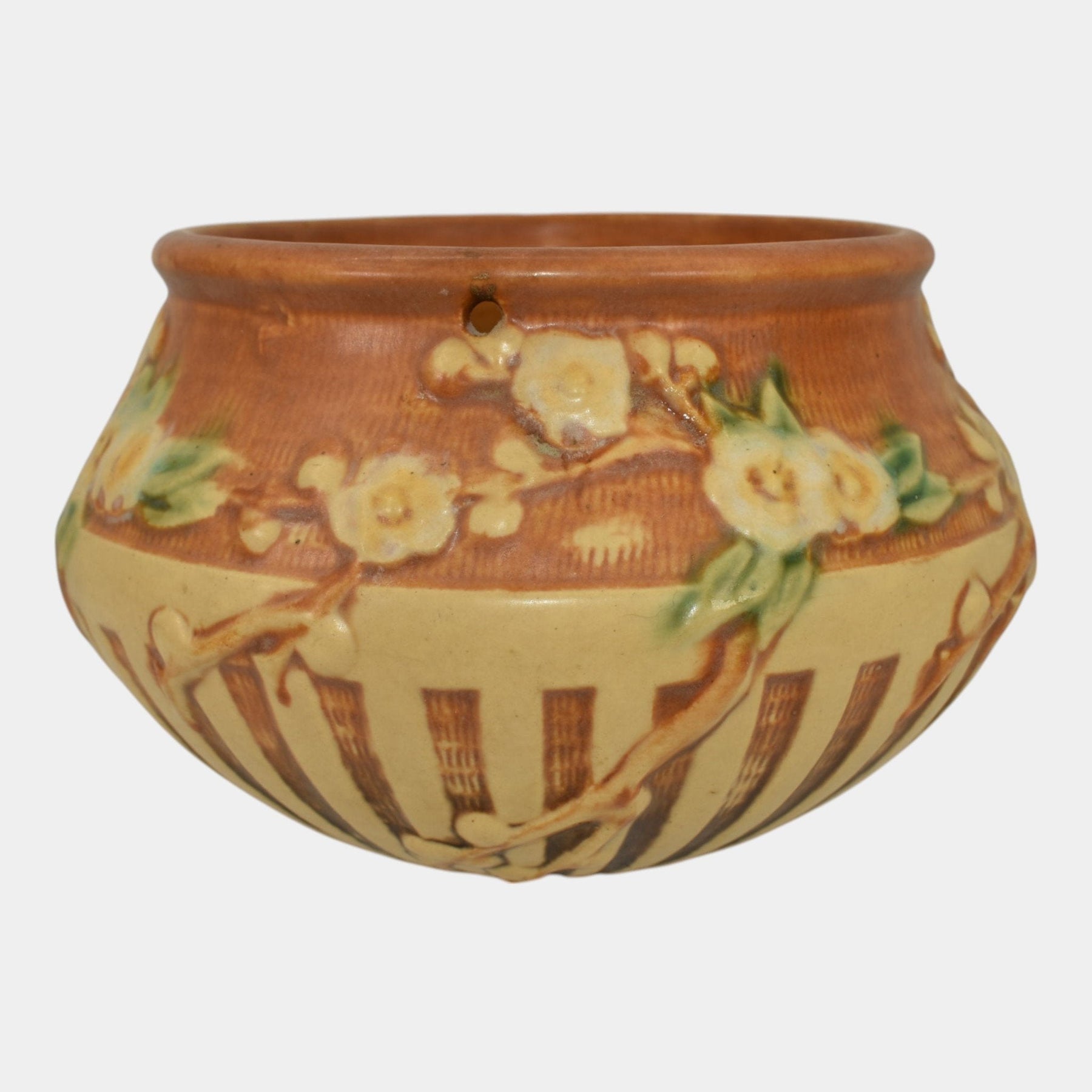 • Roseville Cherry Blossom 1933 Vintage Pottery Brown Hanging Basket Planter 350-5