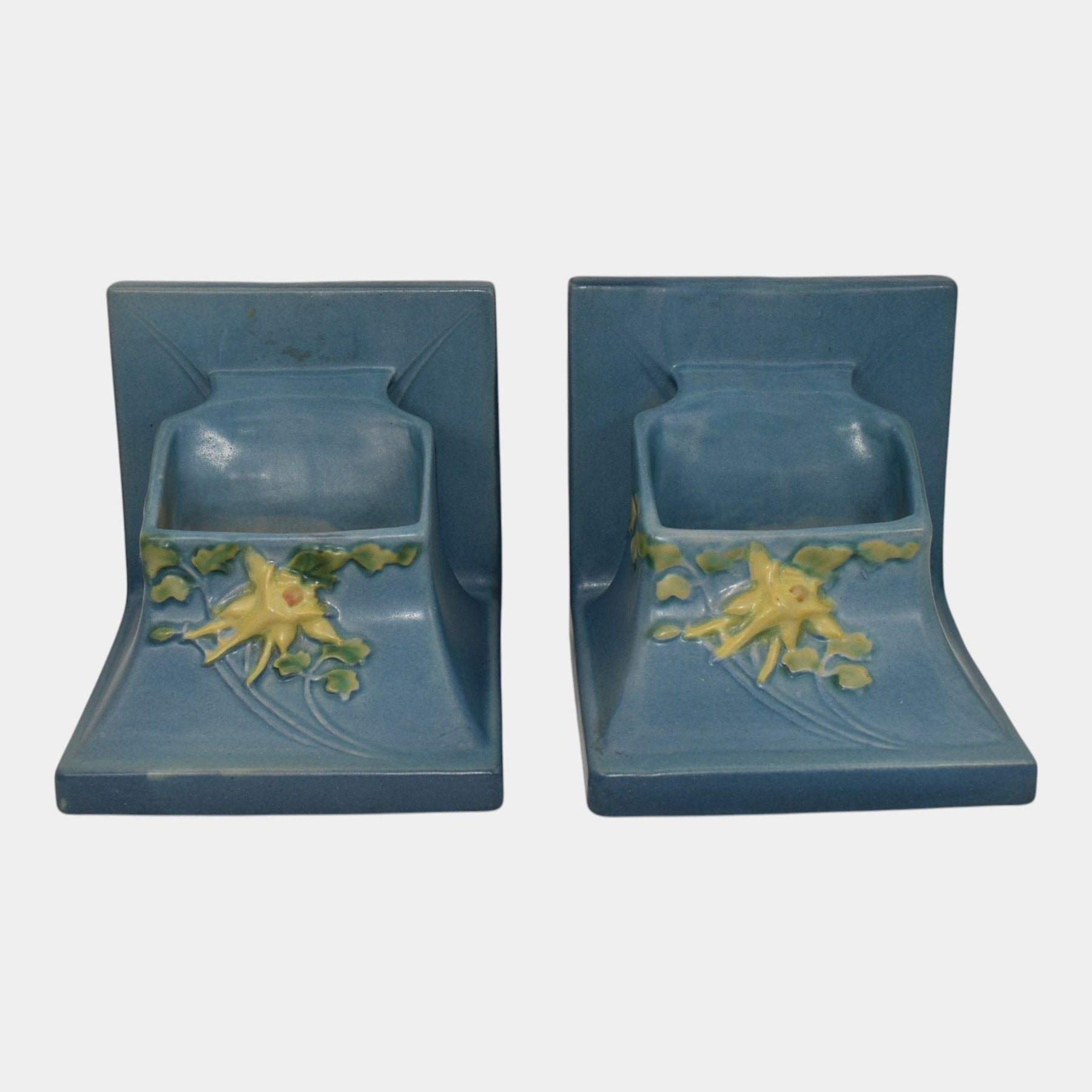 • Roseville Columbine Blue 1941 Vintage Art Pottery Planter Bookends 8