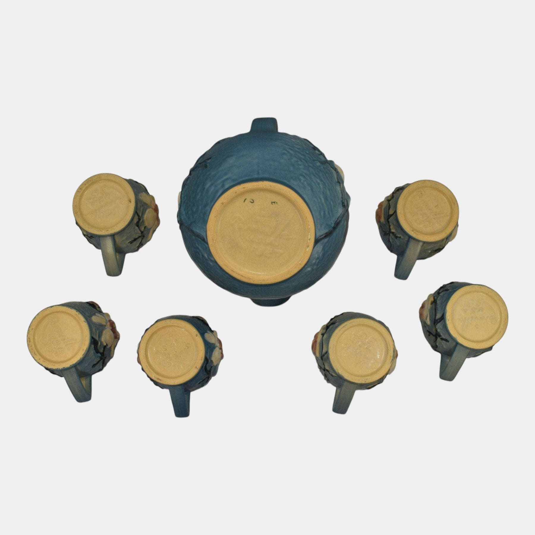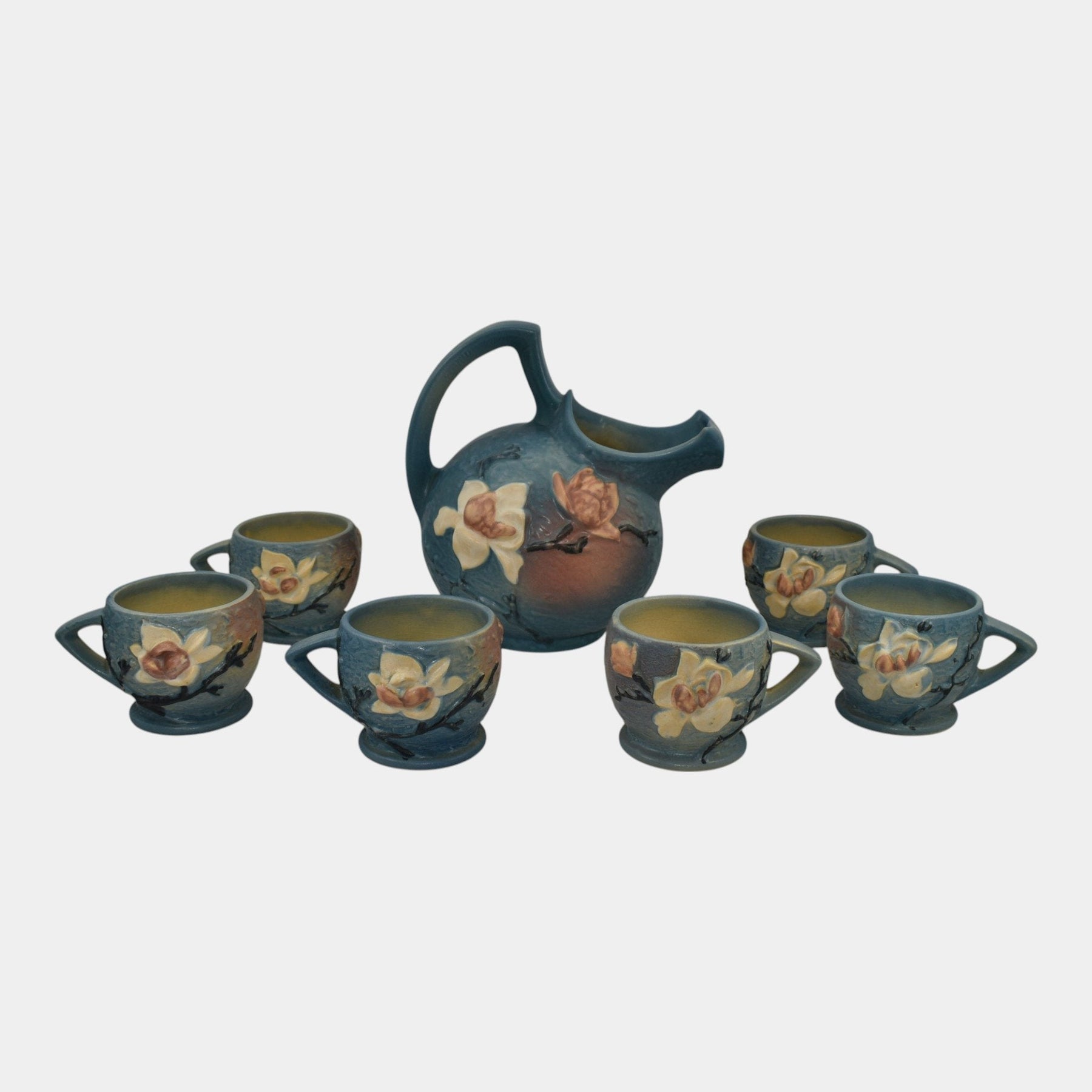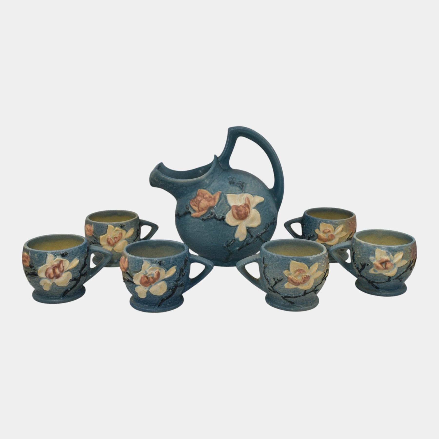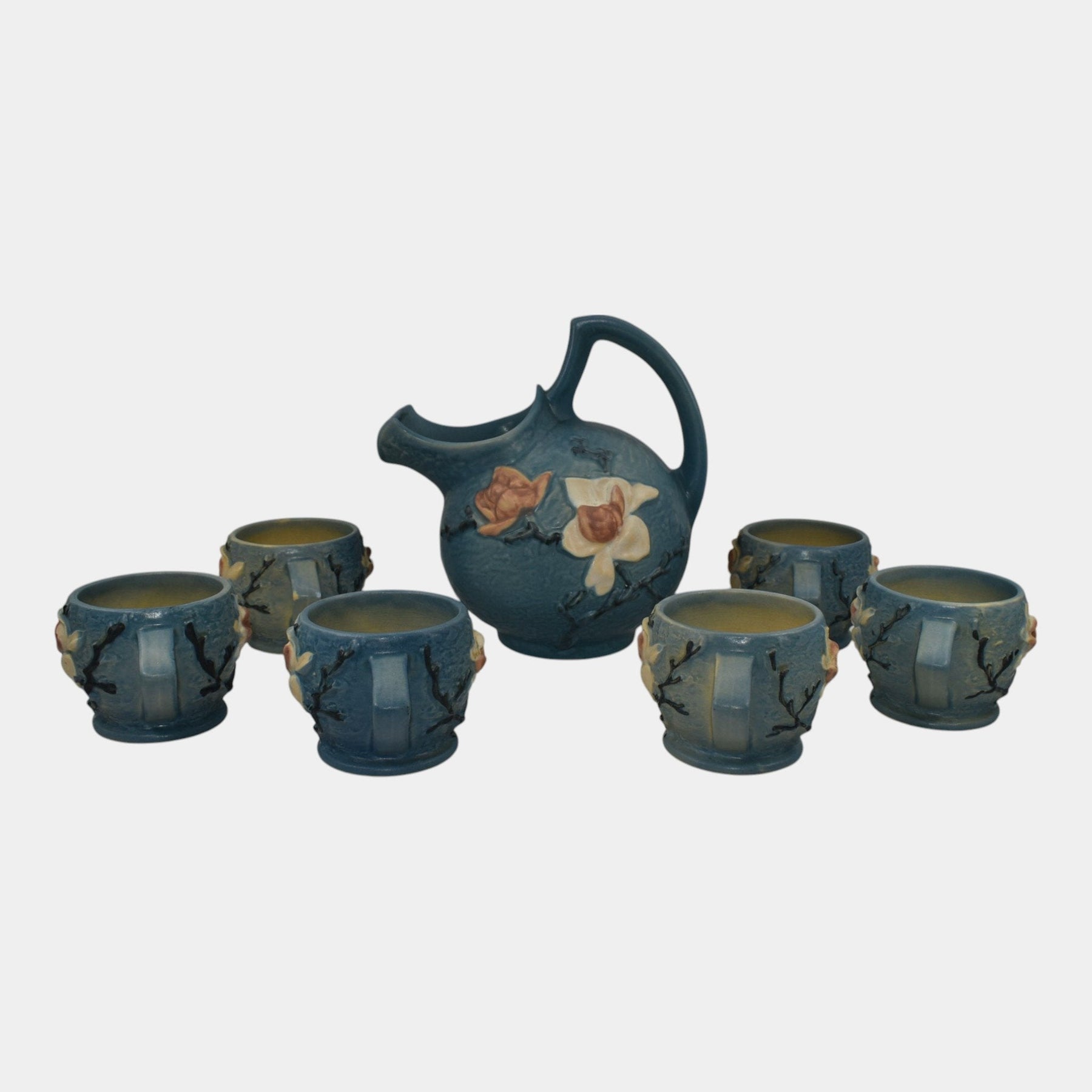 • Roseville Magnolia Blue 1943 Vintage Pottery Cider Pitcher 1327 And Mugs 3-3