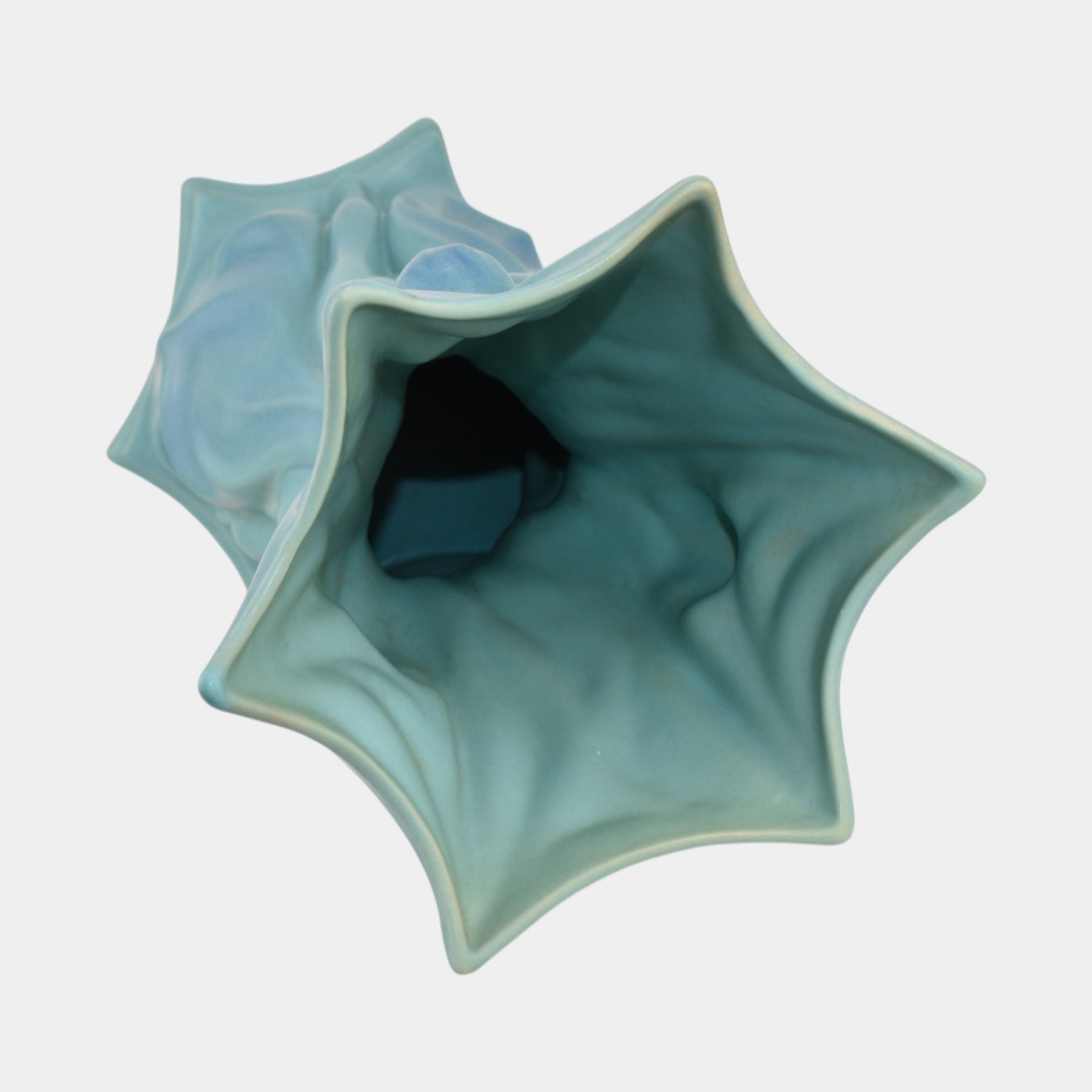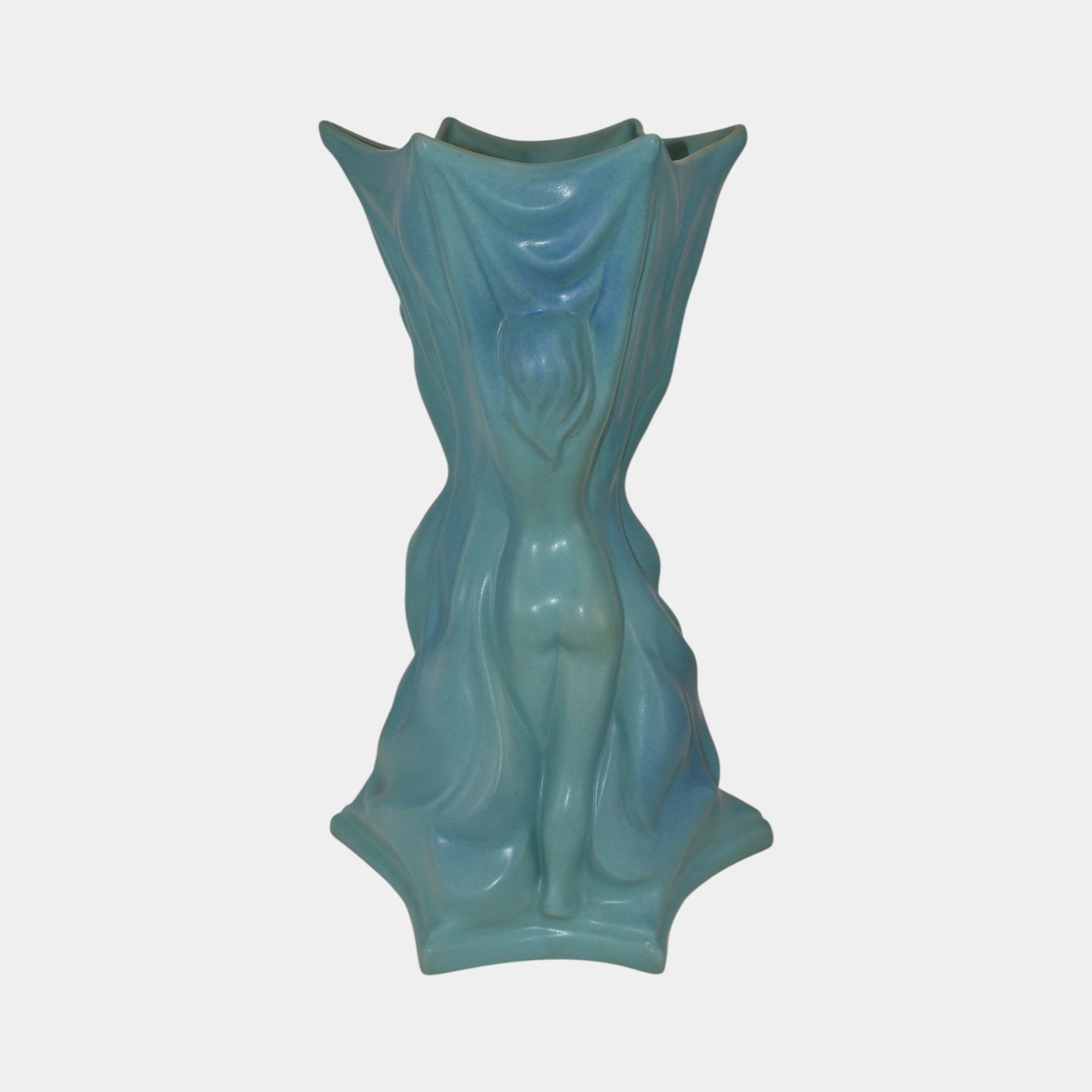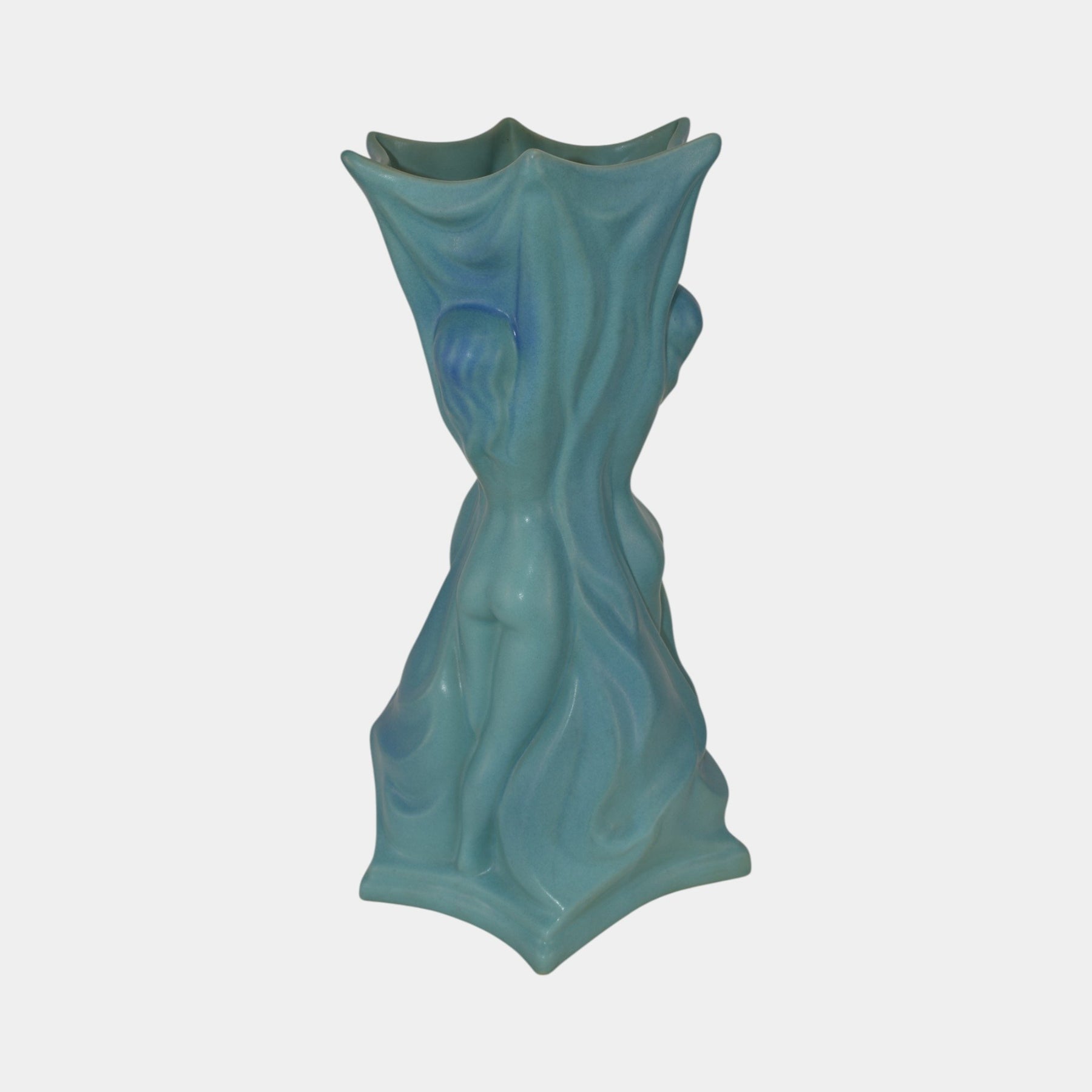 • Elegant and sculptural Van Briggle floor vase featuring the iconic "Three Graces" design in a soft two-tone blue glaze. A striking example of the studio’s figural artistry and craftsmanship.