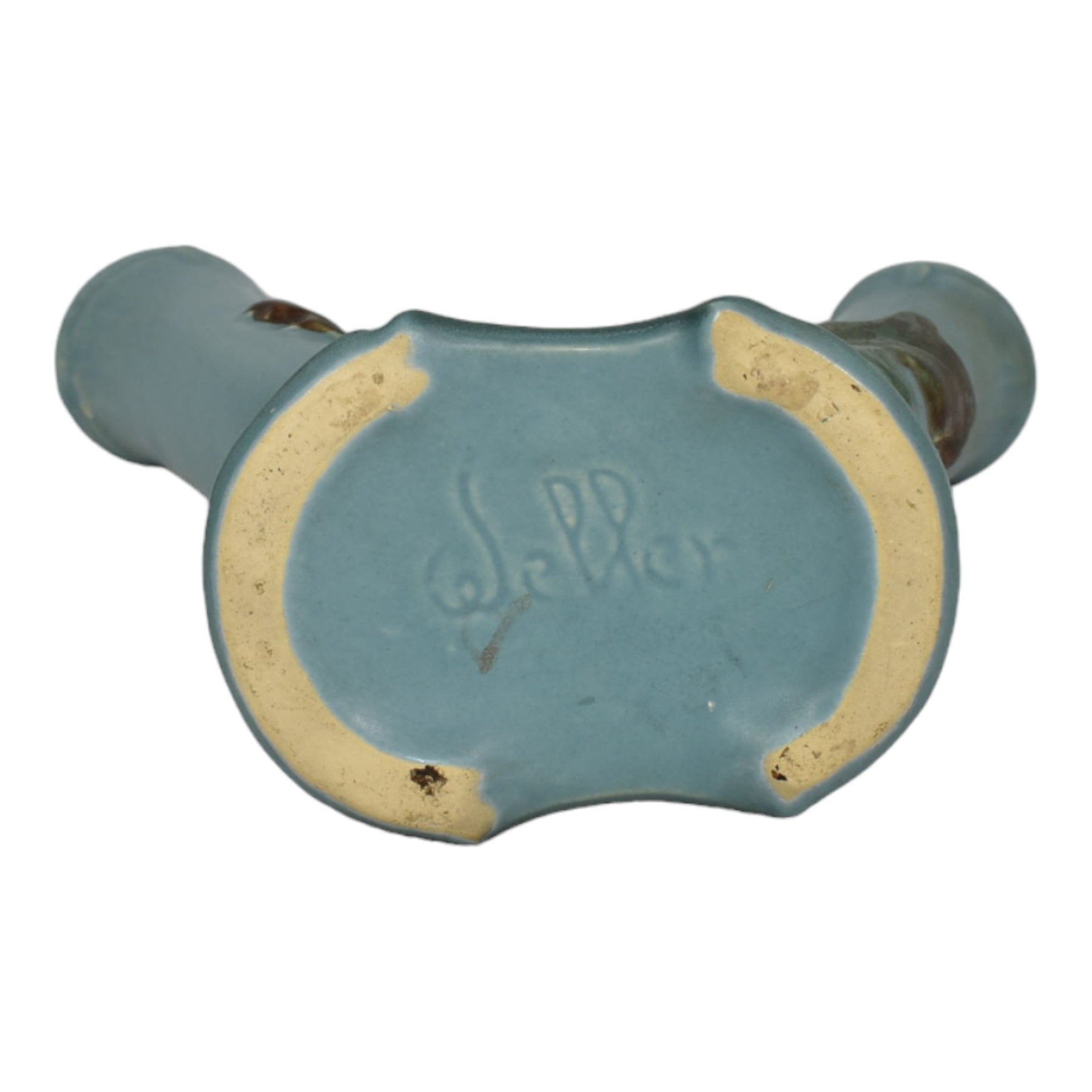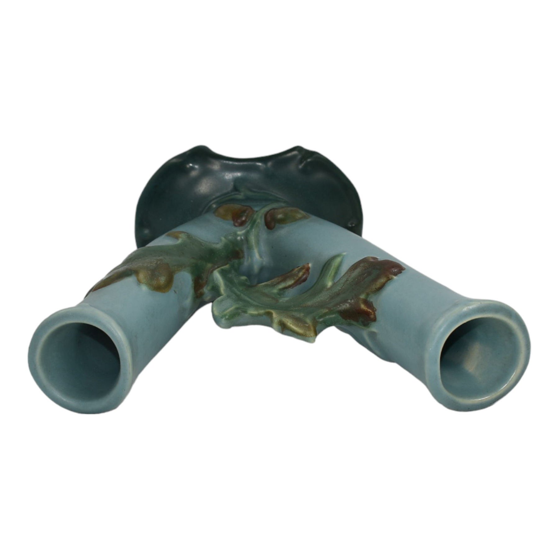 • Weller Oak Leaf 1930s Vintage Art Deco Pottery Blue Ceramic Double Bud Vase