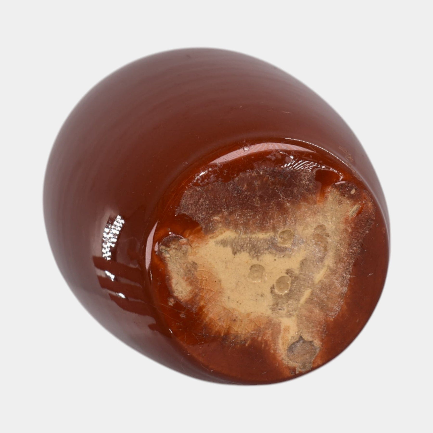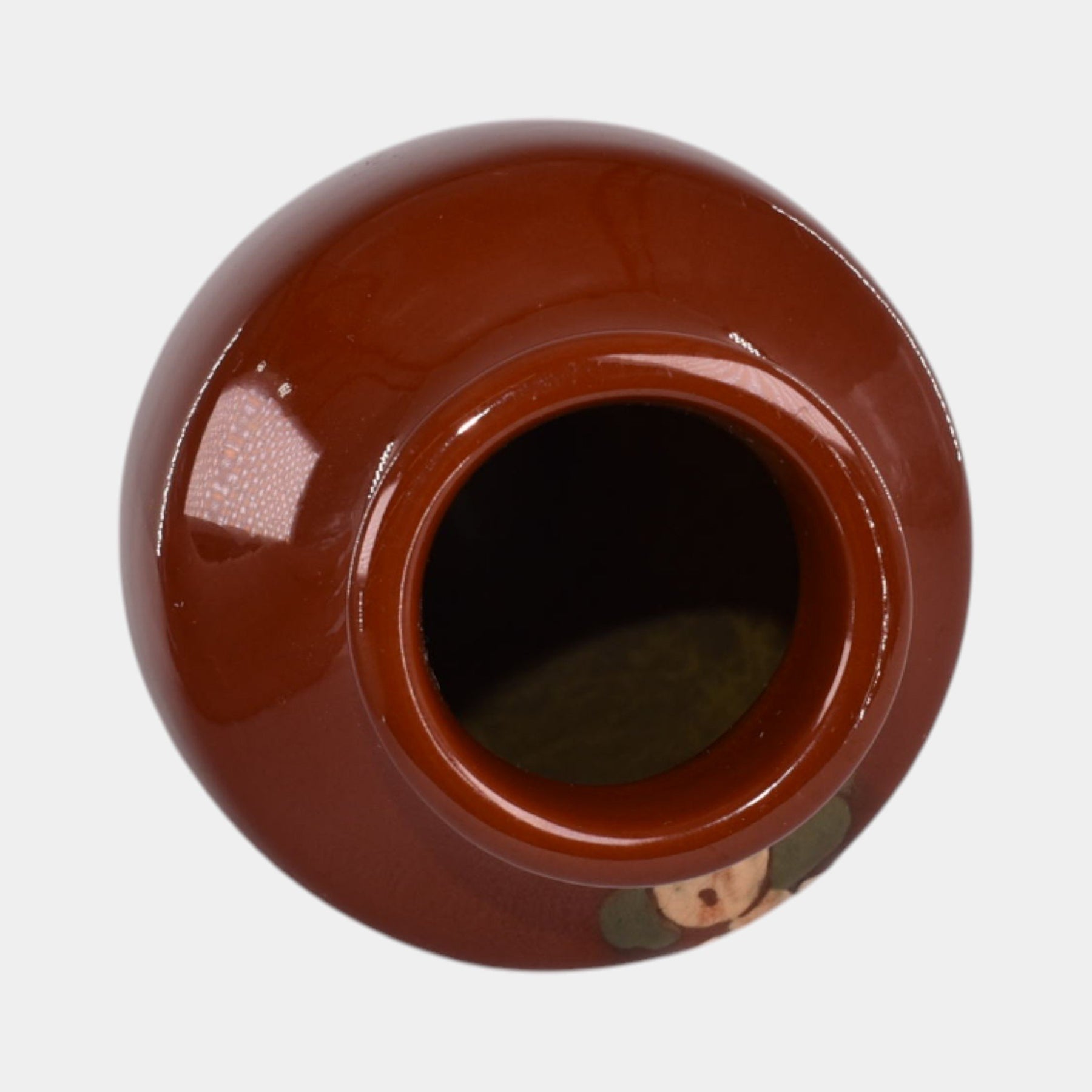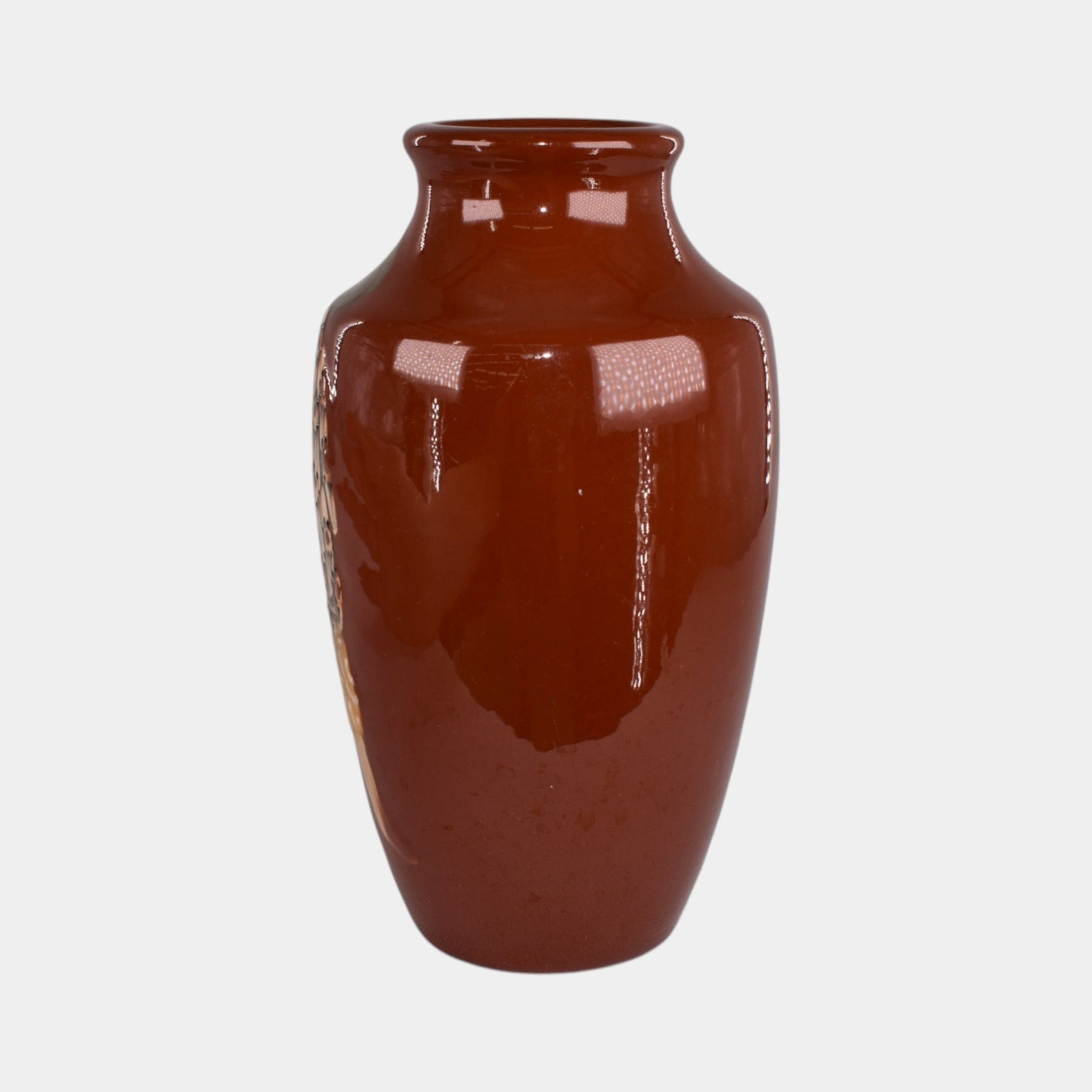 • Weller Pottery Rhead Faience Birdimal Oriental Woman Vase 98 This rare Weller Faience vase from the Rhead-era “Birdimal” series features a charming hand-painted depiction of an Oriental woman in flowing patterned garments, rendered in warm earth-tone glazes. The deep reddish-brown ground beautifully frames the whimsical figure—an excellent example of Weller’s early 20th-century decorative artistry under Frederick Rhead’s direction.